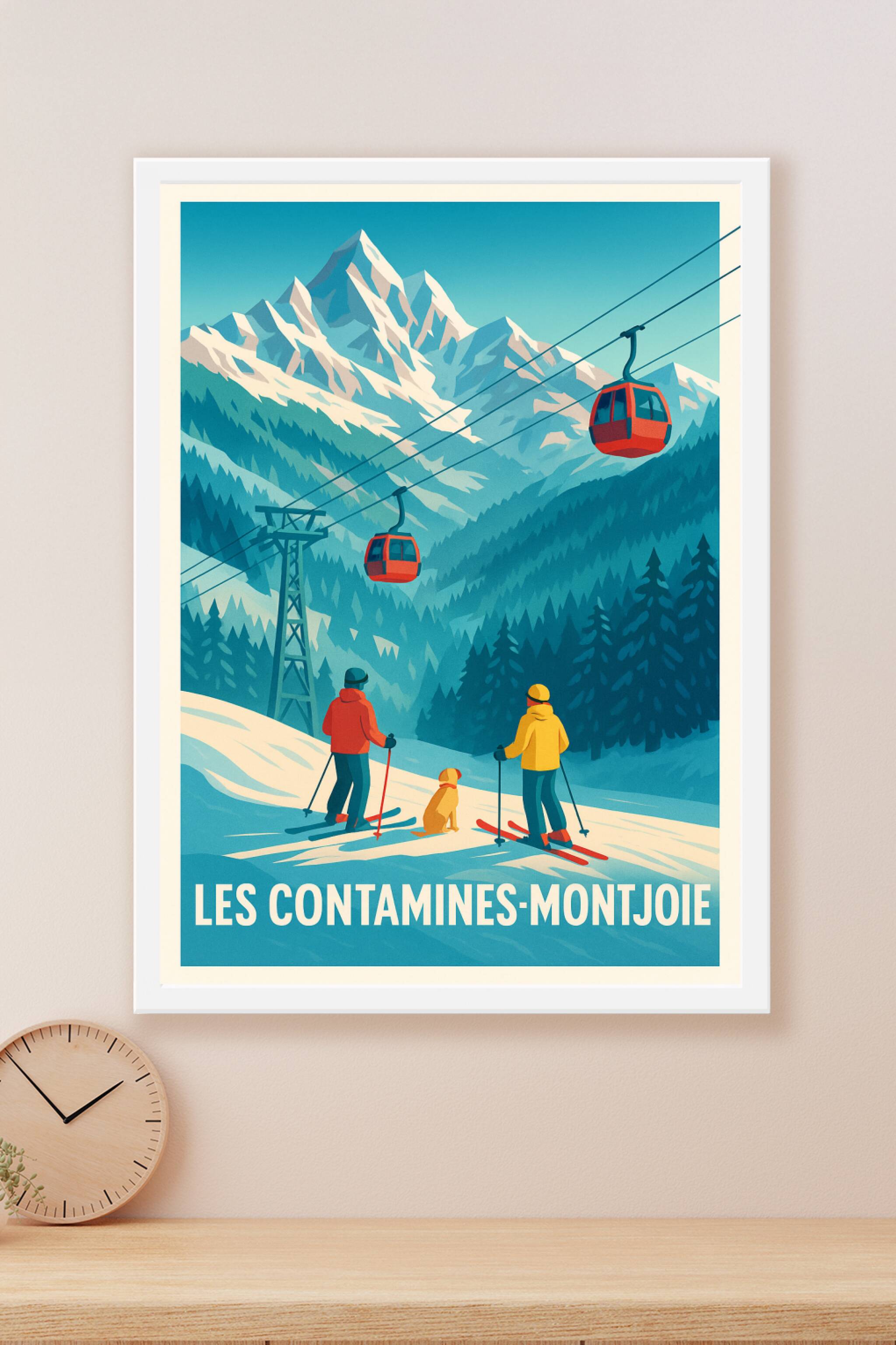Découvrez la magie des Alpes avec cette affiche vintage représentant Les Contamines-Montjoie, une destination prisée des amateurs de ski et de nature. Ce poster met en scène une scène paisible de skieurs prêts à dévaler les pistes sous un ciel bleu cristallin, surplombés par des montagnes majestueuses et des télécabines rouges typiques de la région.Cette affiche est imprimée en tirage "Fine Art" sur papier 305g coton, garantissant une qualité d'impression exceptionnelle et des couleurs éclatantes qui apportent une touche authentique à votre décoration intérieure. Disponible en formats variés de A1 à A4, avec ou sans cadre, ce poster est idéal pour habiller vos murs et faire vivre l'esprit montagnard dans votre maison ou bureau. Profitez d'une fabrication 100% française pour un rendu premium qui séduira les passionnés de montagne et d'aventure.