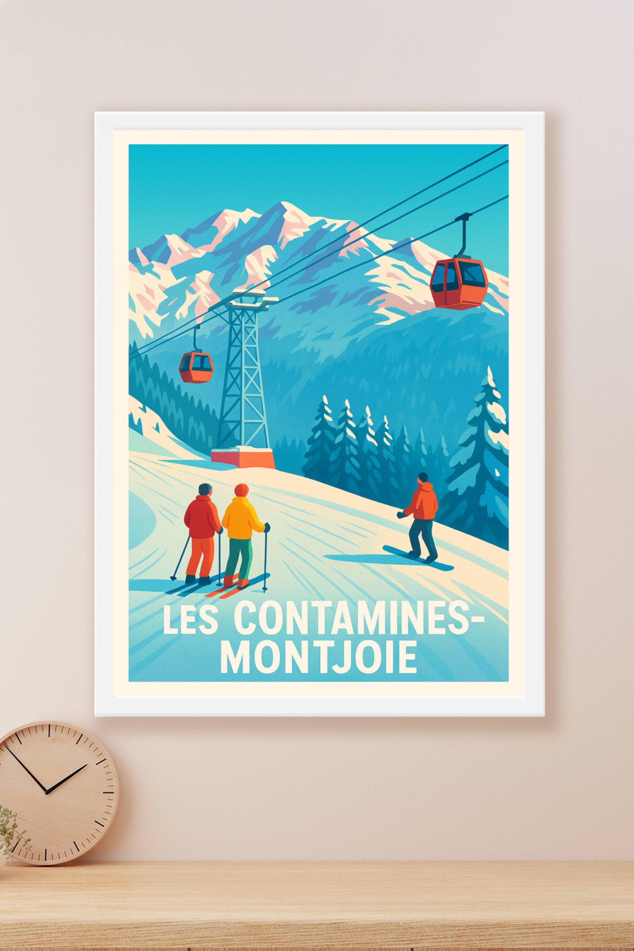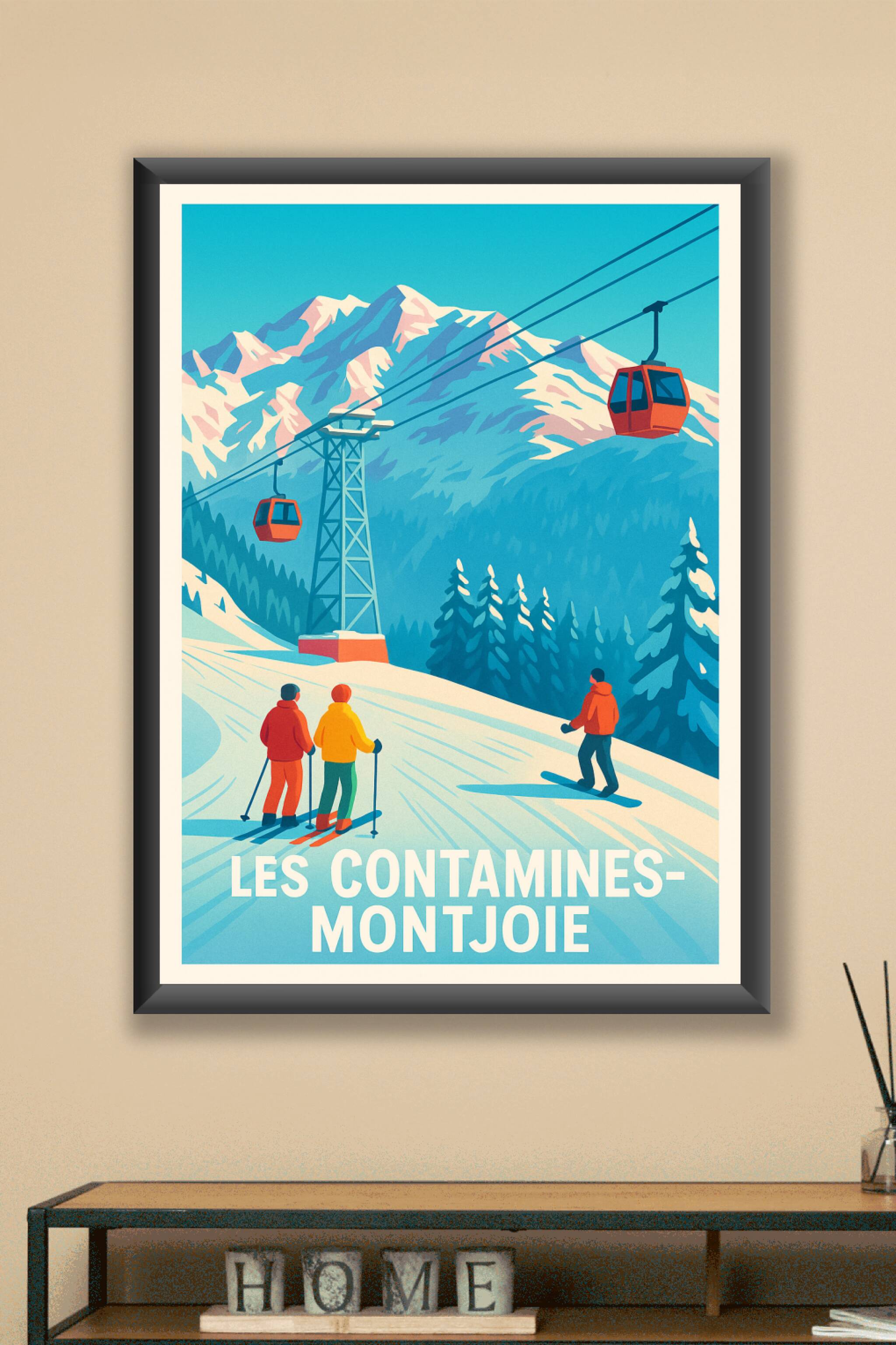 Découvrez le charme hivernal des Contamines-Montjoie avec cette affiche au style vintage qui capture parfaitement l'ambiance chaleureuse des Alpes ...