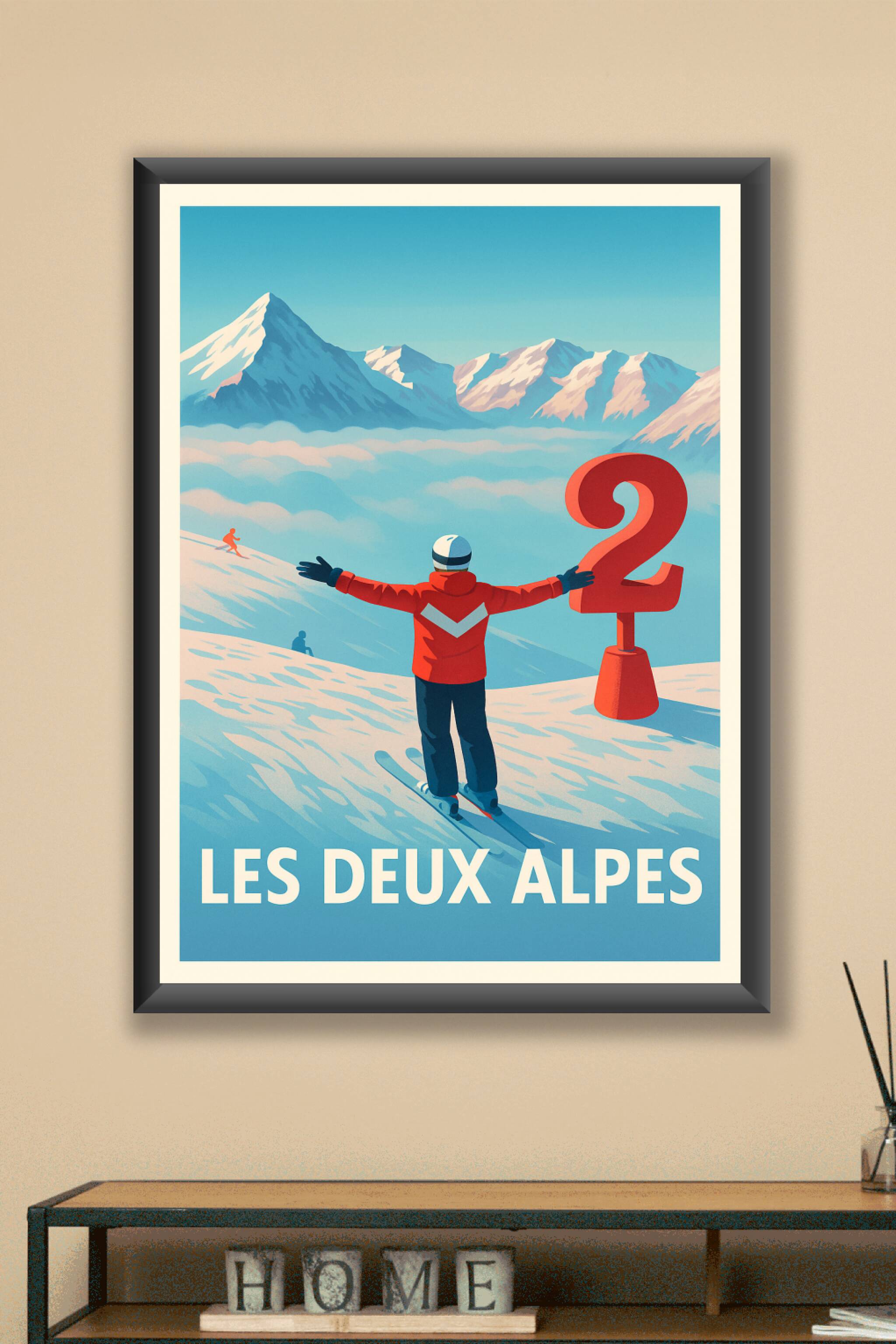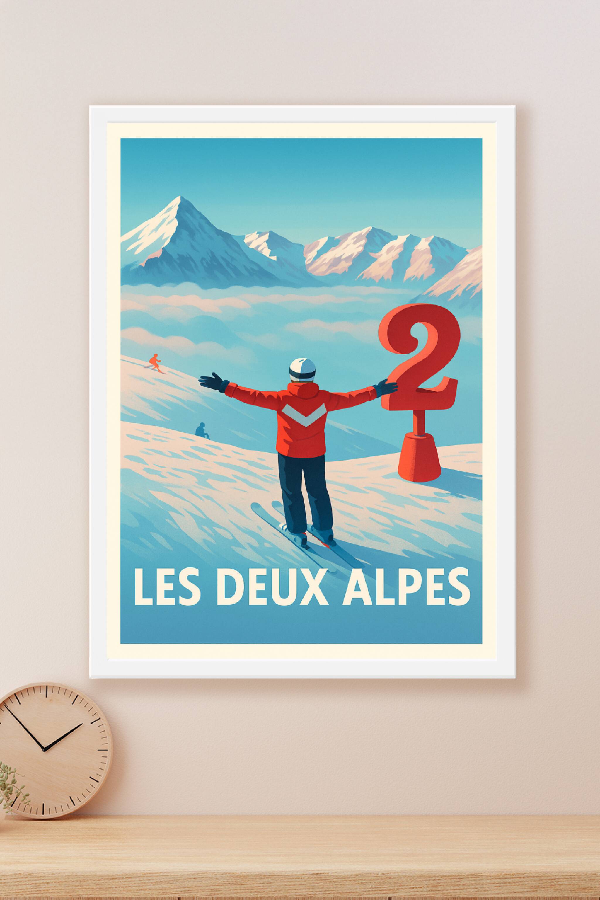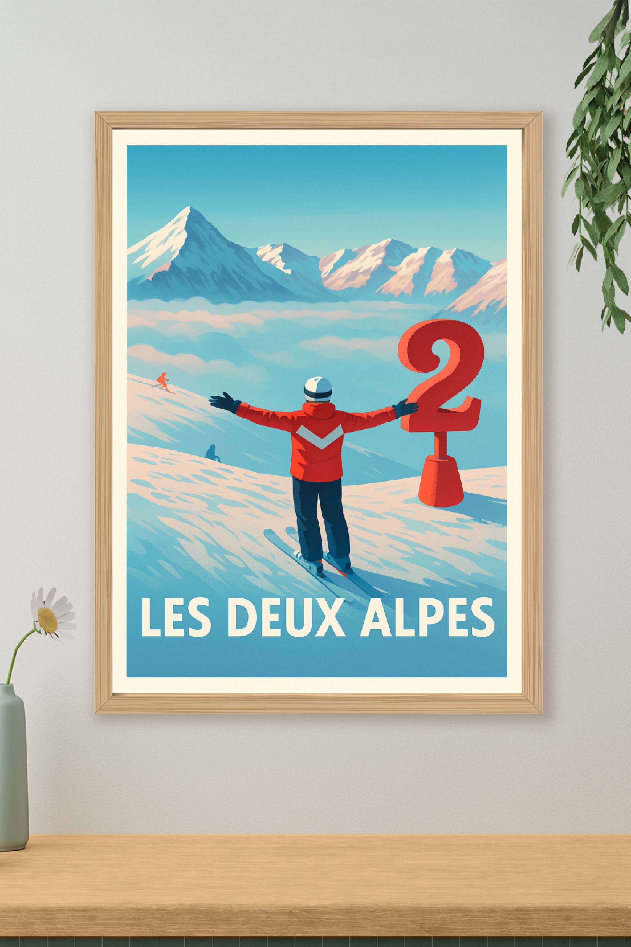 Découvrez l'univers enneigé et grandiose des Deux Alpes avec cette affiche vintage mettant en scène un skieur contemplant les sommets majestueux. Ce poster au style rétro évoque l'appel de la montagne, parfait pour tous les amateurs de sports d'hiver et de paysages alpins. Imprimé en tirage "Fine Art" sur papier coton 305g, ce poster de qualité supérieure garantit des couleurs éclatantes et une durabilité exceptionnelle. Disponible en formats A1 à A4, avec ou sans cadre, cette affiche s'adapte à tous les espaces pour décorer votre intérieur avec authenticité et charme montagnard. Profitez d'une impression premium 100% fabriquée en France pour un cadeau ou une décoration unique.
