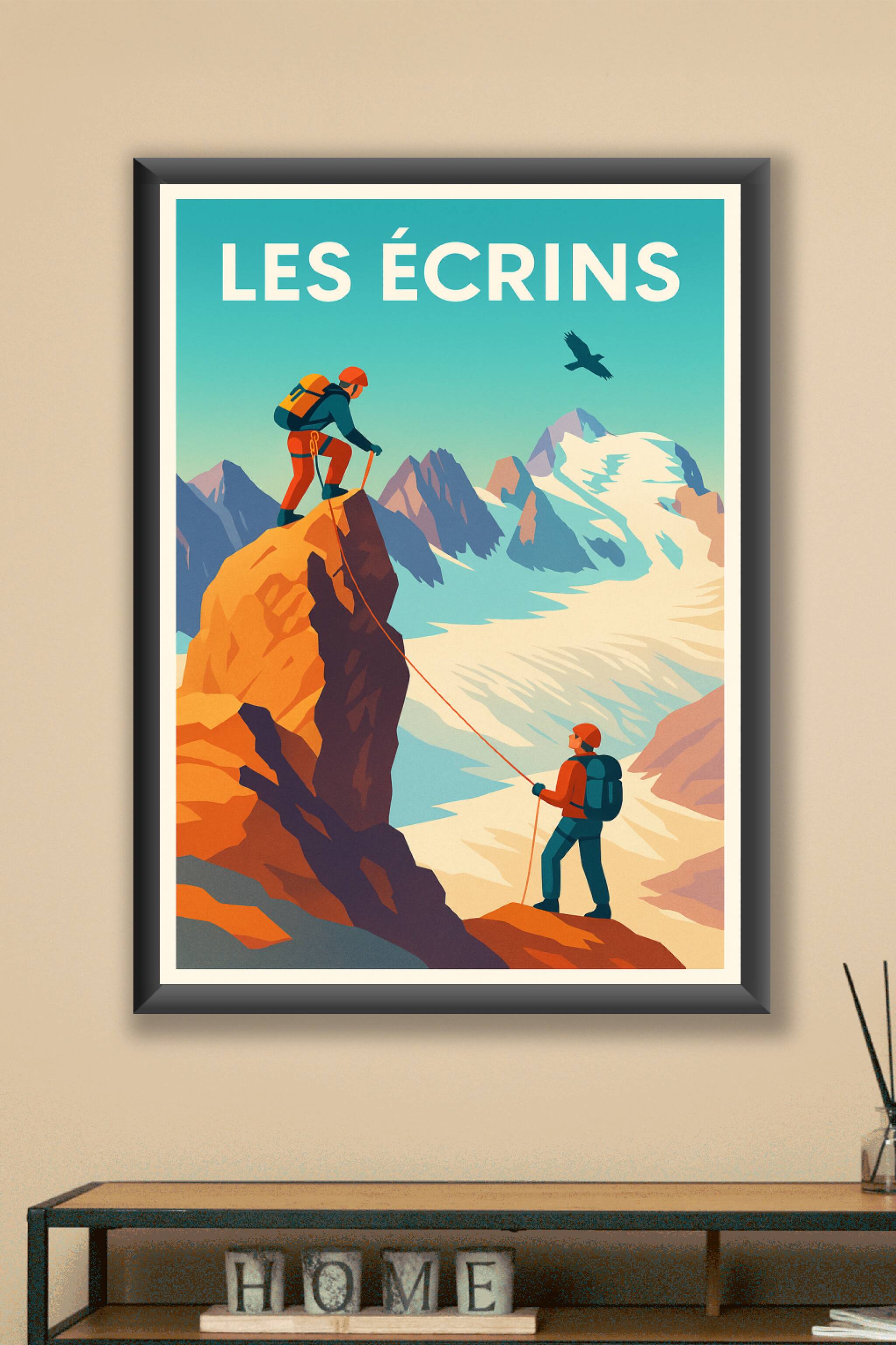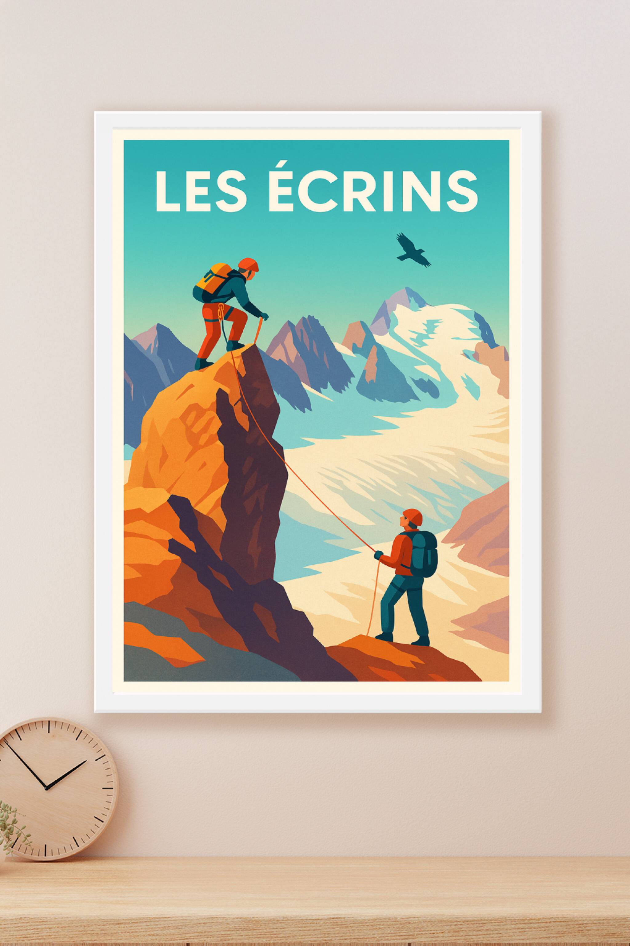 Plongez dans l'univers grandiose des Alpes avec cette affiche représentant l'ascension des sommets emblématiques du massif des Écrins. Deux alpinis...