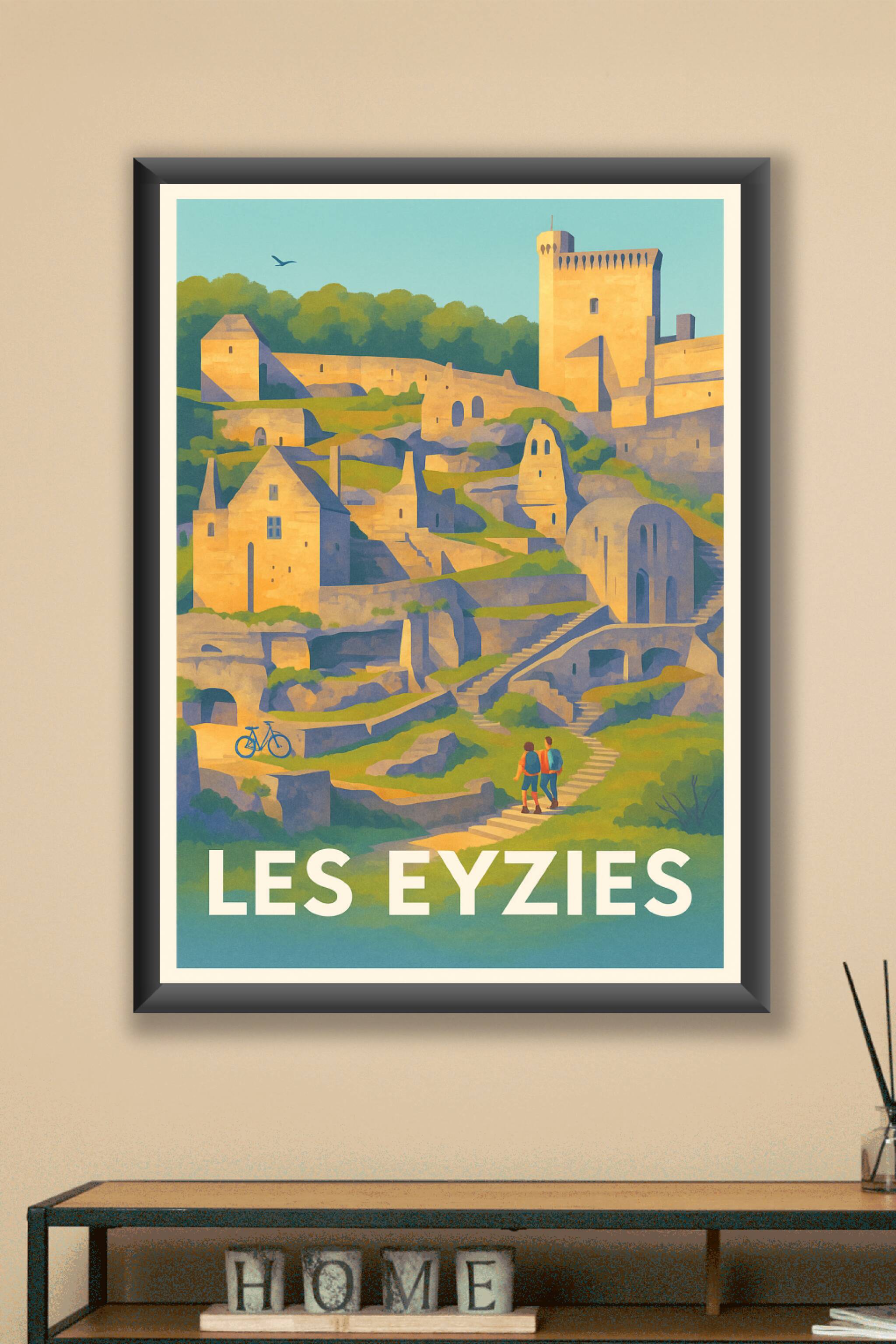 Découvrez la beauté et le mystère des Eyzies, célèbre pour son patrimoine préhistorique exceptionnel, avec cette affiche illustrée aux couleurs dou...