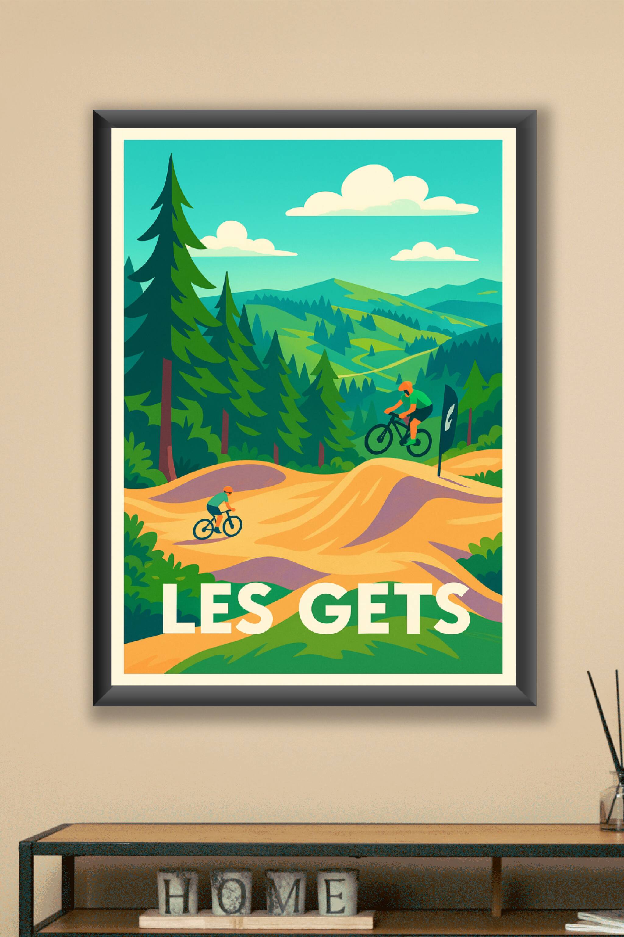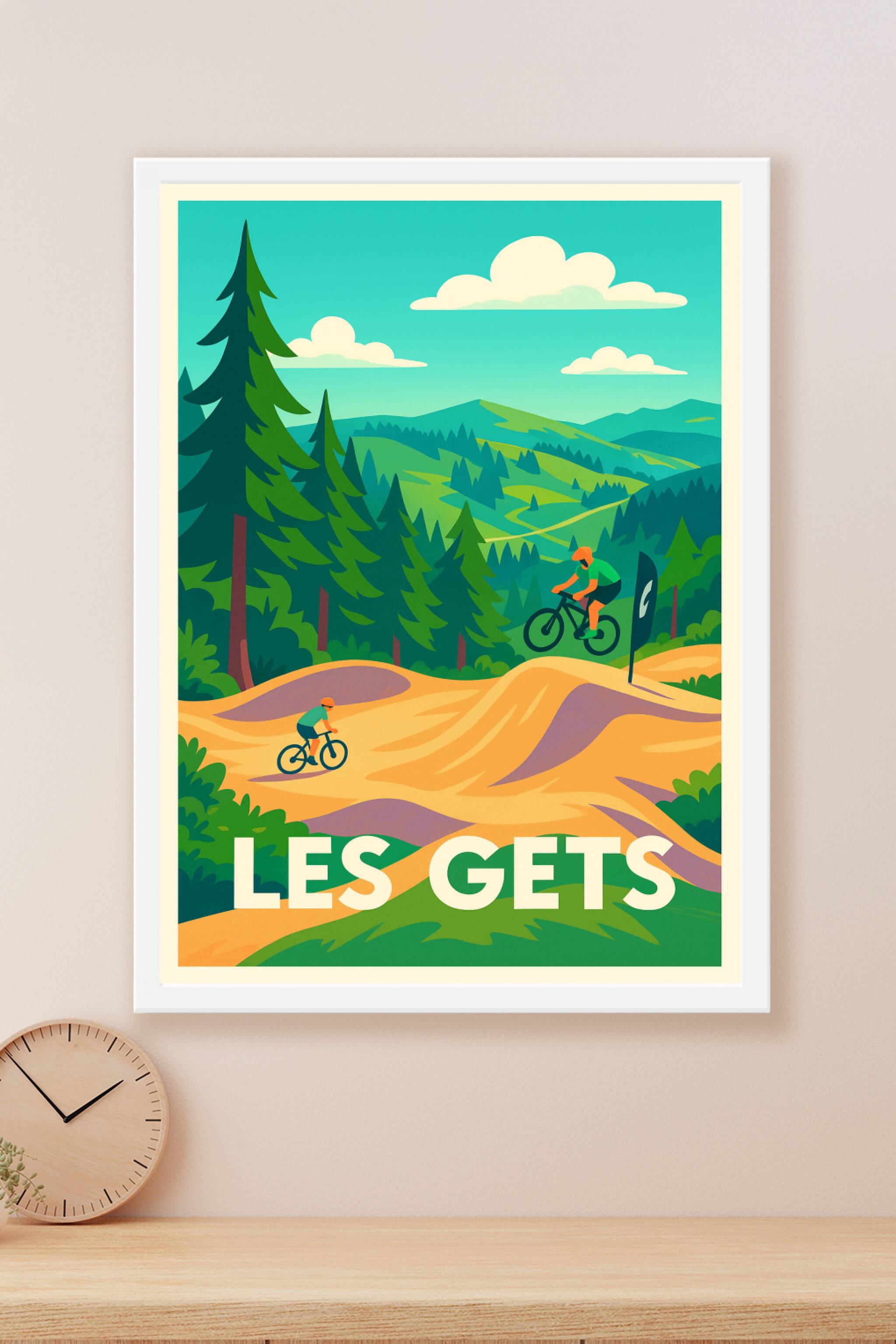 Découvrez l'énergie et la liberté des sports de montagne avec cette affiche représentant la station de Les Gets, célèbre pour ses pistes de VTT et ...