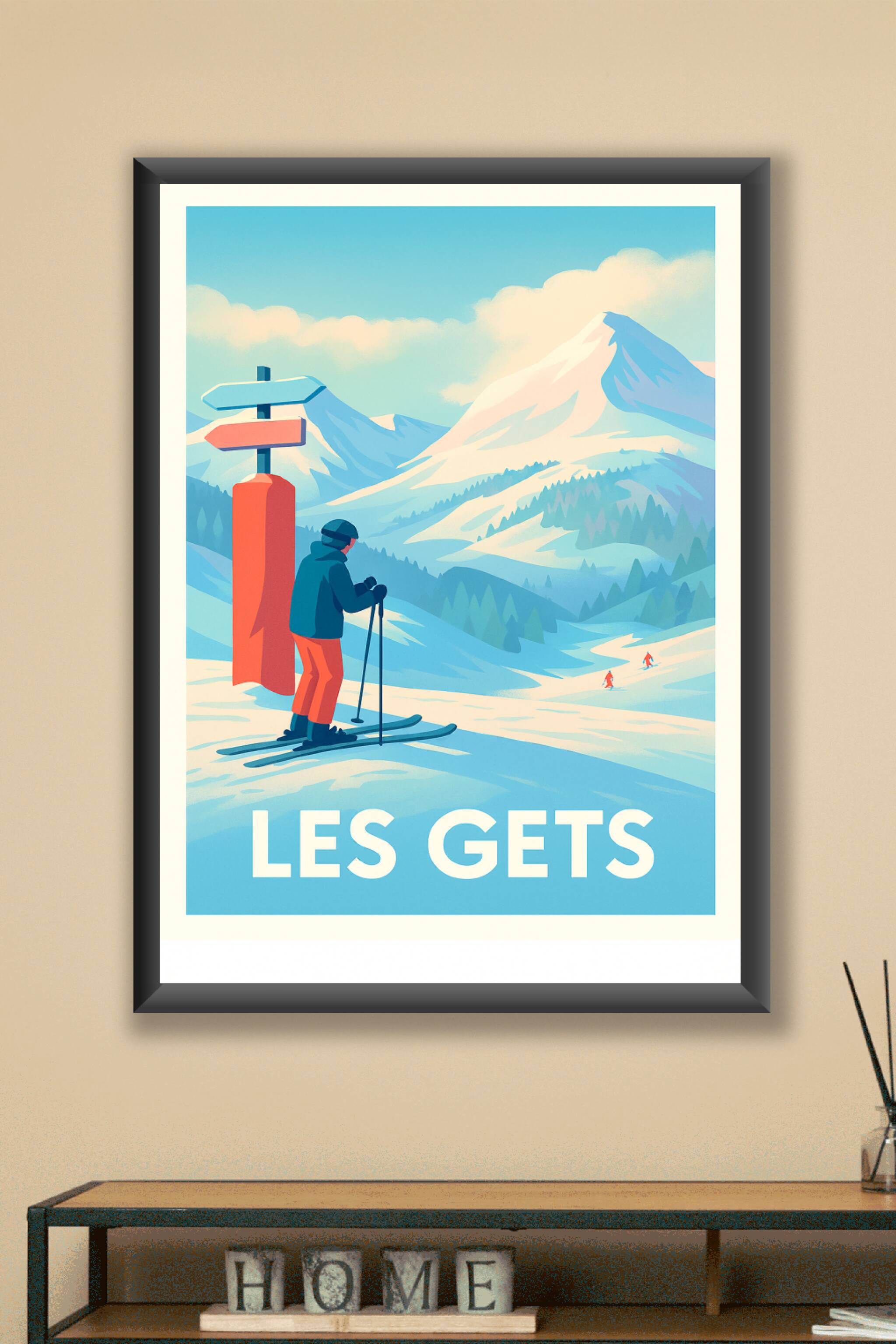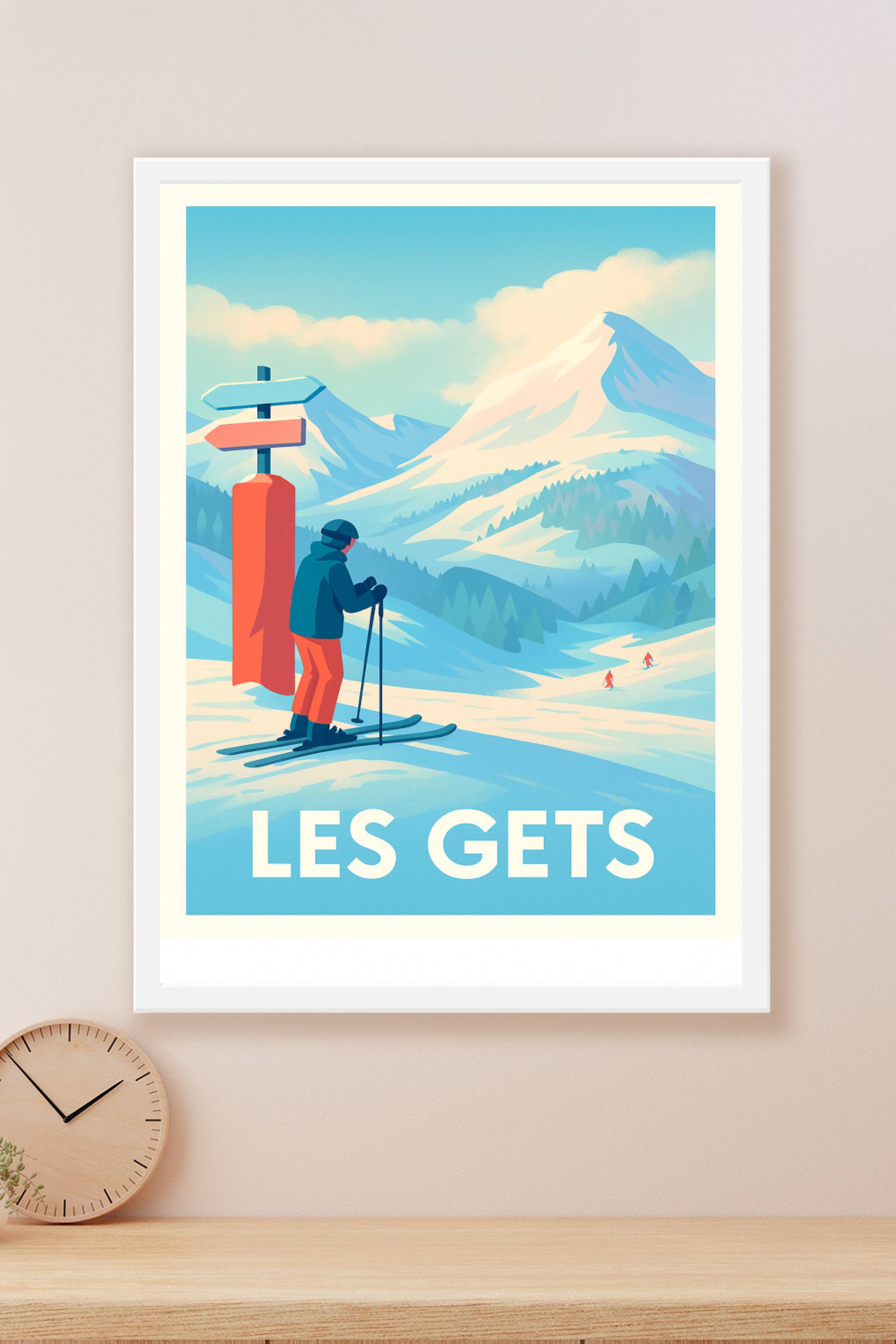 Découvrez la splendeur des montagnes enneigées de Les Gets avec cette affiche au style rétro moderne, où un skieur contemple les pistes immaculées ...