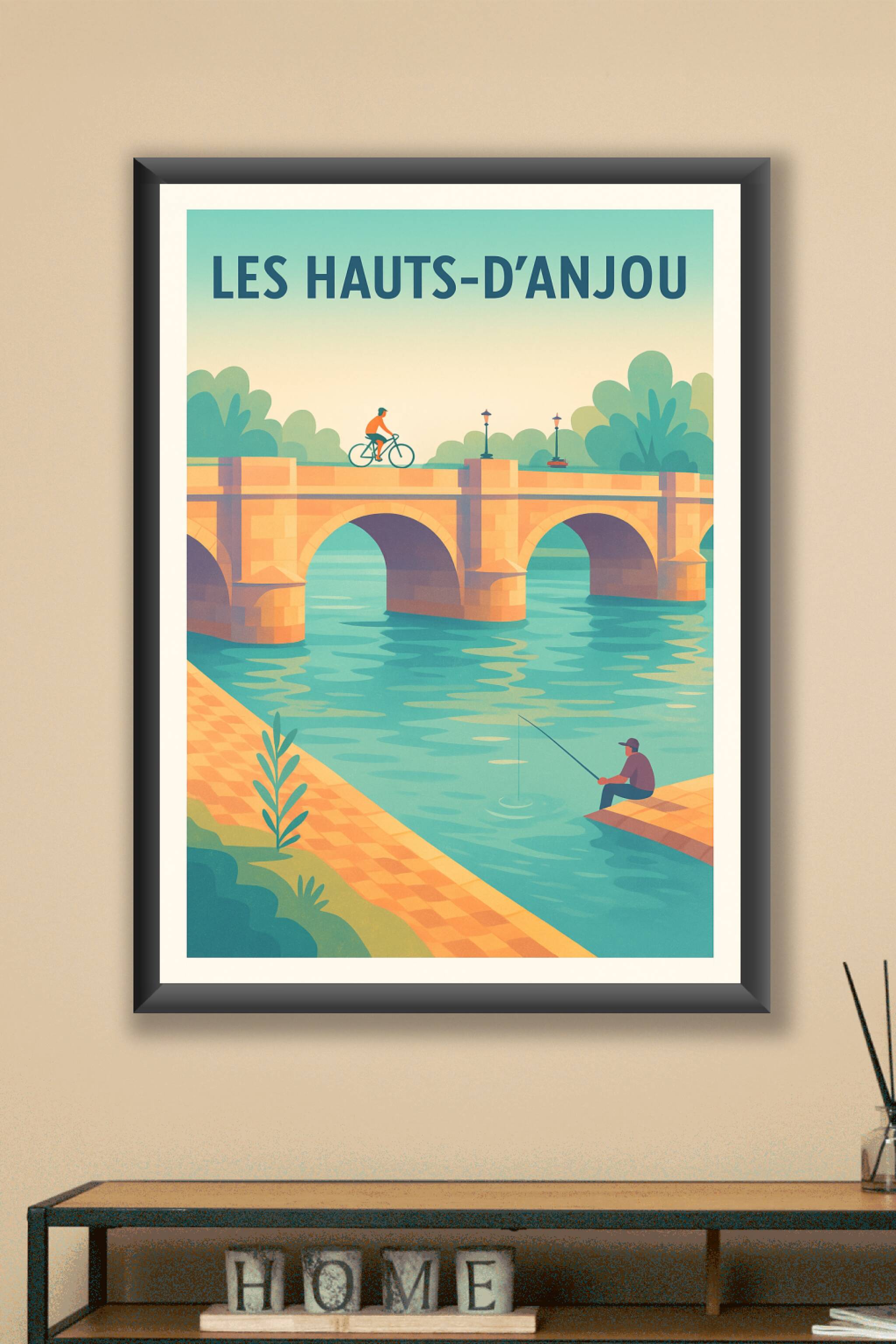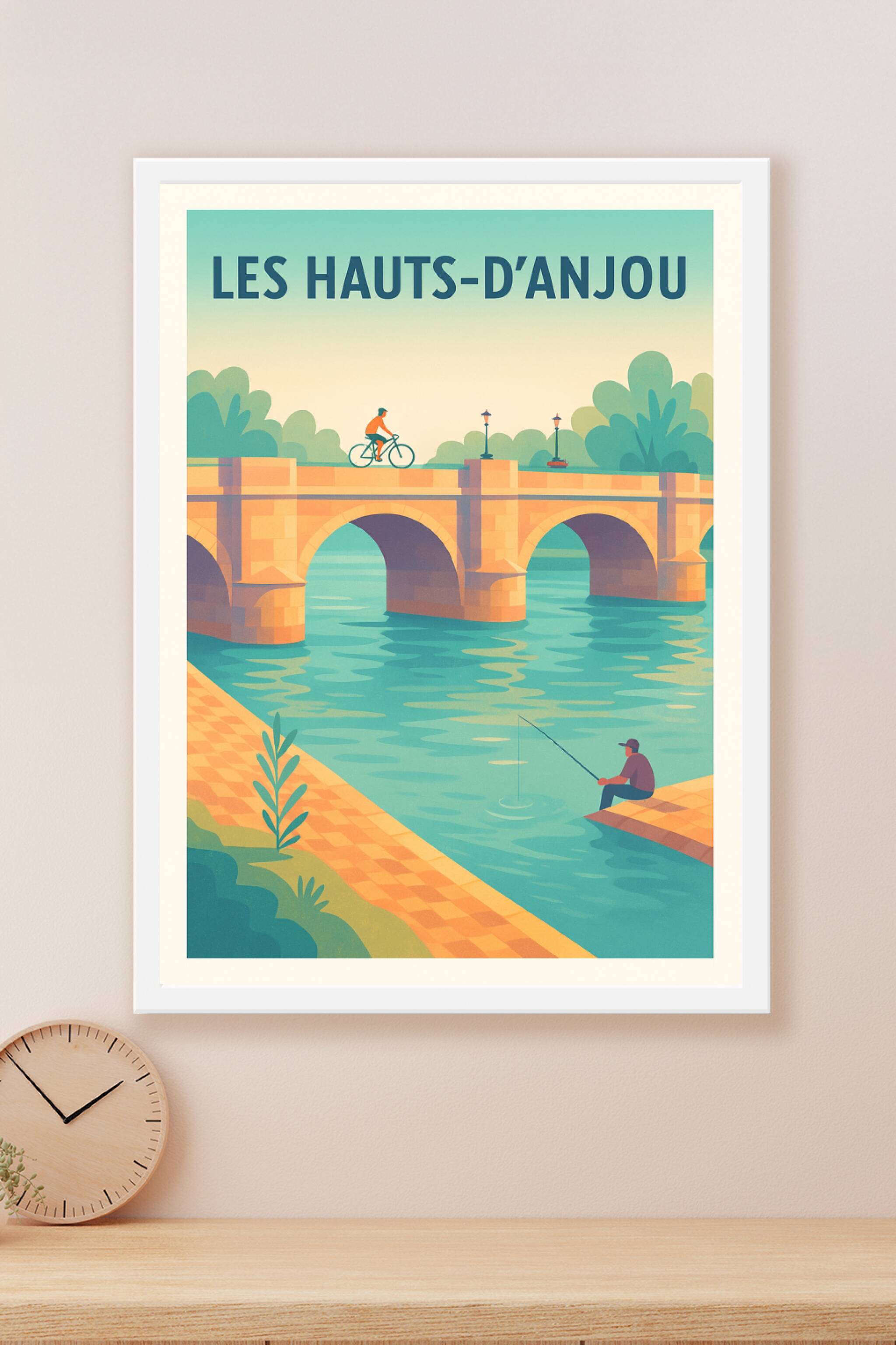 Découvrez la sérénité et le charme de la région des Hauts-d'Anjou avec cette affiche illustrée représentant un pont empreint de douceur et de natur...