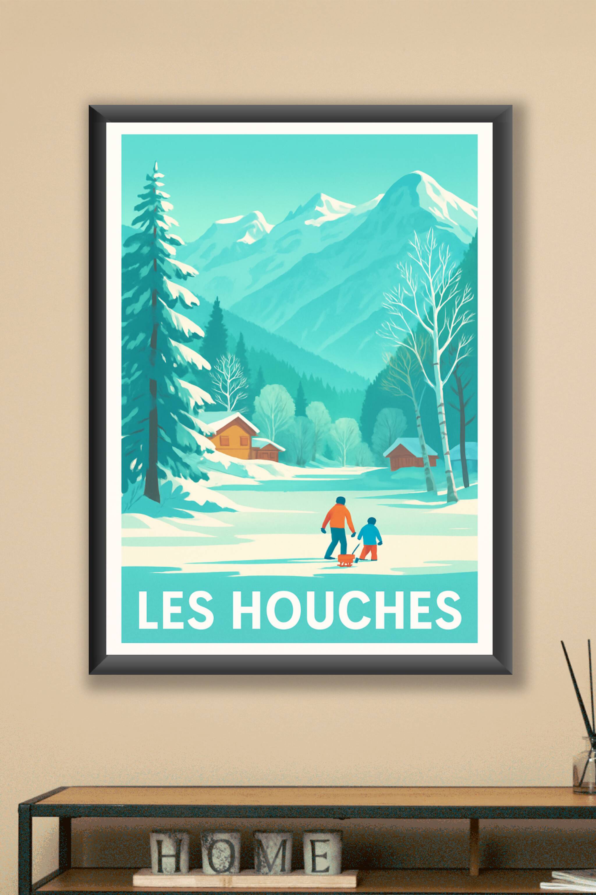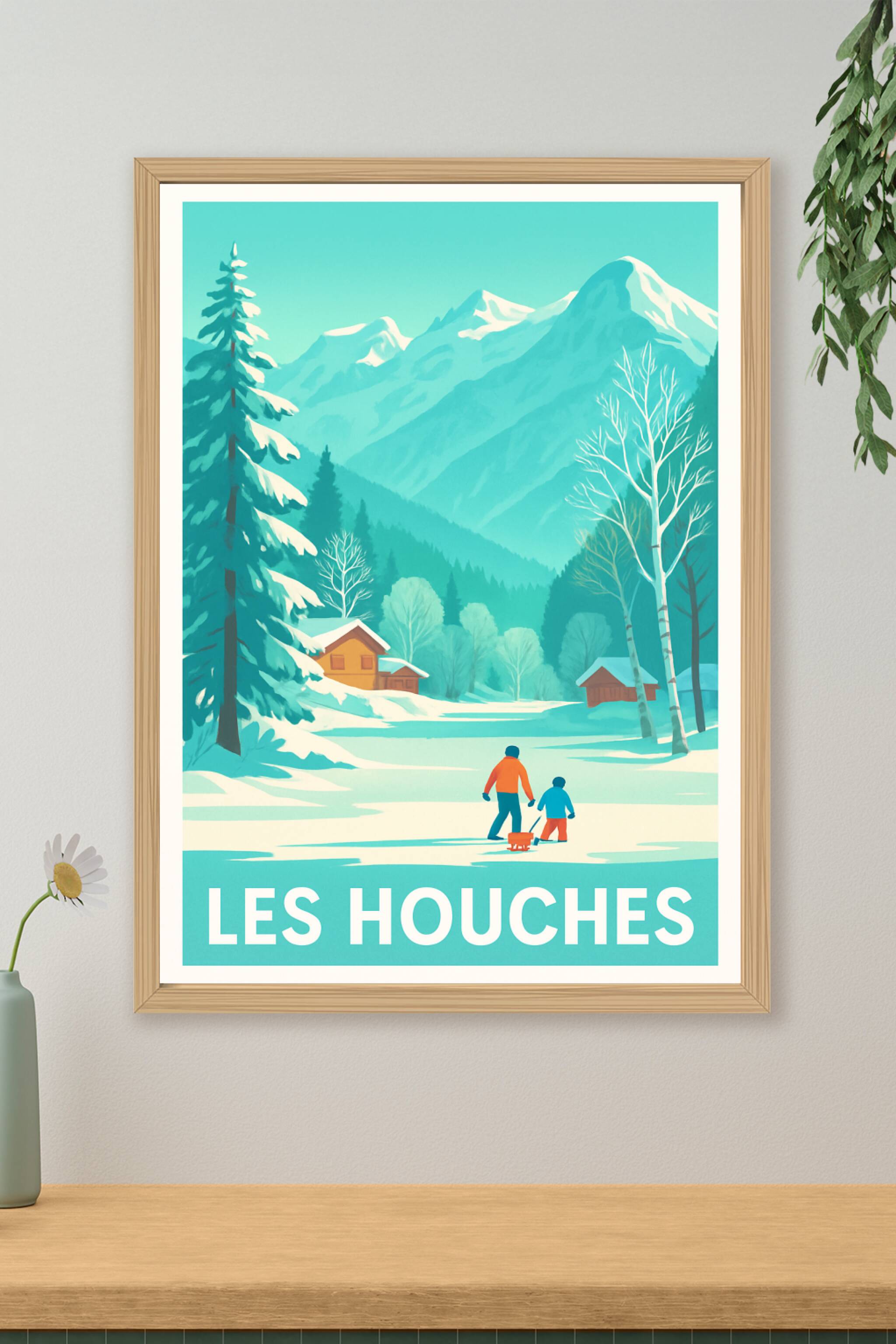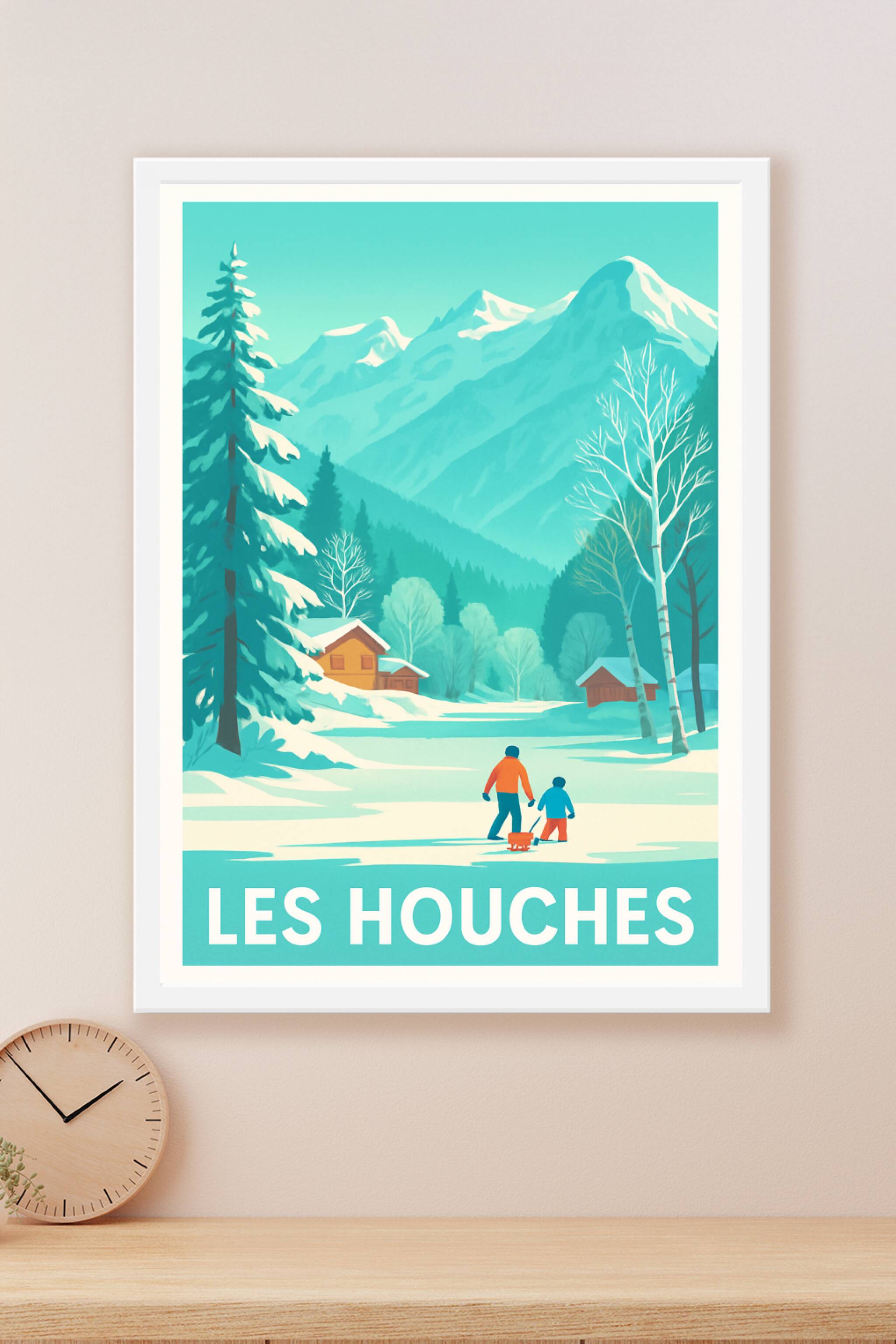 Découvrez la douceur d'un paysage hivernal à Les Houches avec cette affiche au style rétro et apaisant. Cette illustration met en scène une promena...