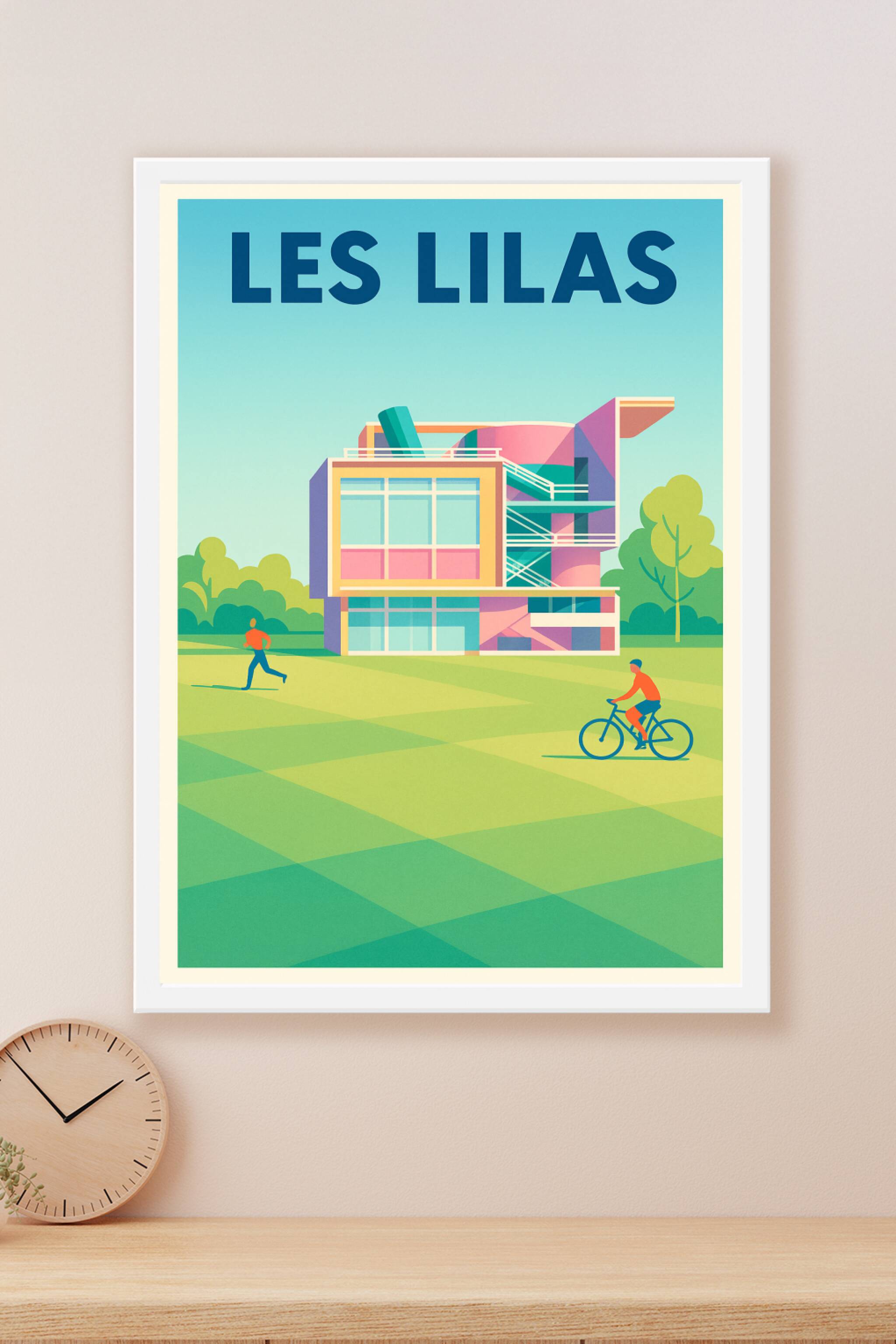 Découvrez l'élégance contemporaine des Lilas avec cette affiche au design épuré et coloré. Ce poster met en lumière une architecture moderne nichée...