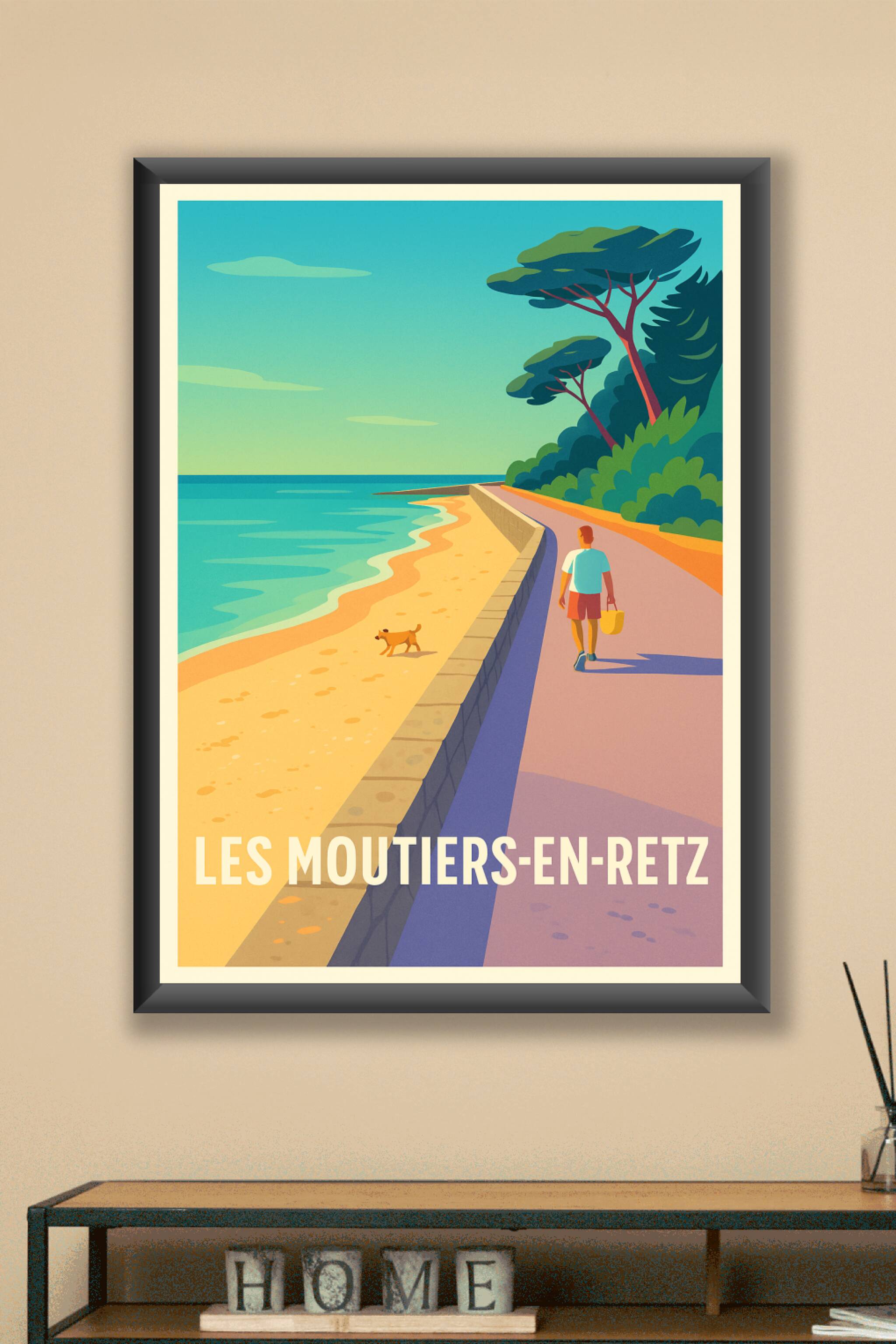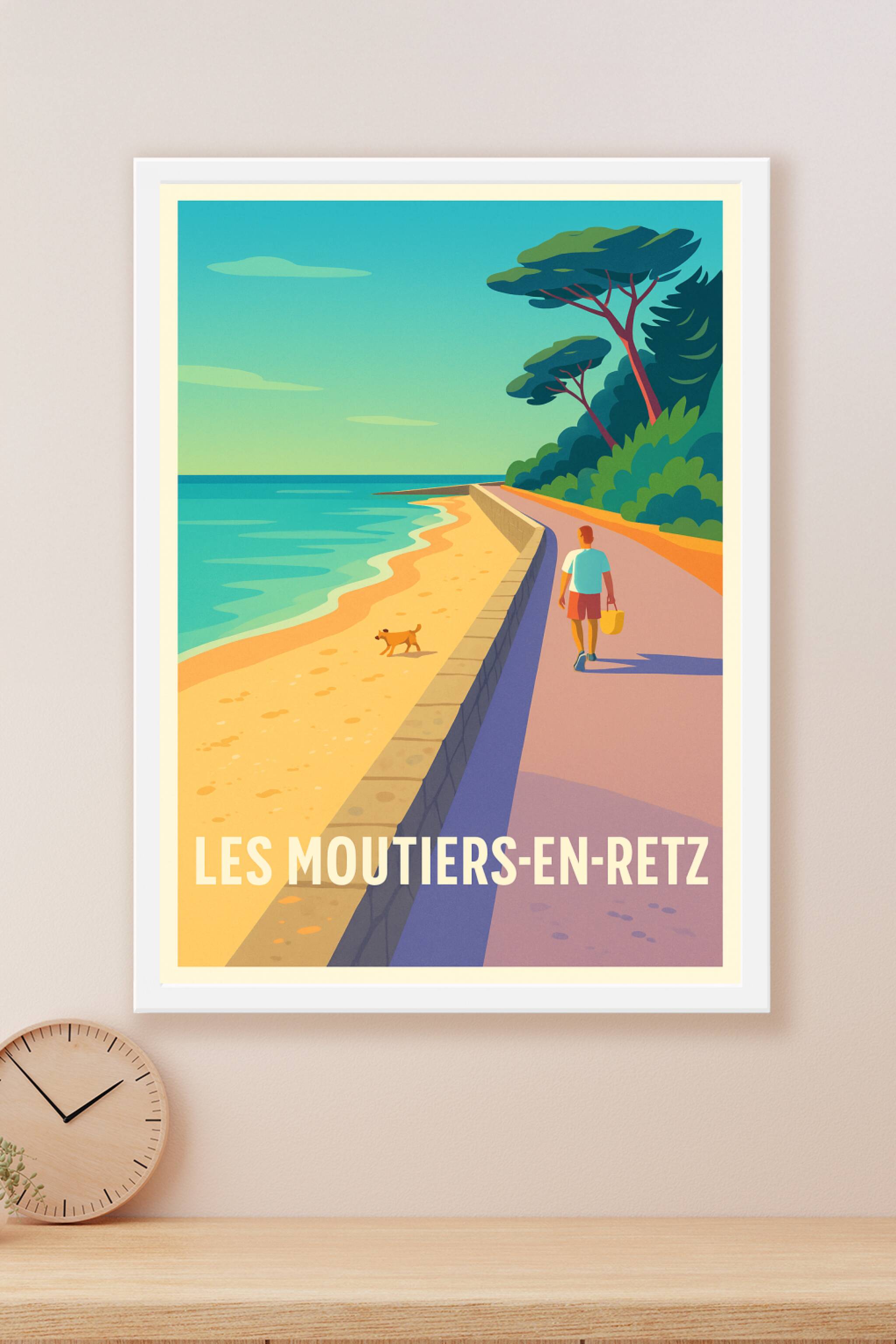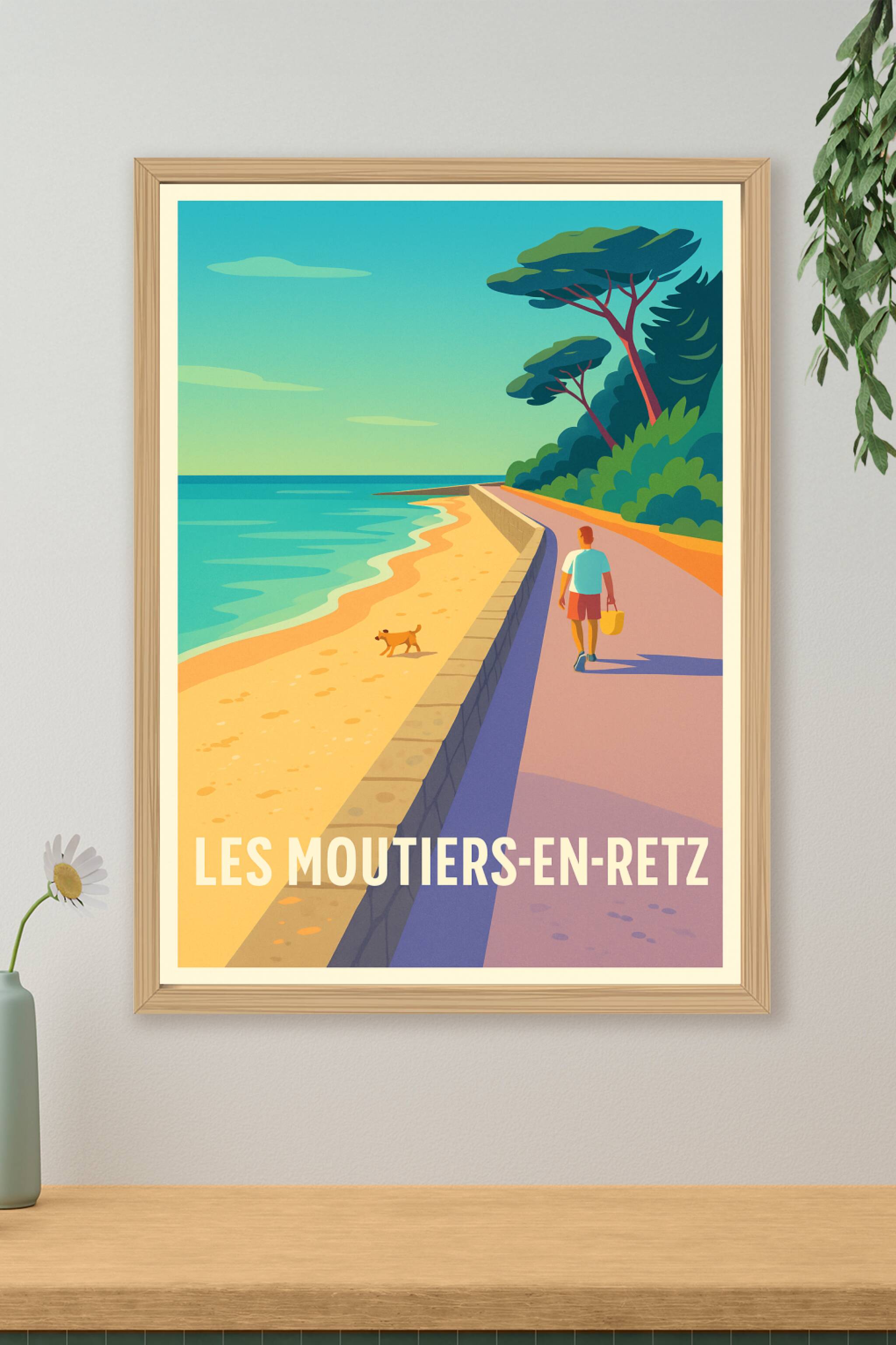 Découvrez la douceur de vivre des Moutiers-en-Retz avec cette affiche illustrée mettant en scène une promenade paisible le long de la plage. La lum...