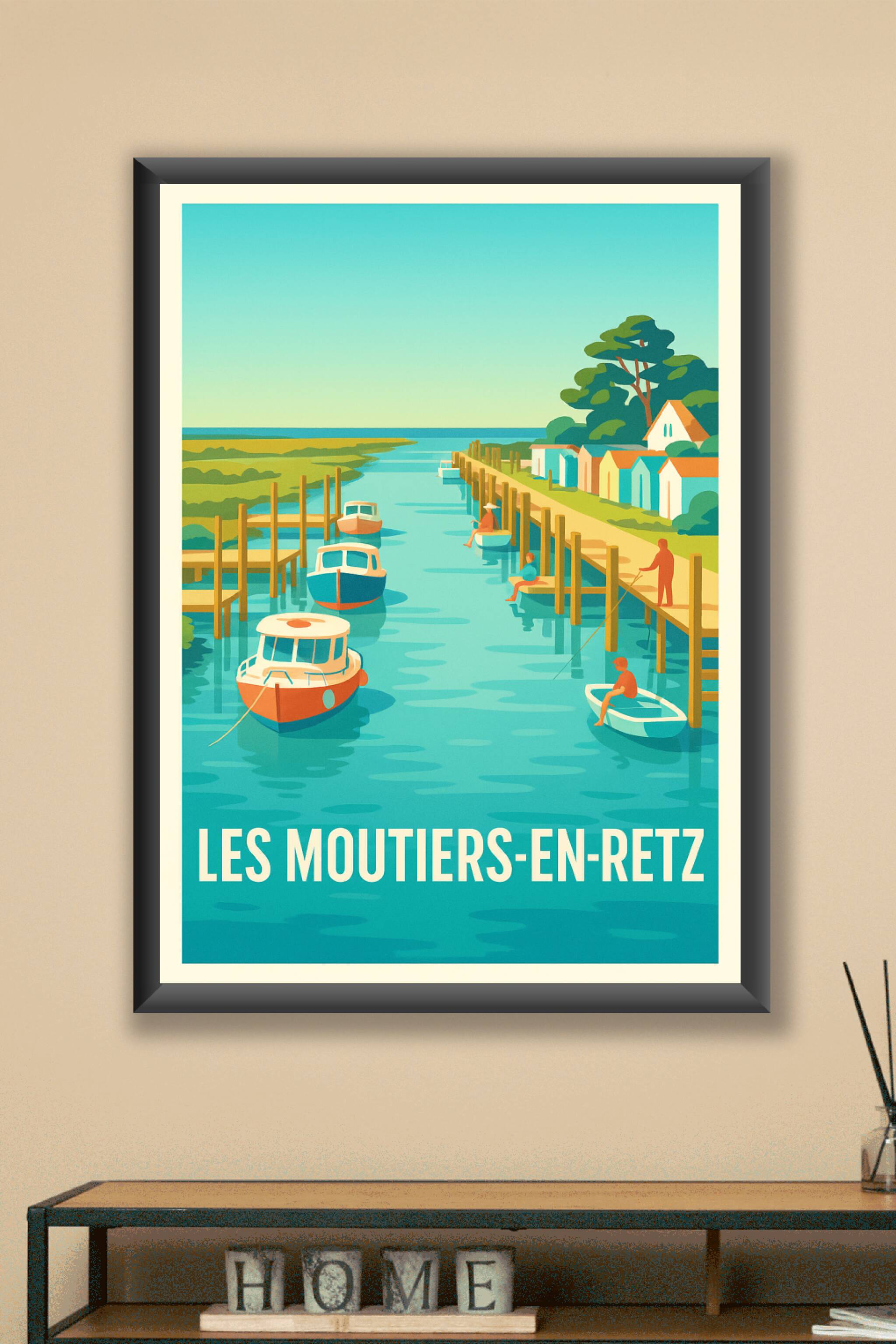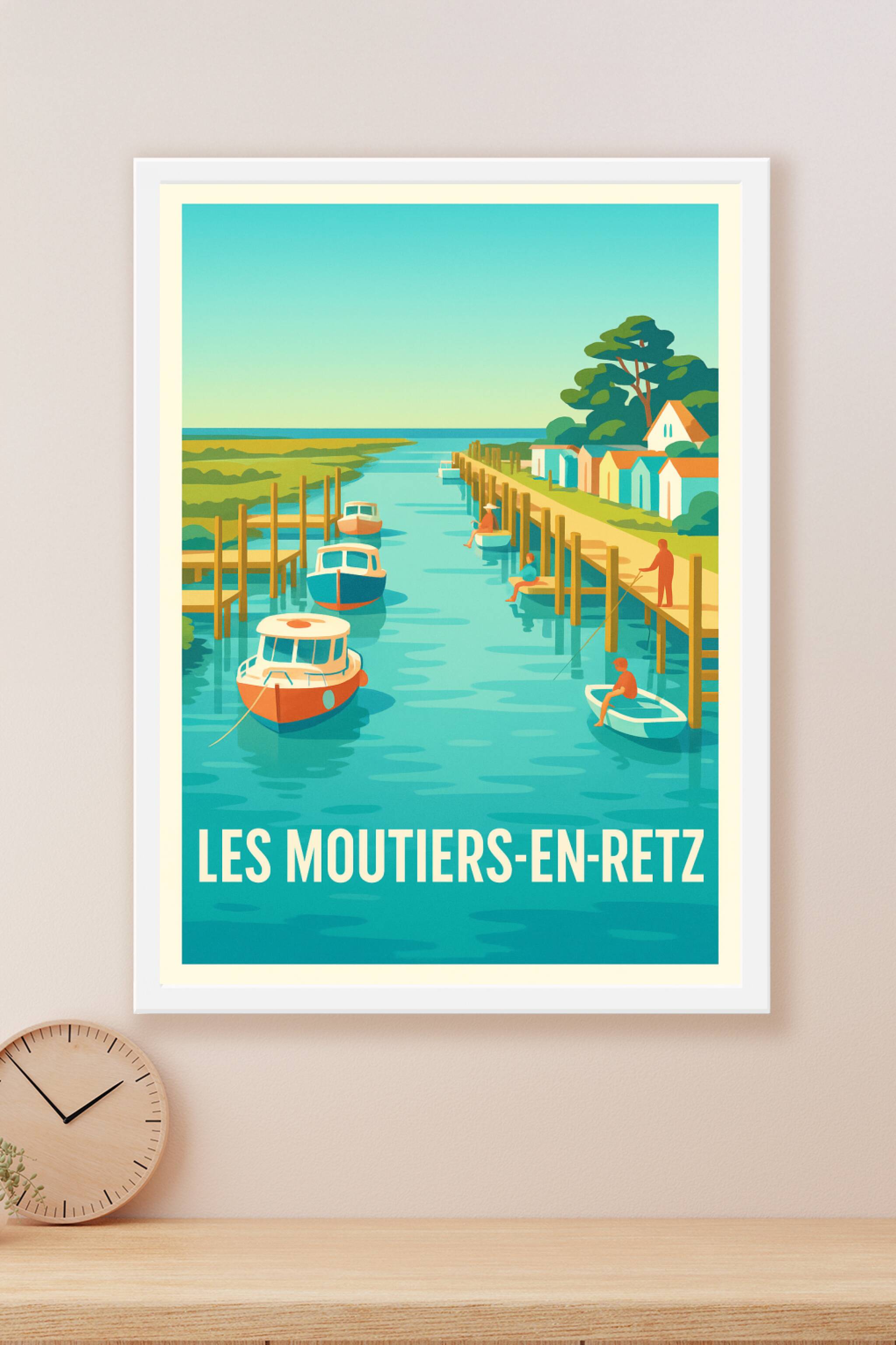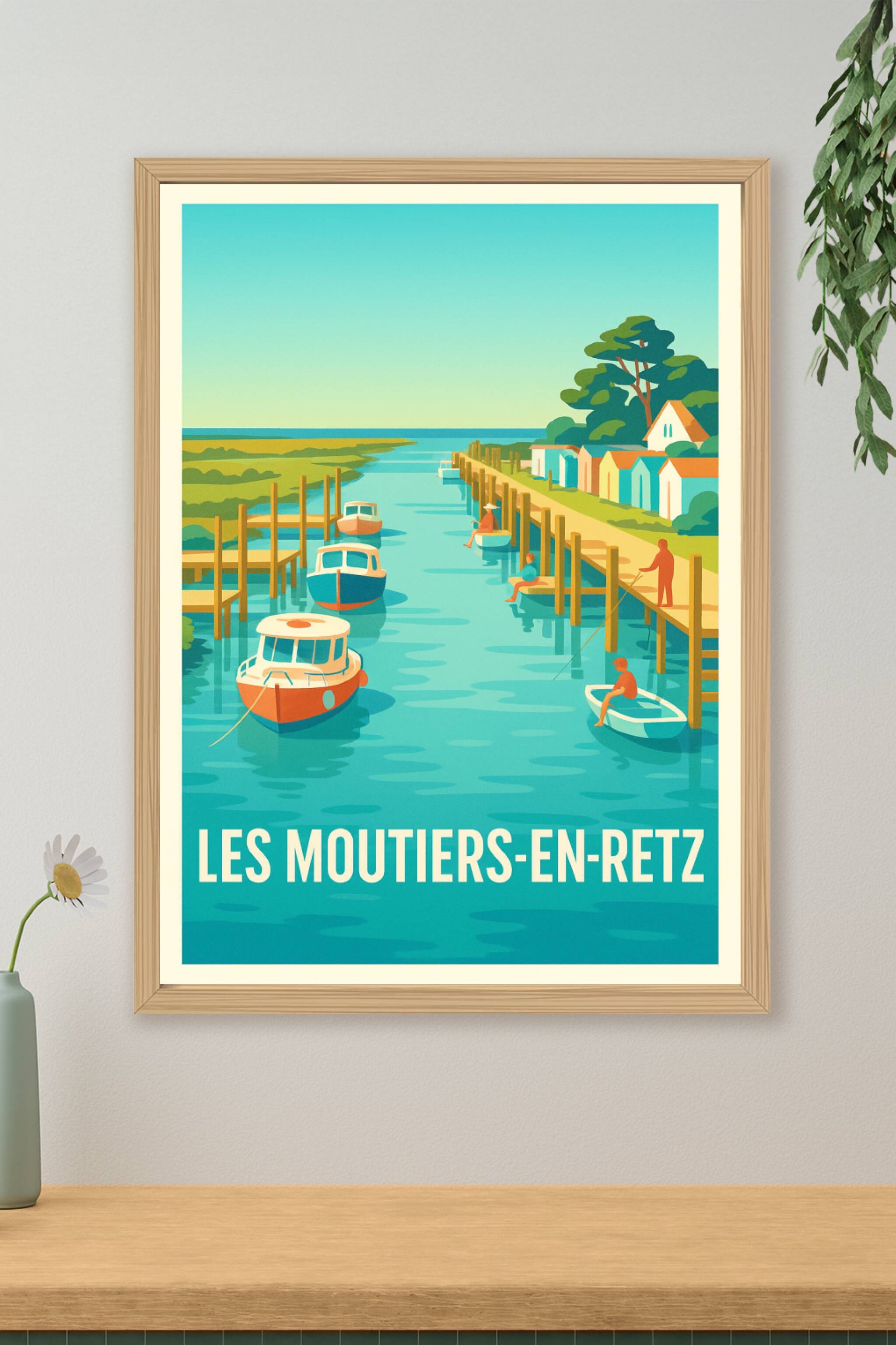 Découvrez la sérénité et le charme pittoresque de Les Moutiers-en-Retz avec cette affiche au style vintage illustratif. Représentant un canal paisi...