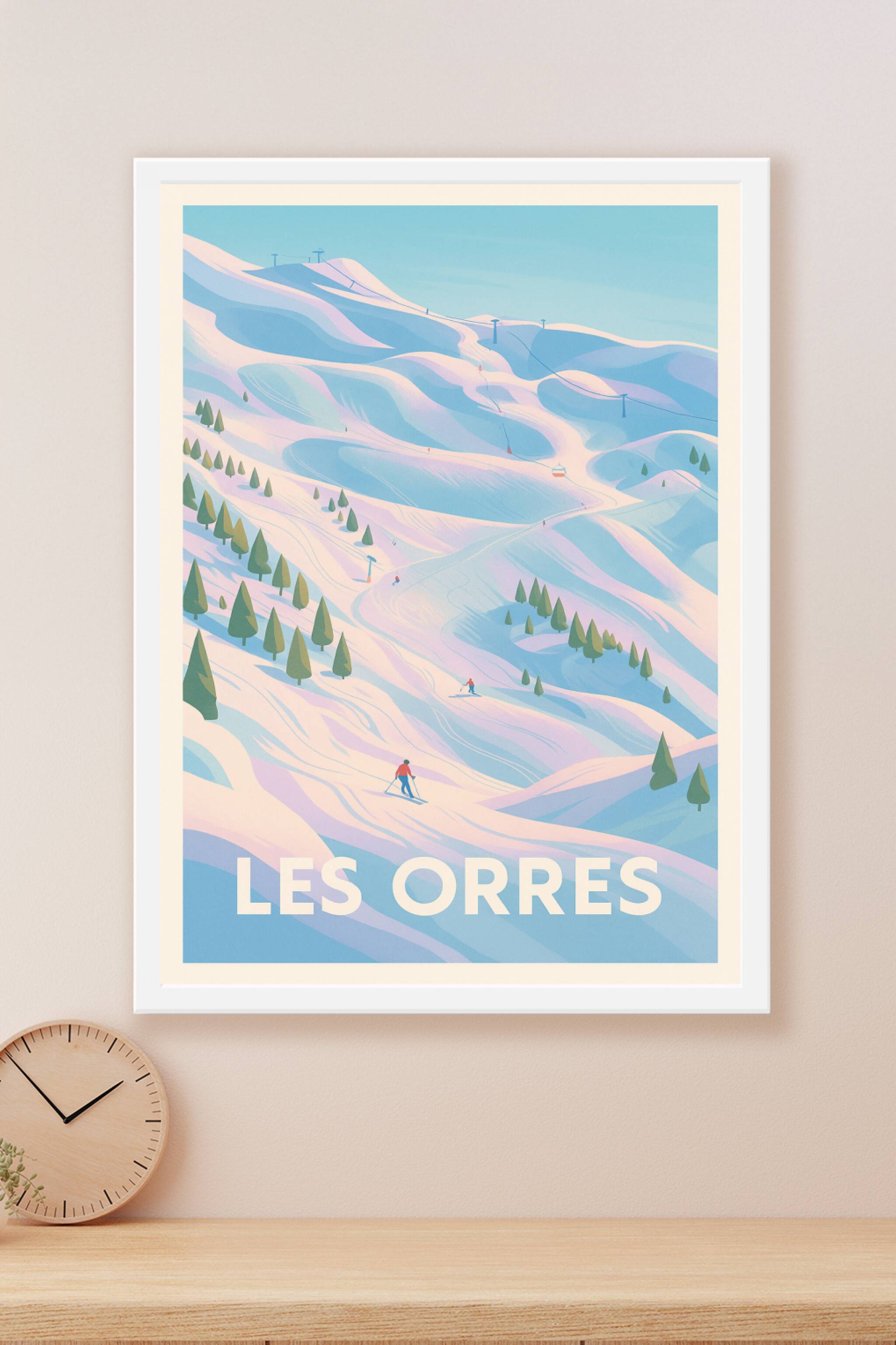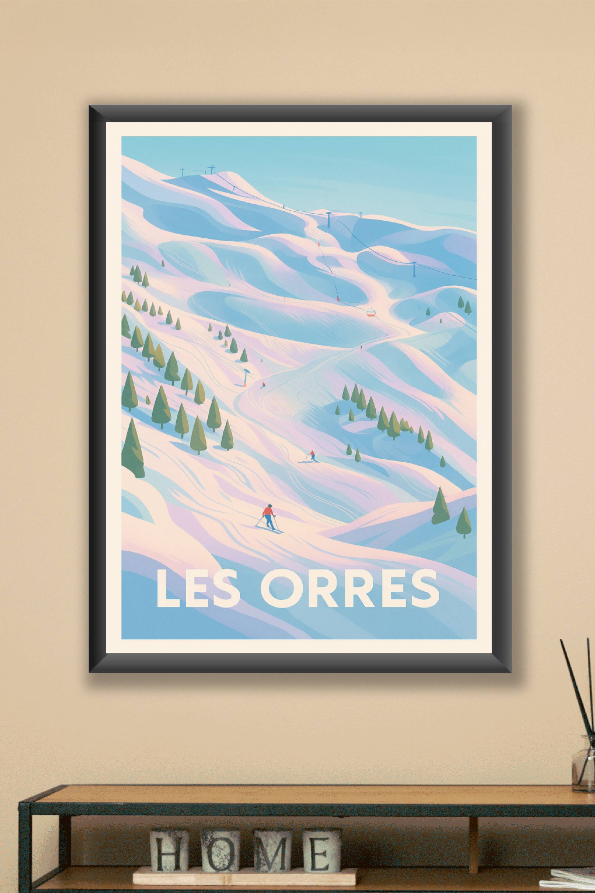 Découvrez la magie hivernale des Alpes avec cette affiche illustrée qui capture la douceur des paysages enneigés de la station des Orres. Ce poster...