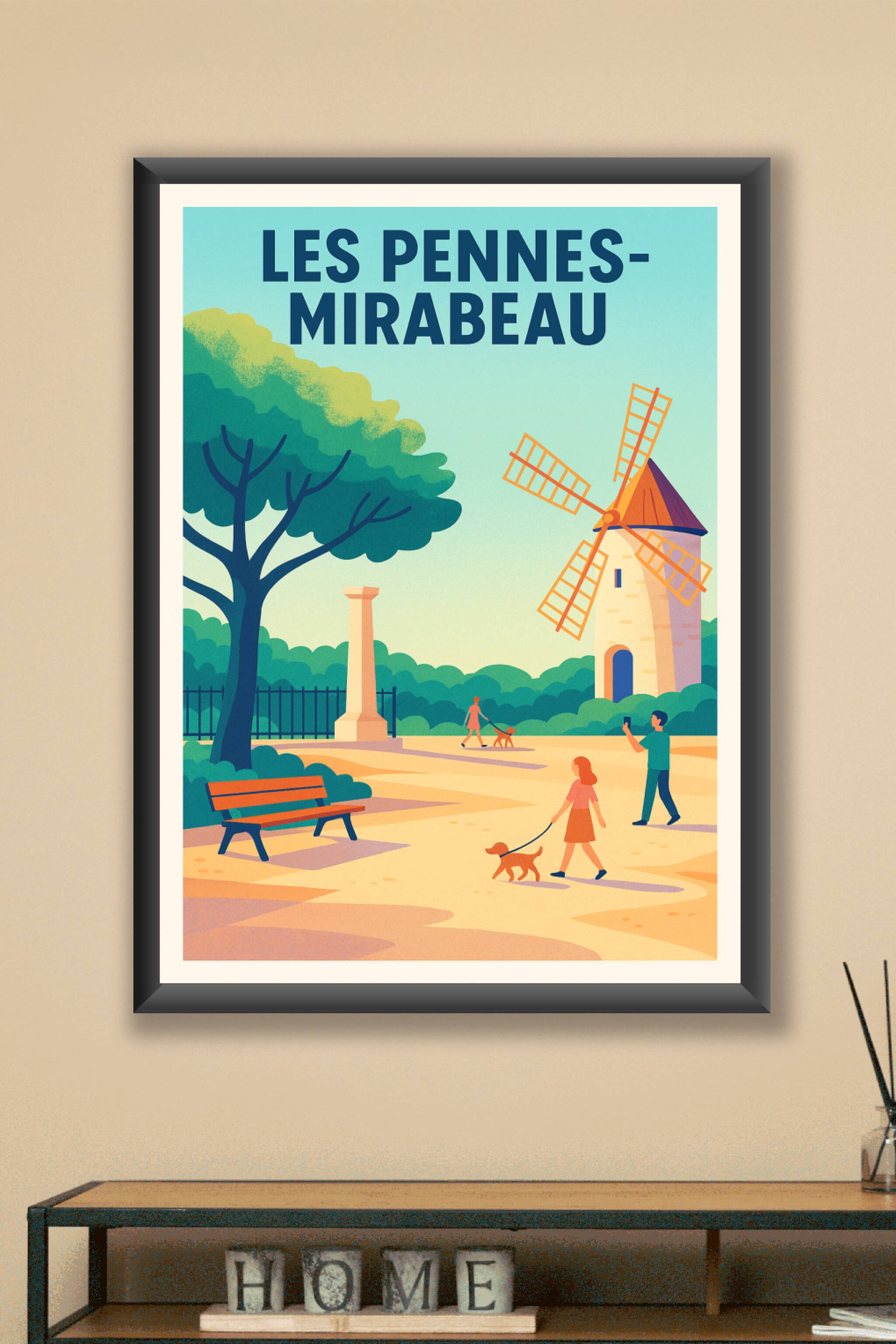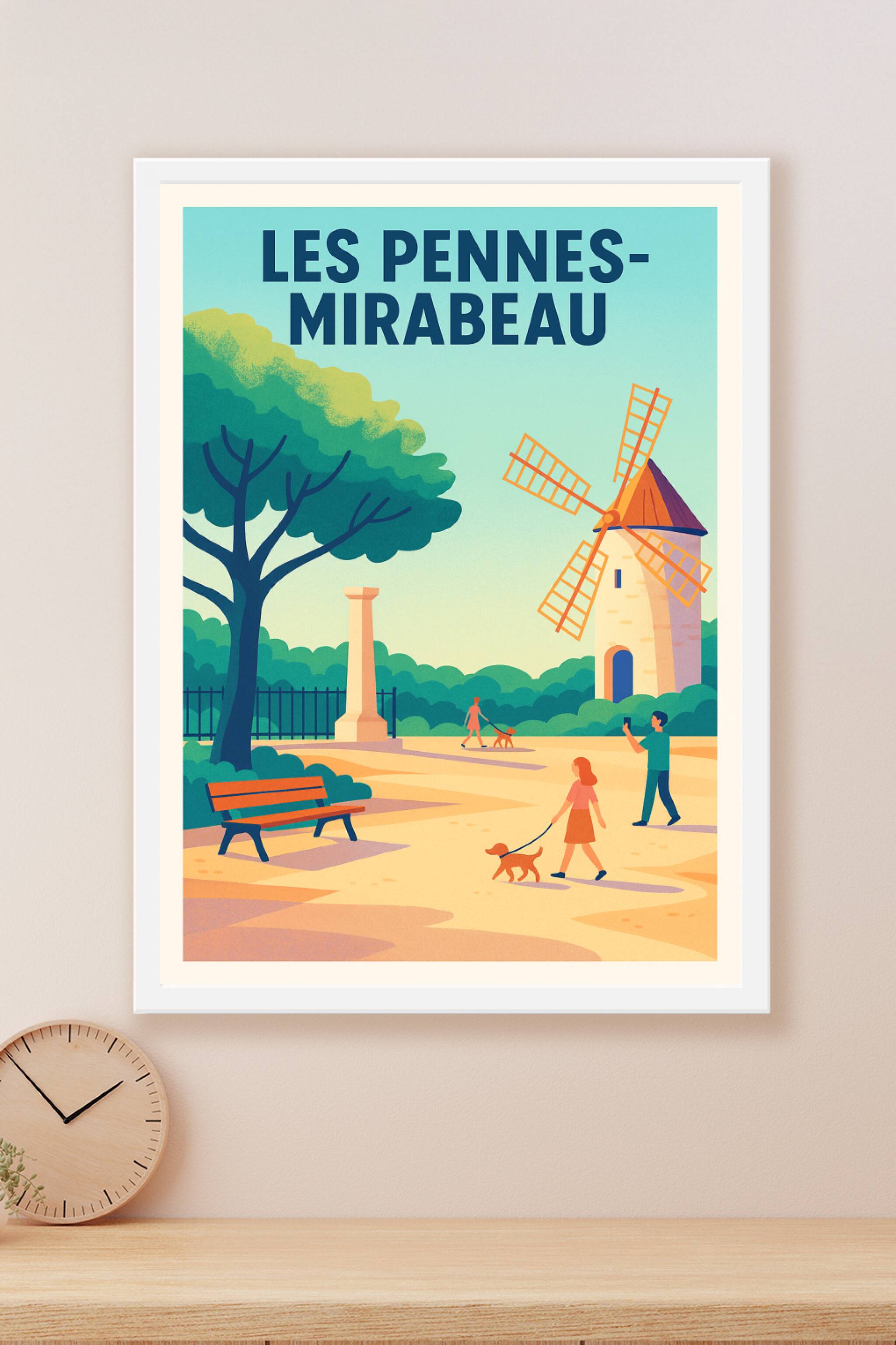 Découvrez le charme bucolique des Pennes-Mirabeau avec cette affiche illustrée mêlant paysages apaisants et patrimoine local, comme ce moulin emblé...