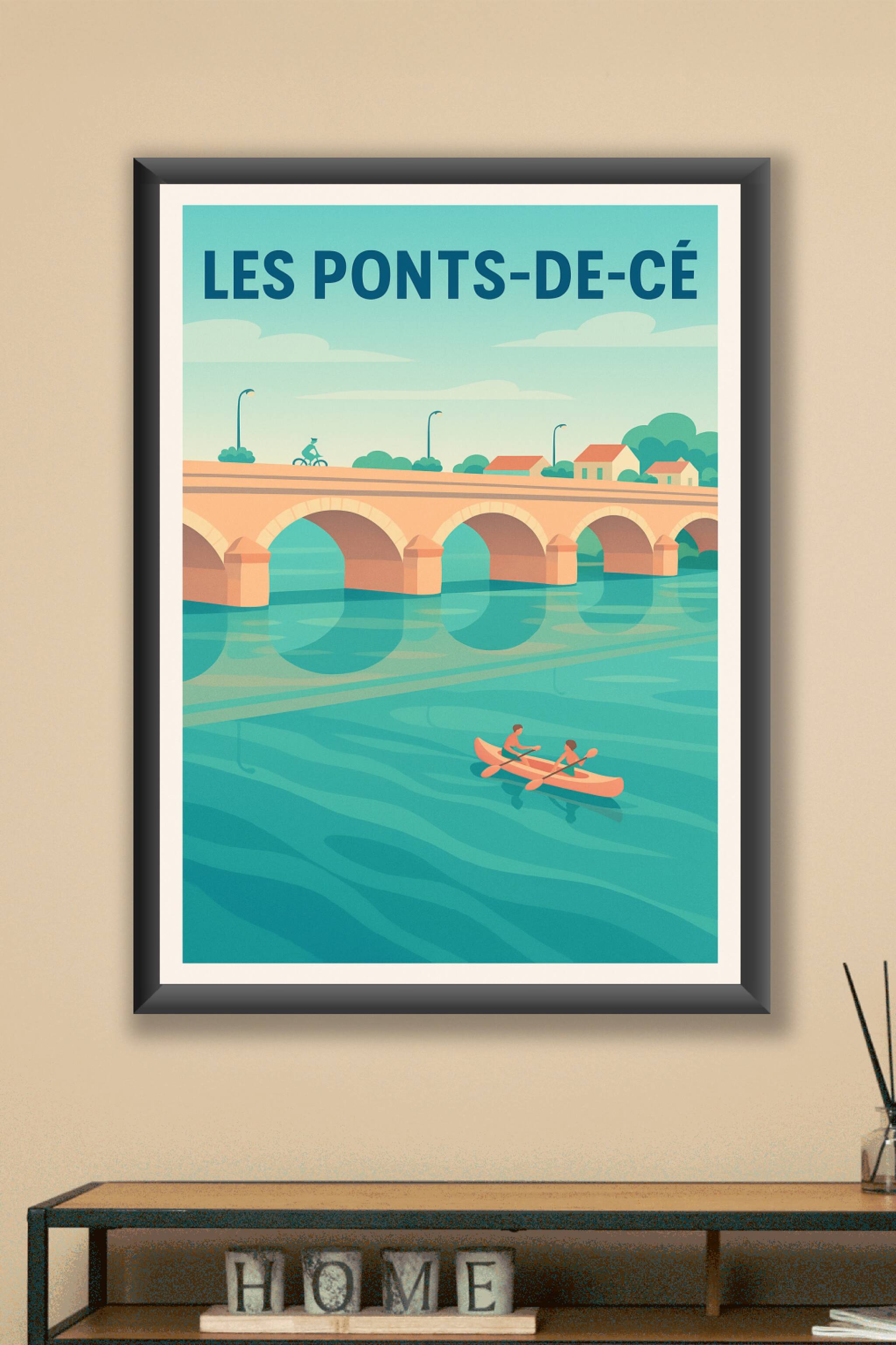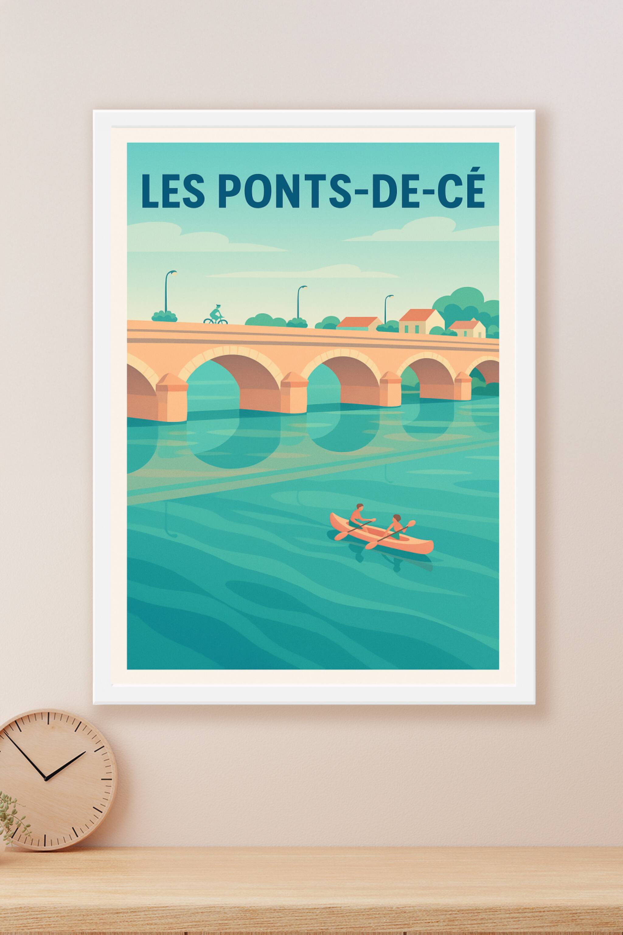 Découvrez la douceur de vivre des Ponts-de-Cé avec ce poster illustré mettant en scène le célèbre pont et ses eaux paisibles traversées par des ram...