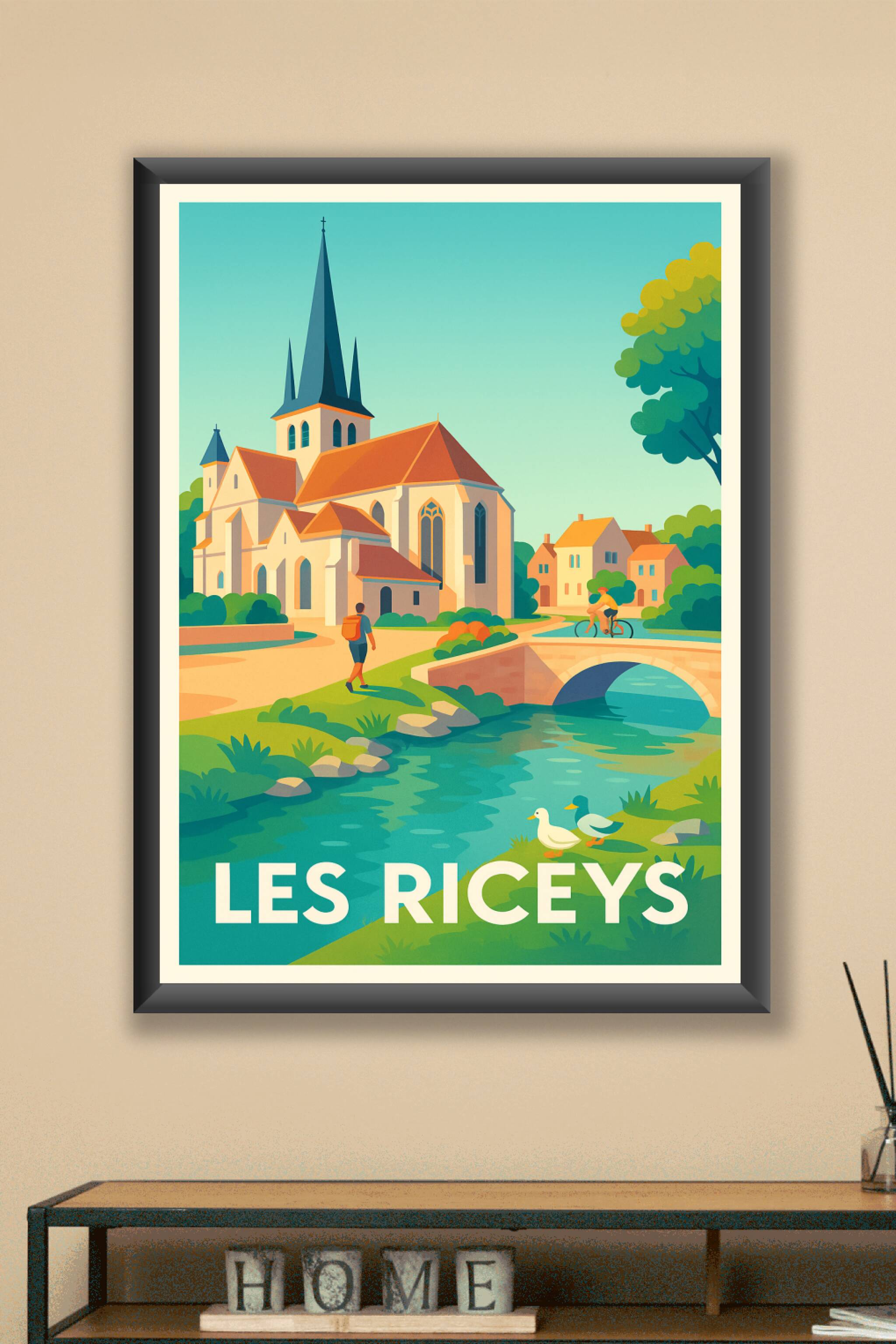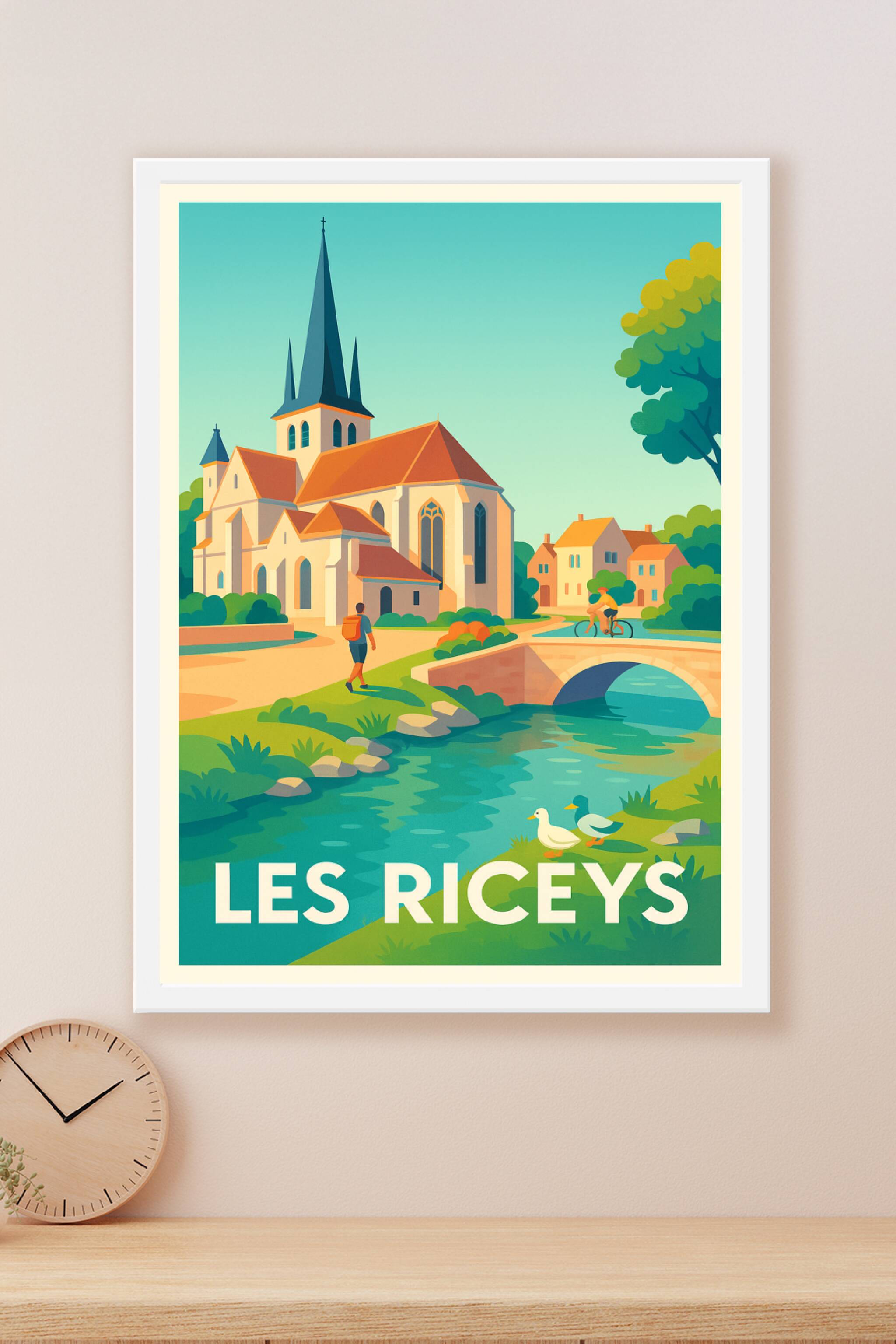 Découvrez la douceur de vivre à Les Riceys avec cette affiche illustrée mettant en scène son église historique et ses paysages paisibles bordant un...