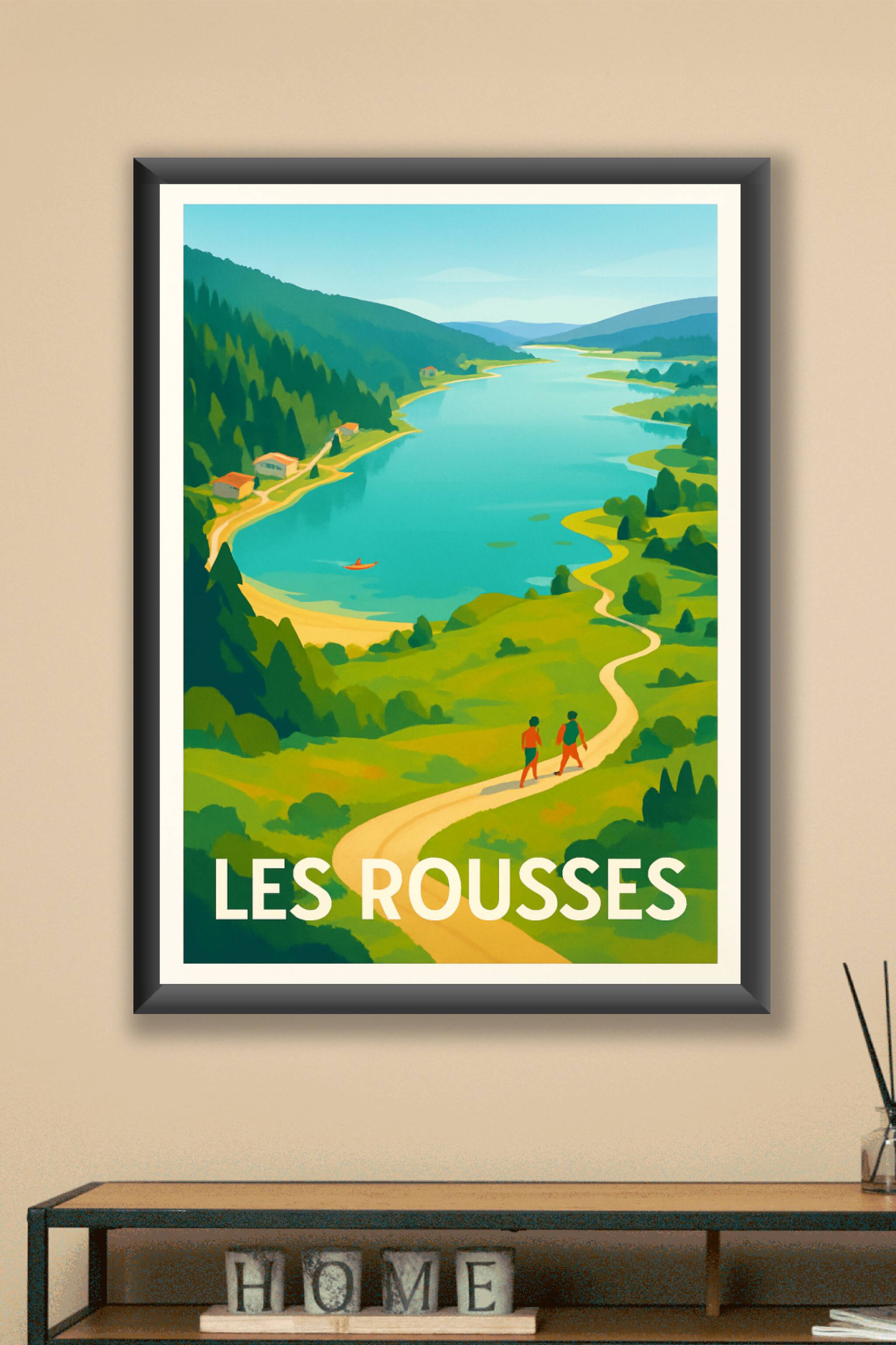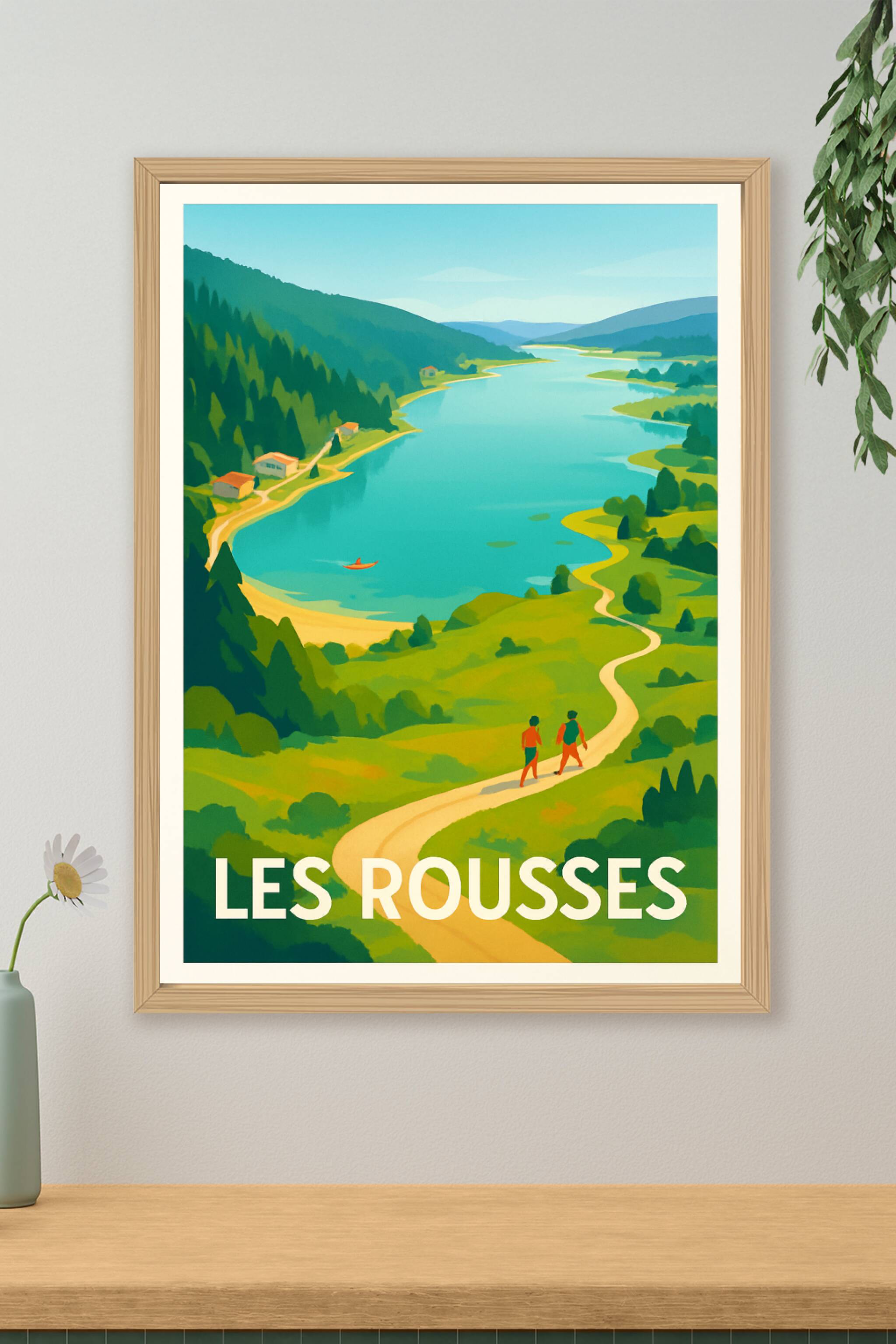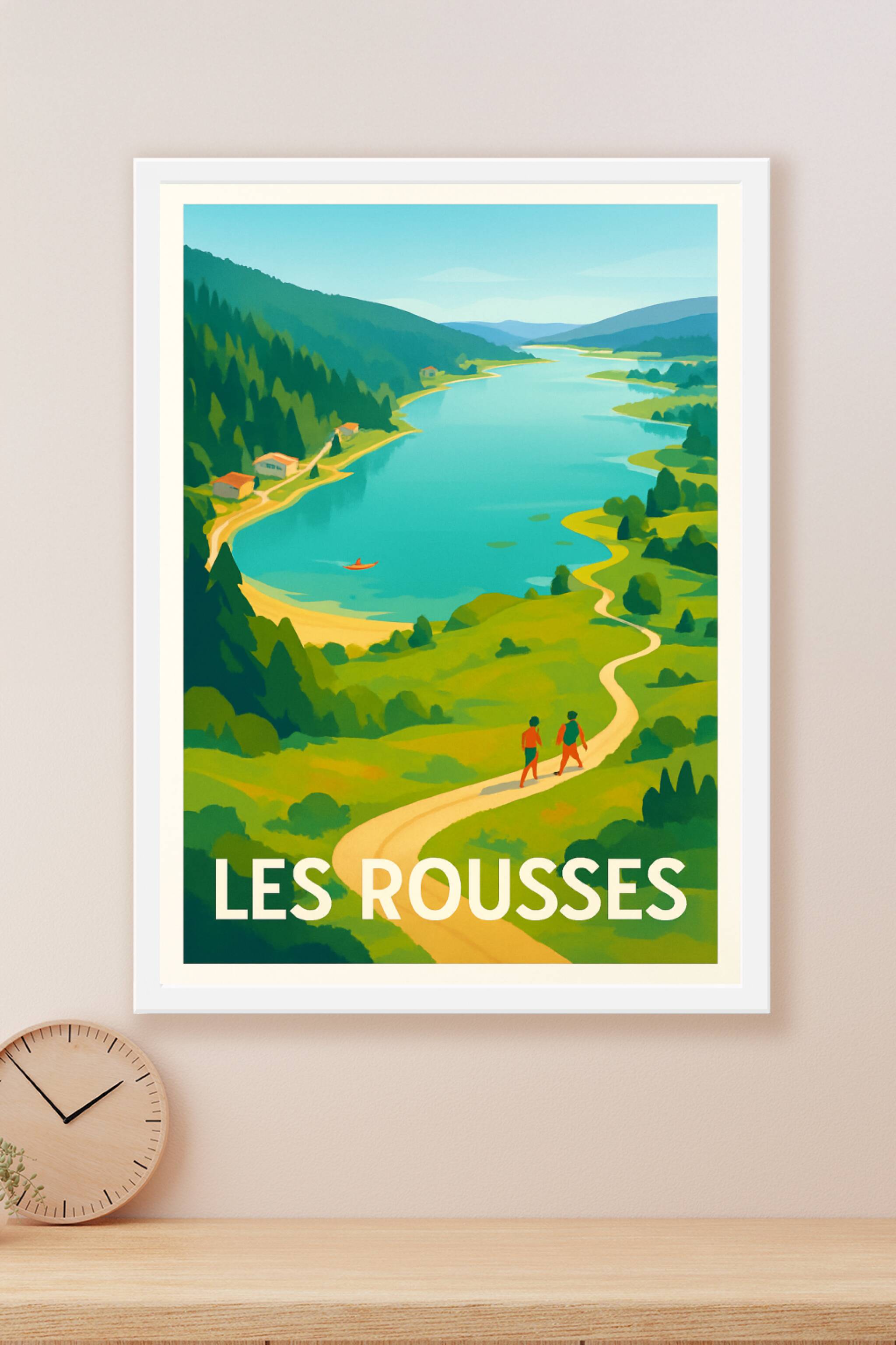 Découvrez la beauté paisible des paysages de Les Rousses avec cette affiche vintage illustrée. Cette scène met en avant les eaux calmes du lac ento...