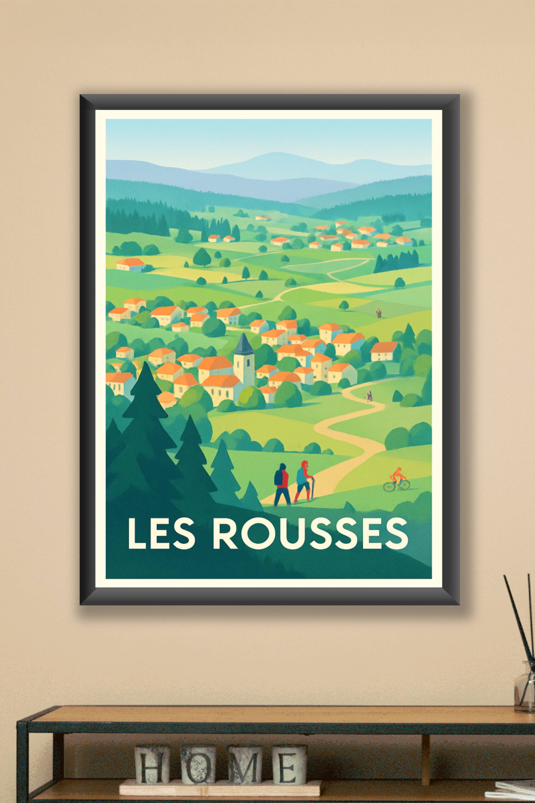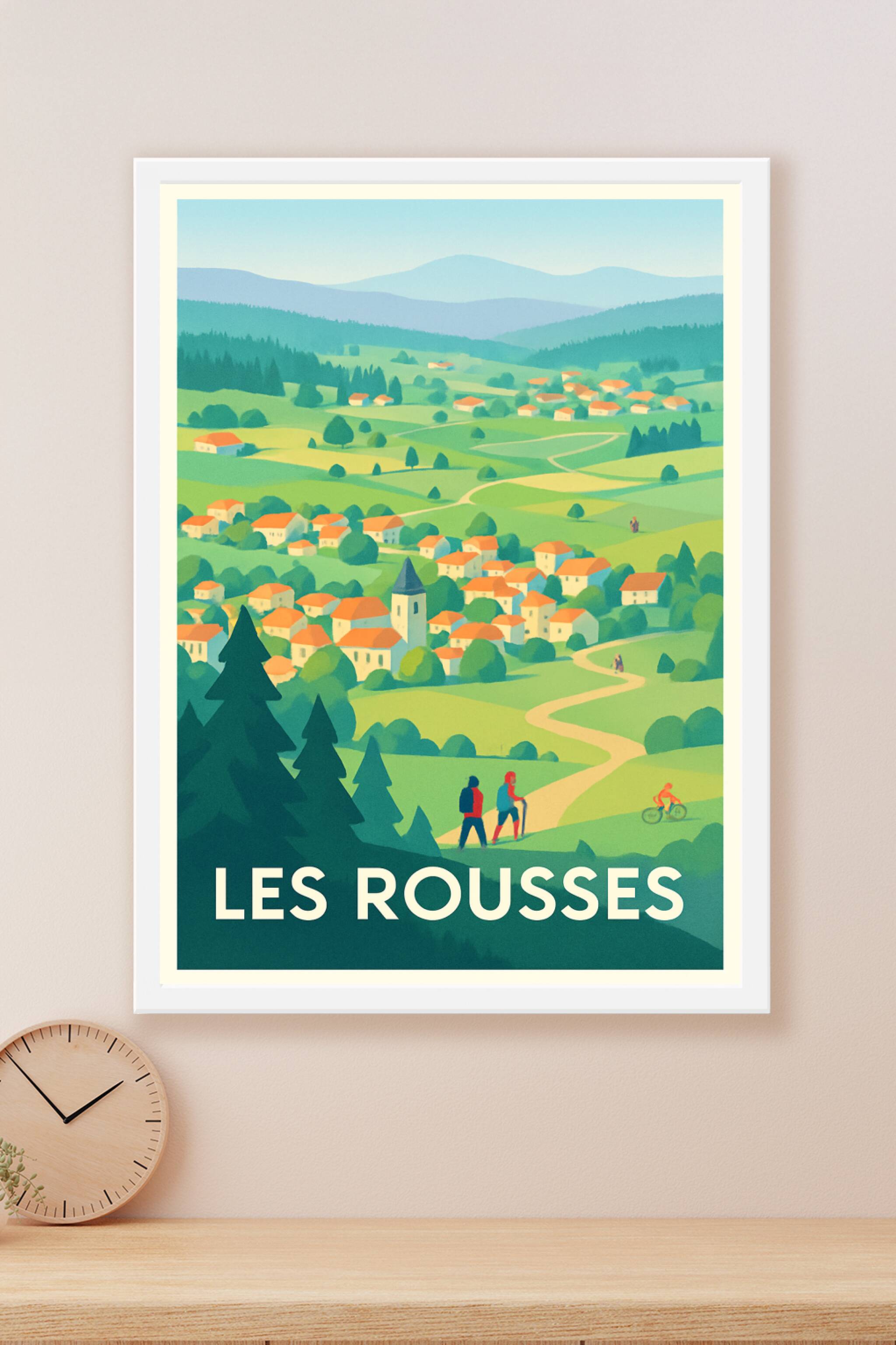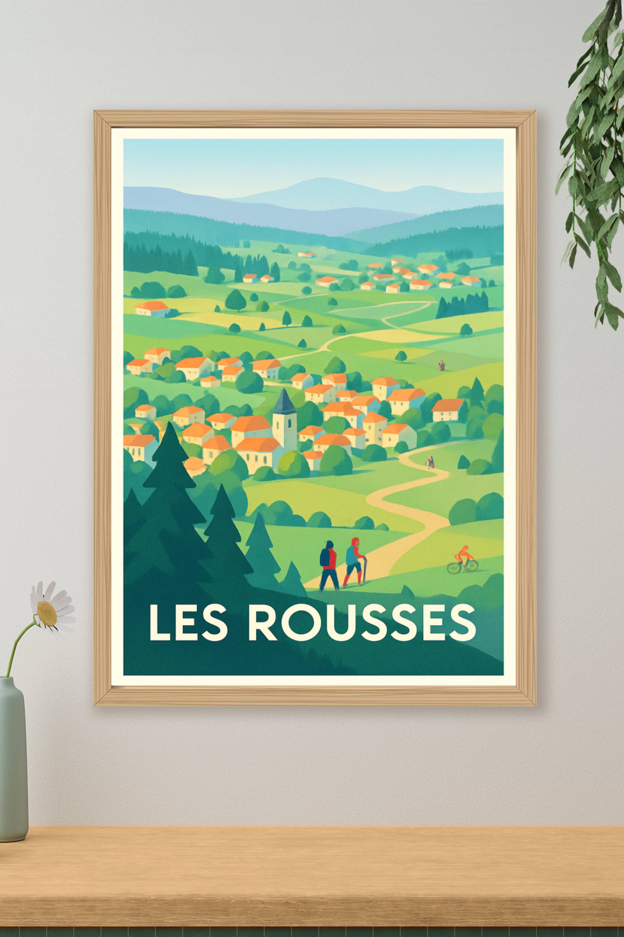 Découvrez le charme authentique du village des Rousses avec cette affiche illustrée qui capte l'essence paisible et verdoyante de cette région du J...