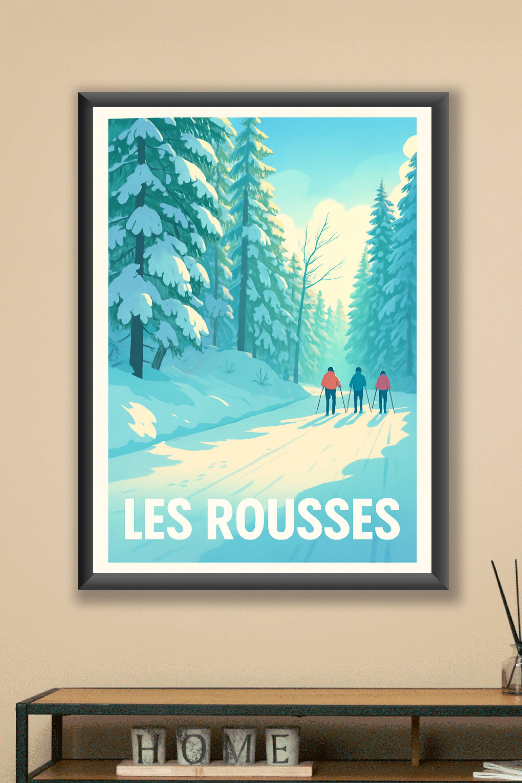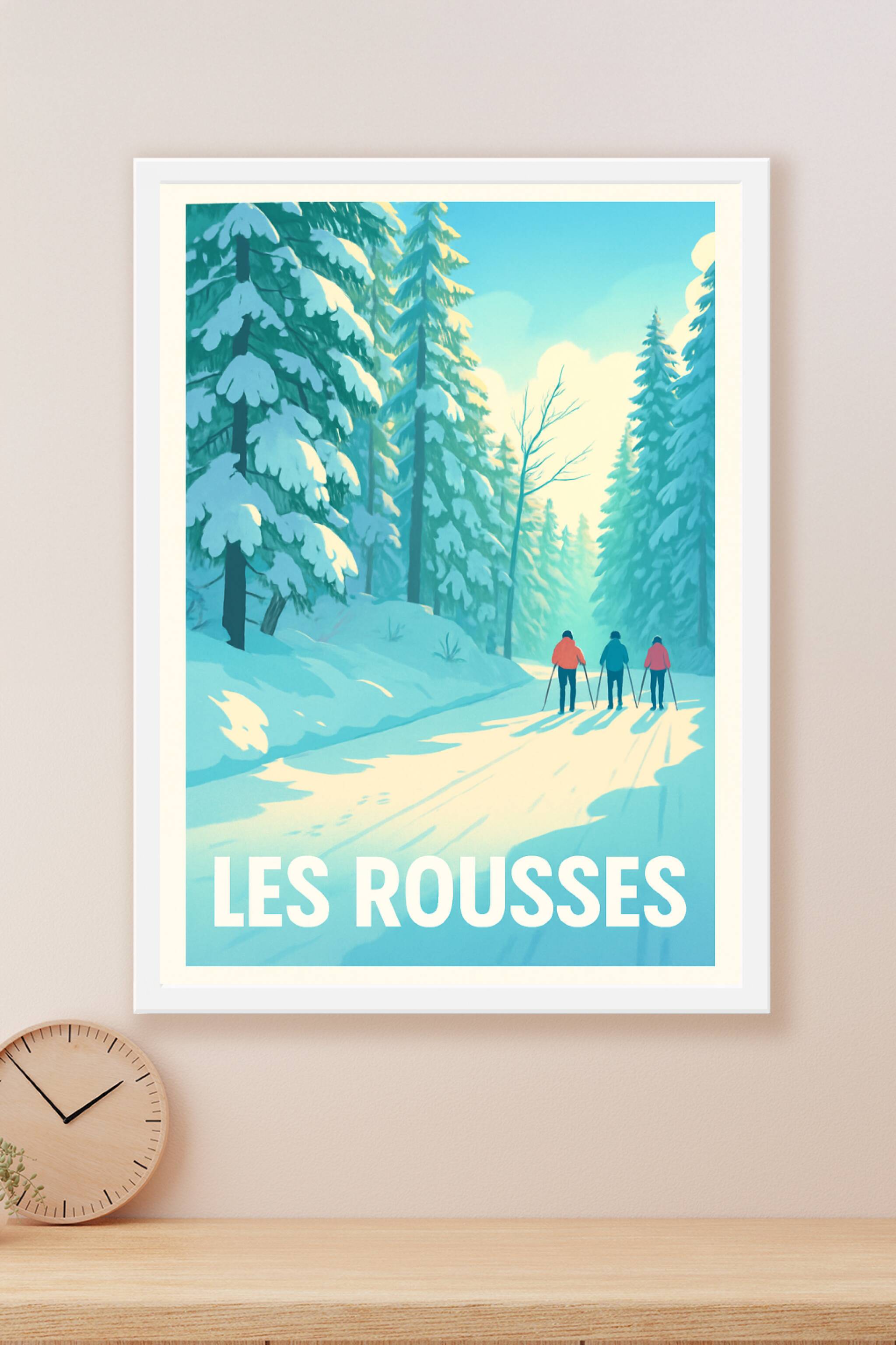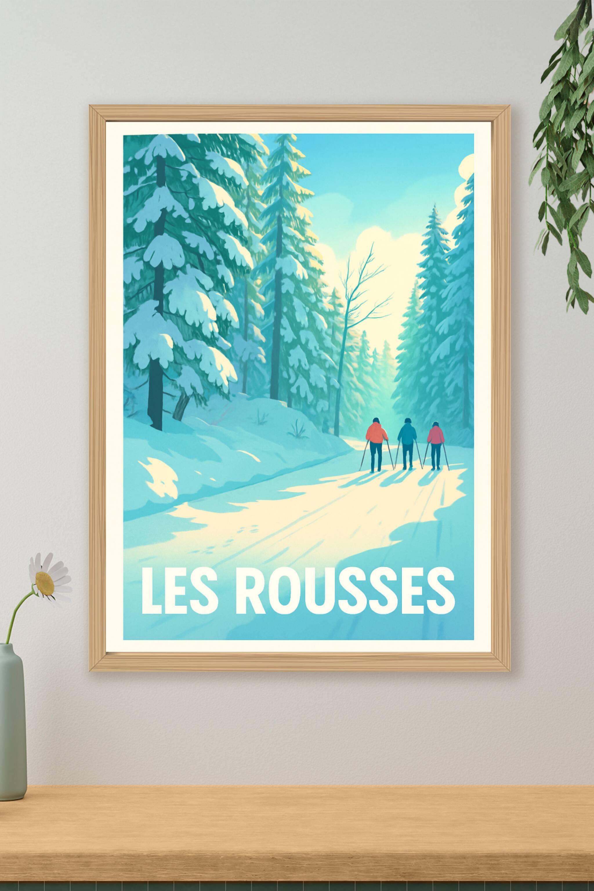 Découvrez la beauté sereine des paysages enneigés des Rousses avec ce poster illustré, mettant en scène des skieurs de fond évoluant sur une piste ...