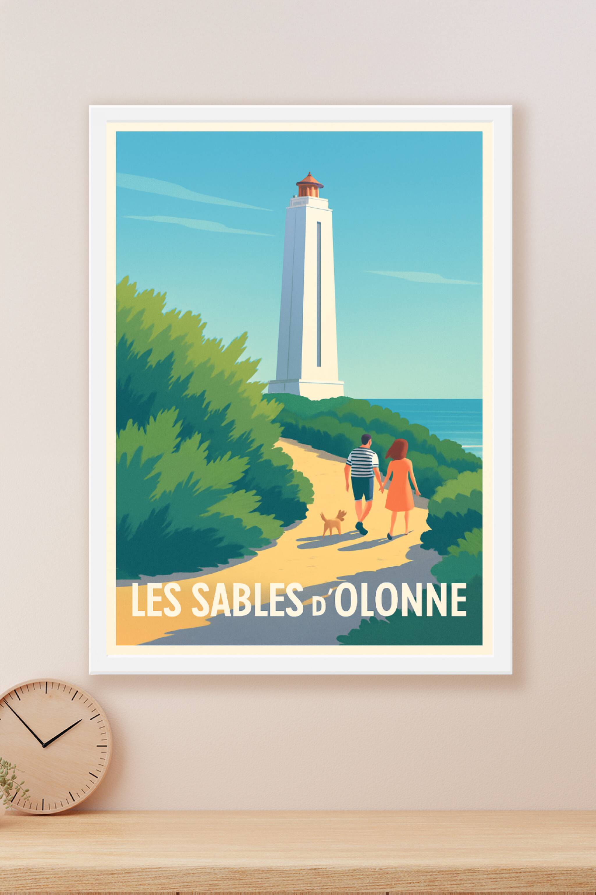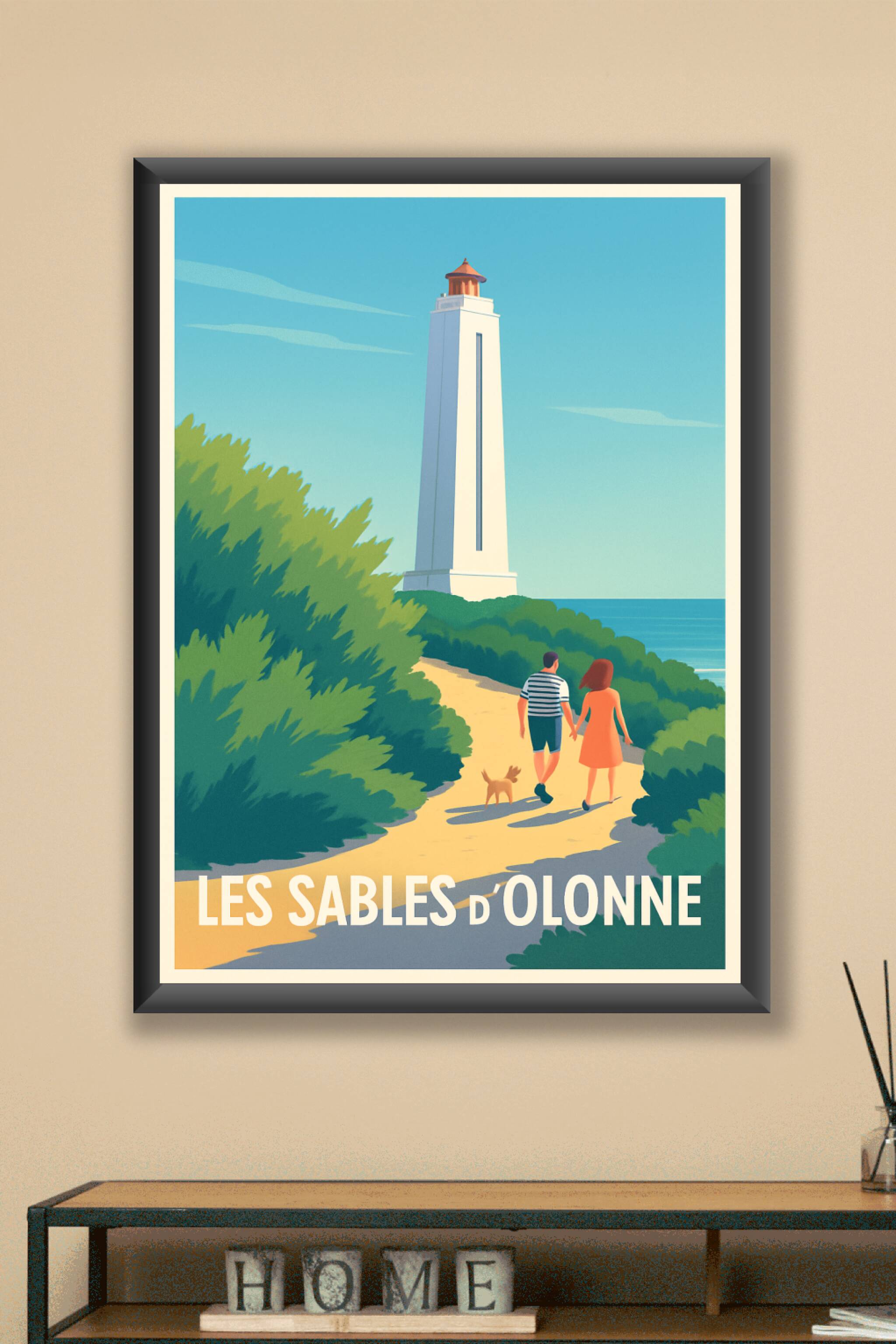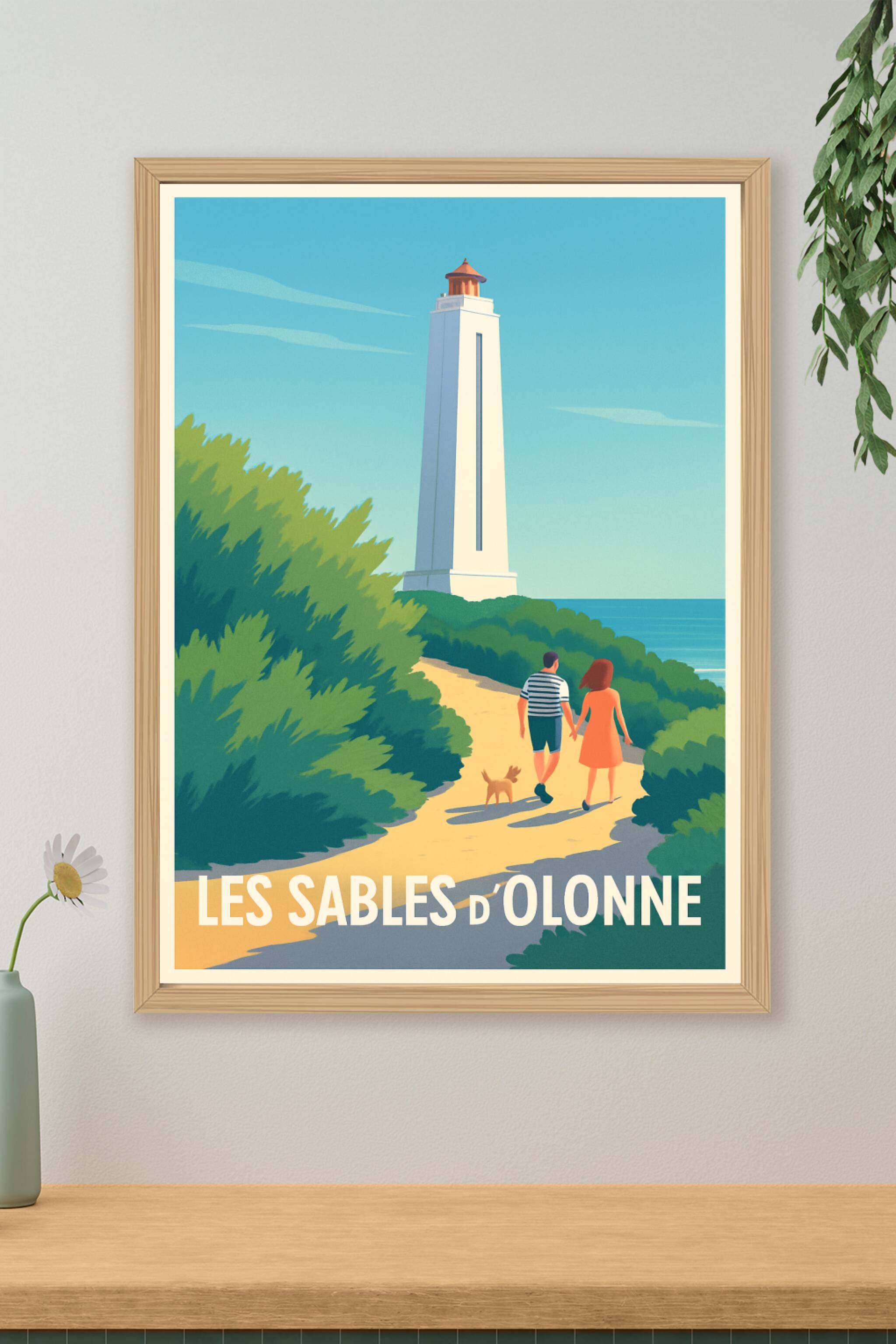 Découvrez la sérénité et l'élégance balnéaire de Les Sables d'Olonne avec cette affiche illustrée. Elle met en scène un couple flânant main dans la main, accompagné de leur chien, sur un sentier côtier bordé de verdure menant au phare emblématique de la ville. Ce poster à l'esthétique douce et lumineuse apportera une touche chaleureuse et iodée à votre décoration intérieure.Une qualité d'impression Fine Art sur papier 305g coton garantit des couleurs éclatantes et une longue tenue dans le temps. Disponible en formats A1 à A4, avec ou sans cadre, cette affiche est idéale pour offrir ou sublimer votre intérieur avec un souvenir authentique de Les Sables d'Olonne.