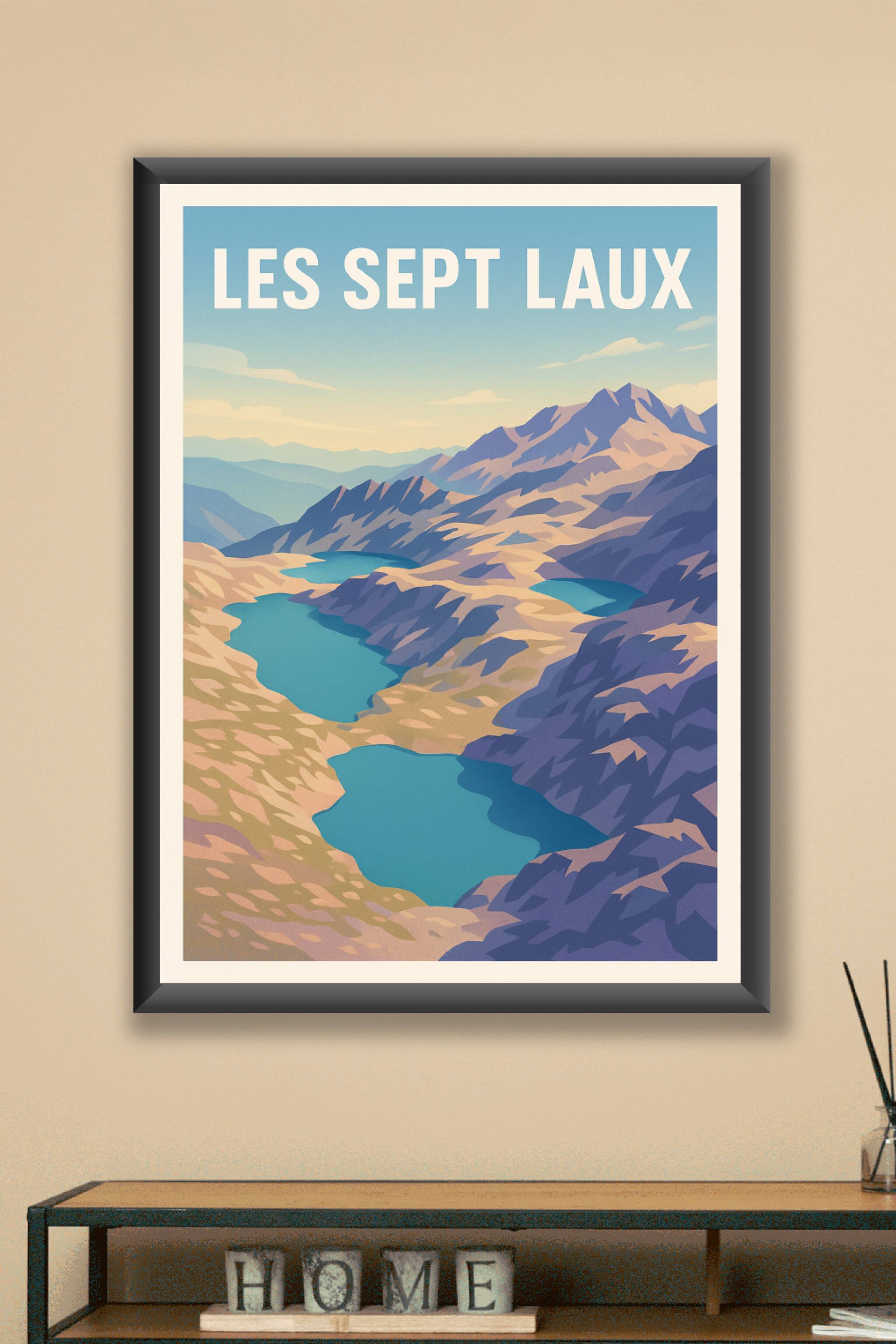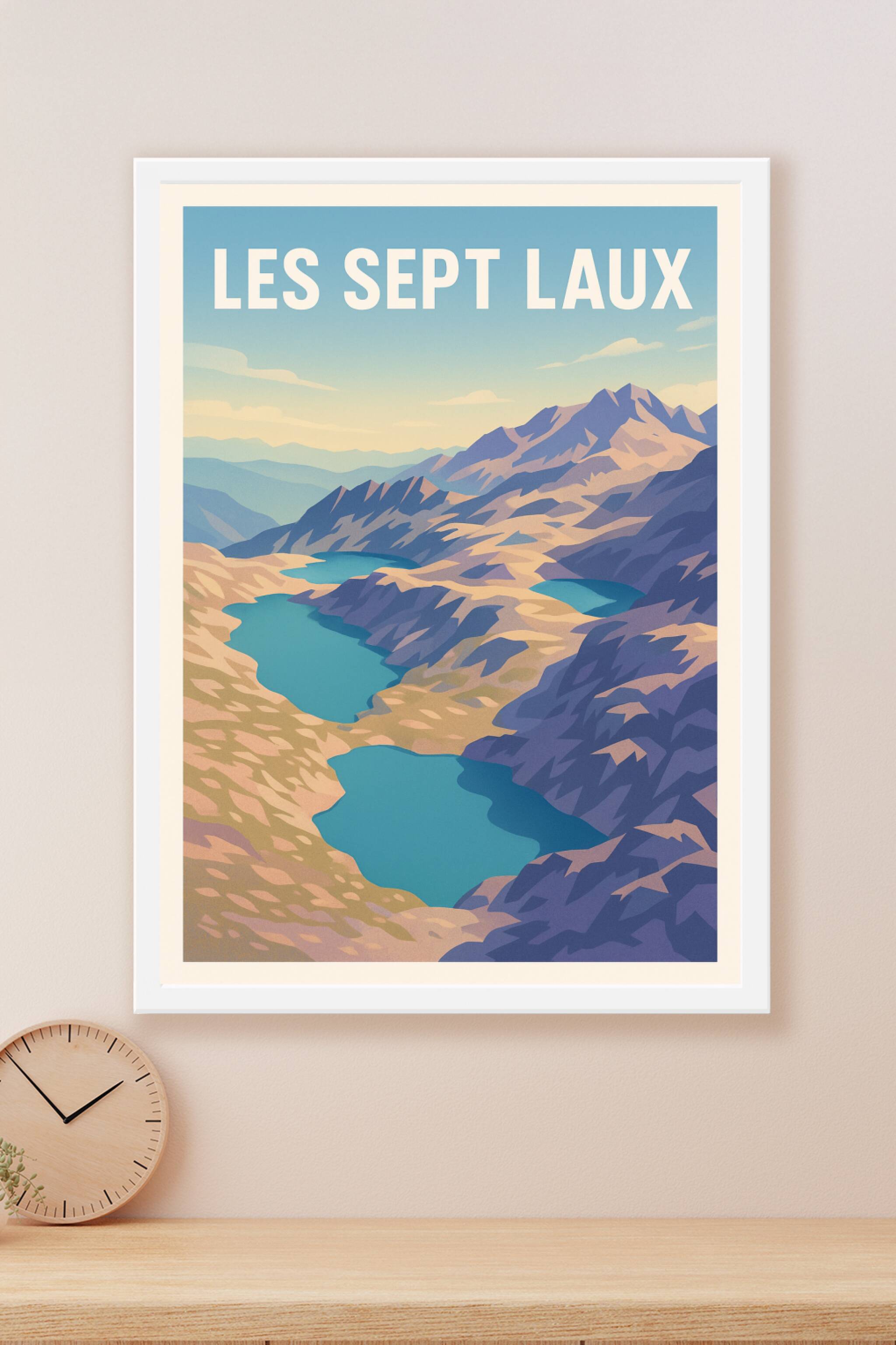 Découvrez la beauté sauvage des Sept Laux à travers ce poster illustré avec finesse, mettant en valeur ses lacs scintillants et ses paysages montag...