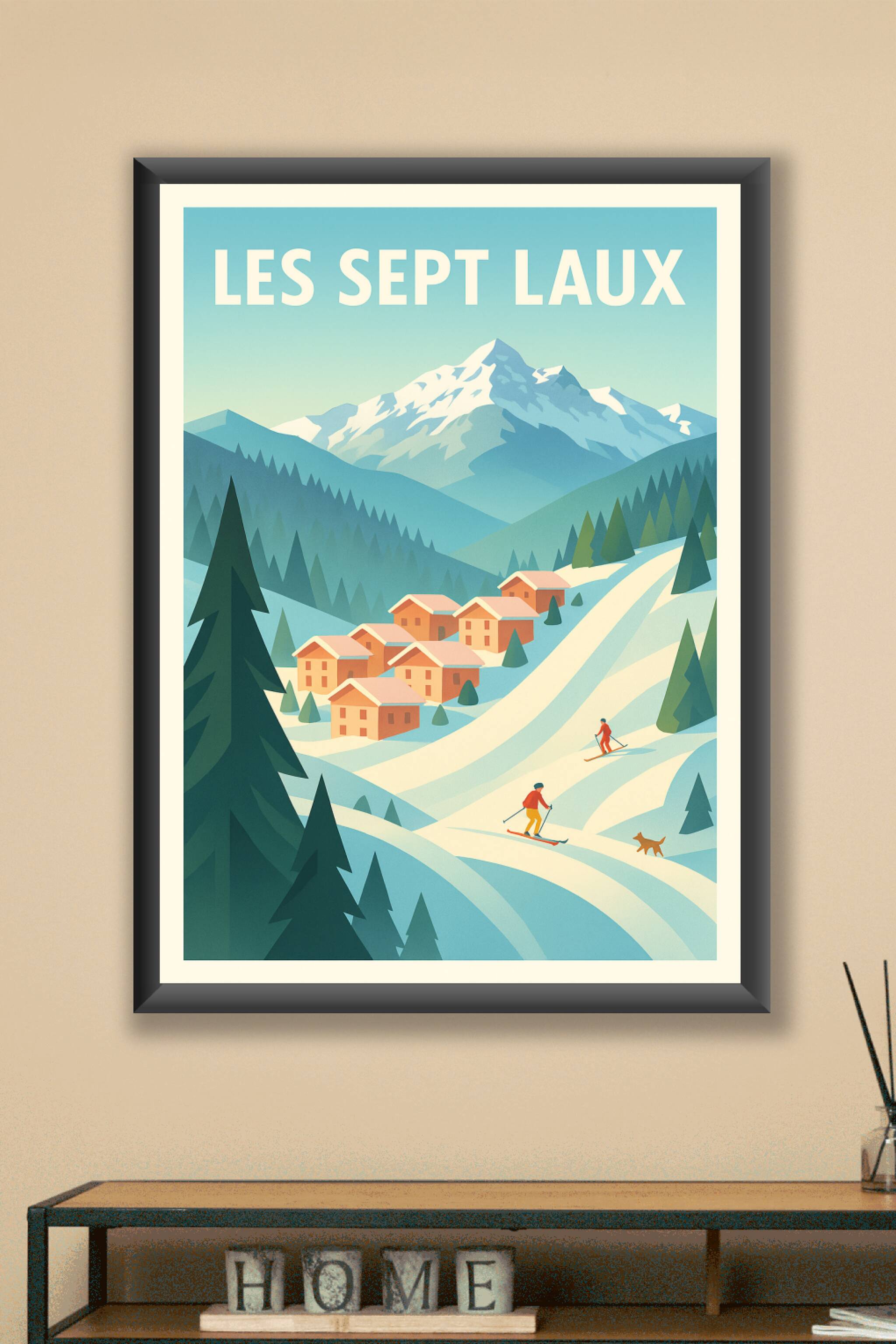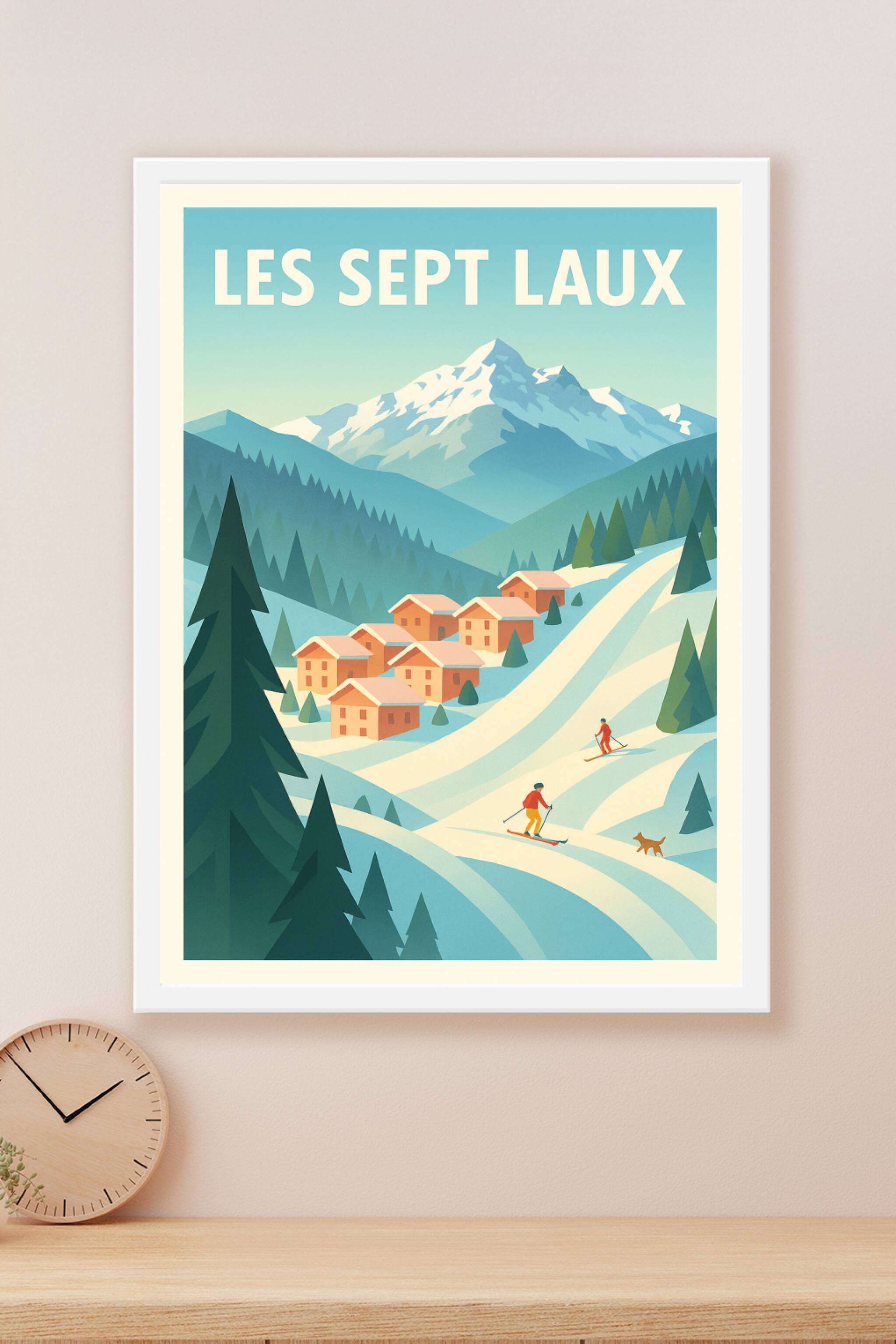 Découvrez l'atmosphère paisible et enneigée des Sept Laux avec cette affiche au design rétro et épuré. Ce poster met en scène un charmant village d...