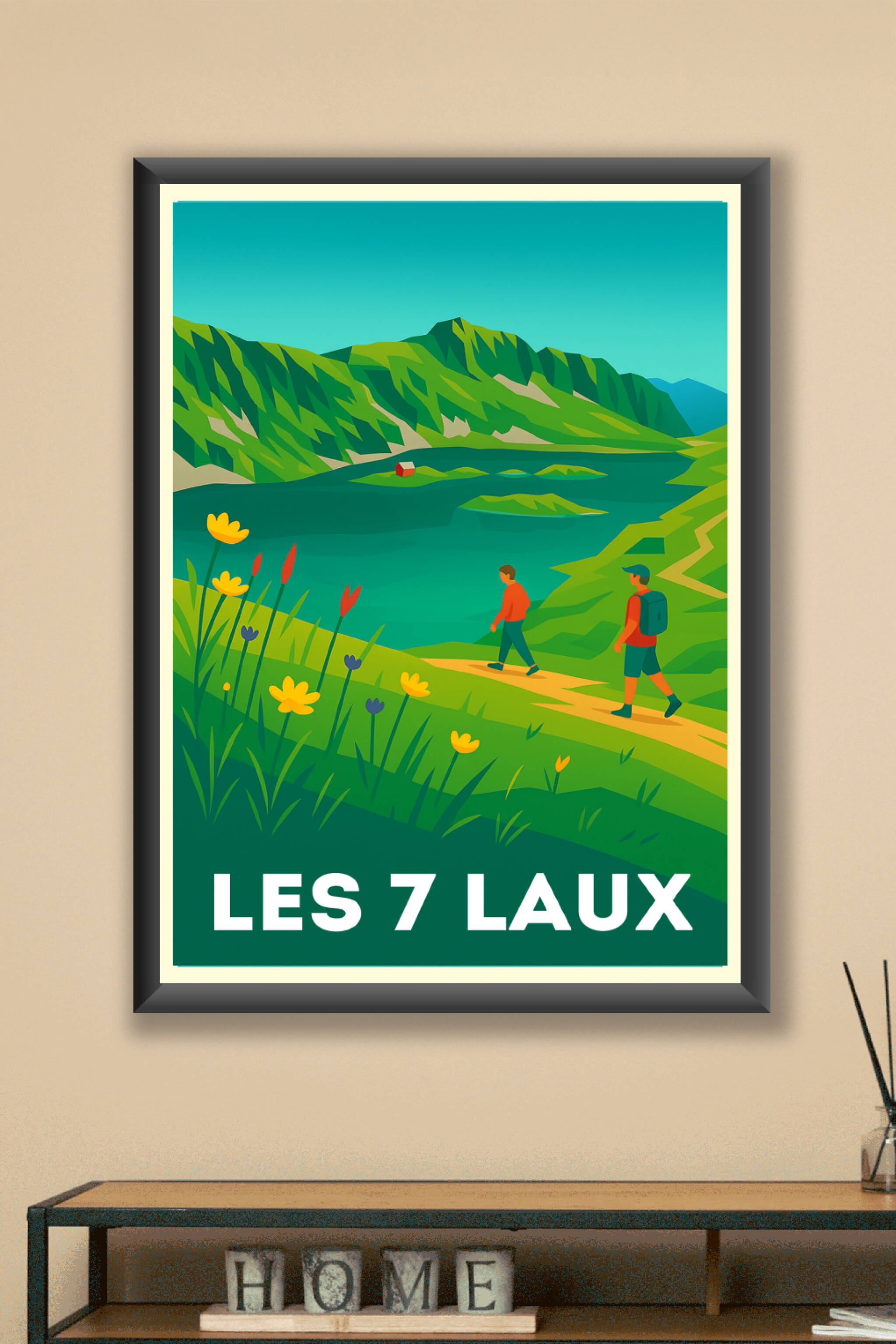 Découvrez la beauté naturelle des Sept Laux avec cette affiche illustrée représentant un paysage de montagne verdoyant et un lac bleu profond. Parf...