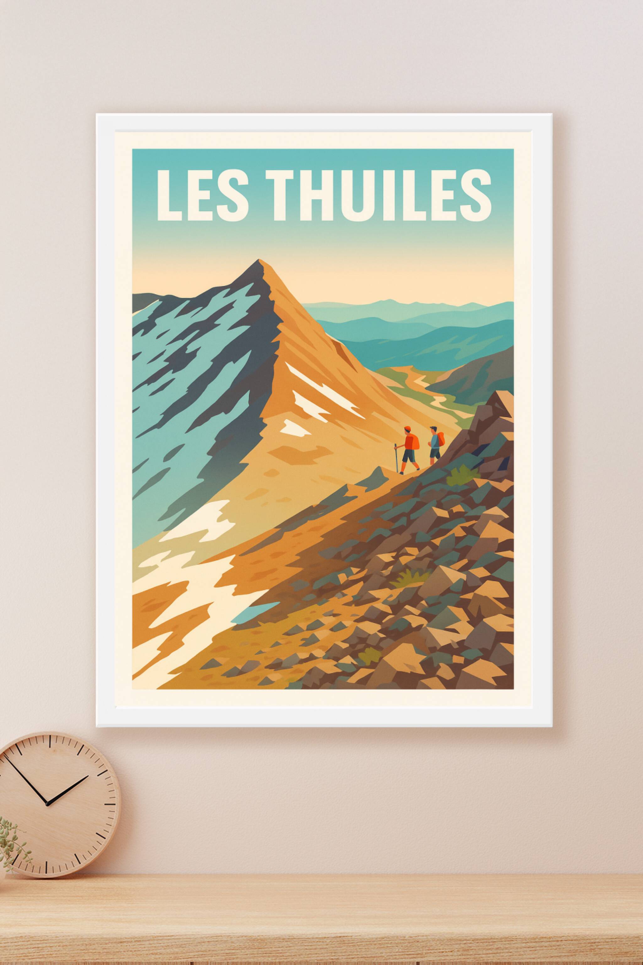 Découvrez la beauté sauvage des hauteurs alpines avec cette affiche Les Thuiles illustrant un paysage de montagne aux couleurs vibrantes, où deux r...