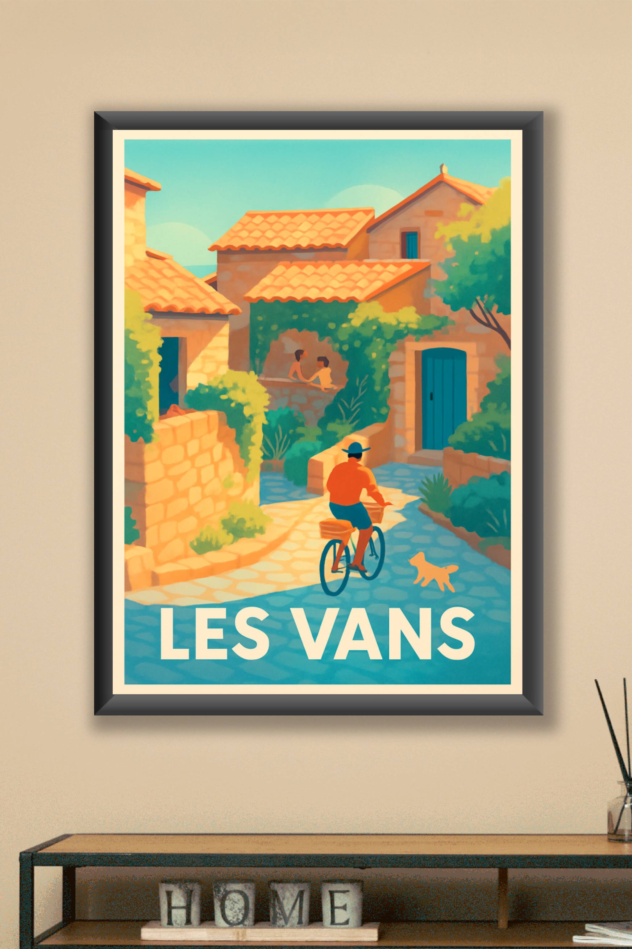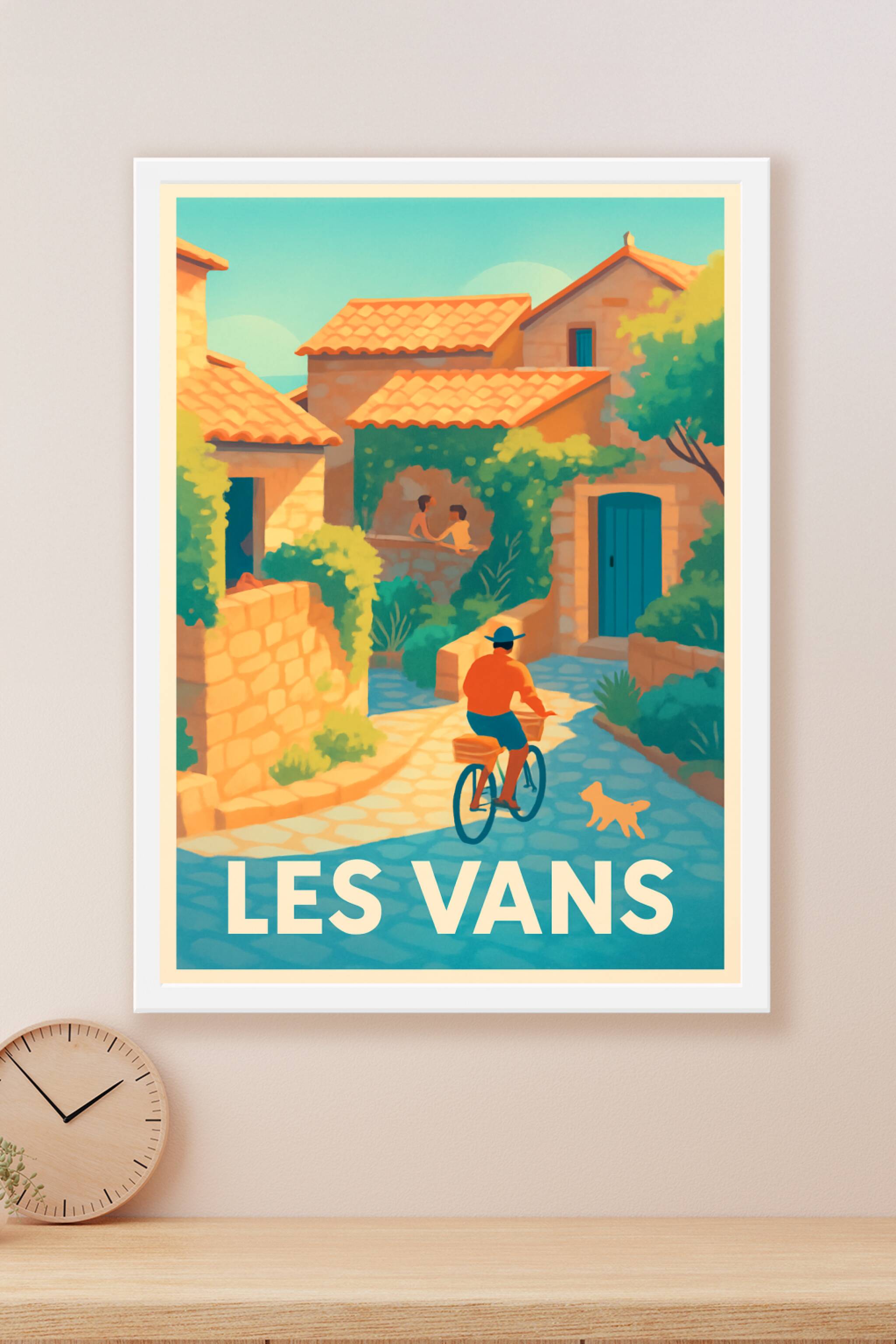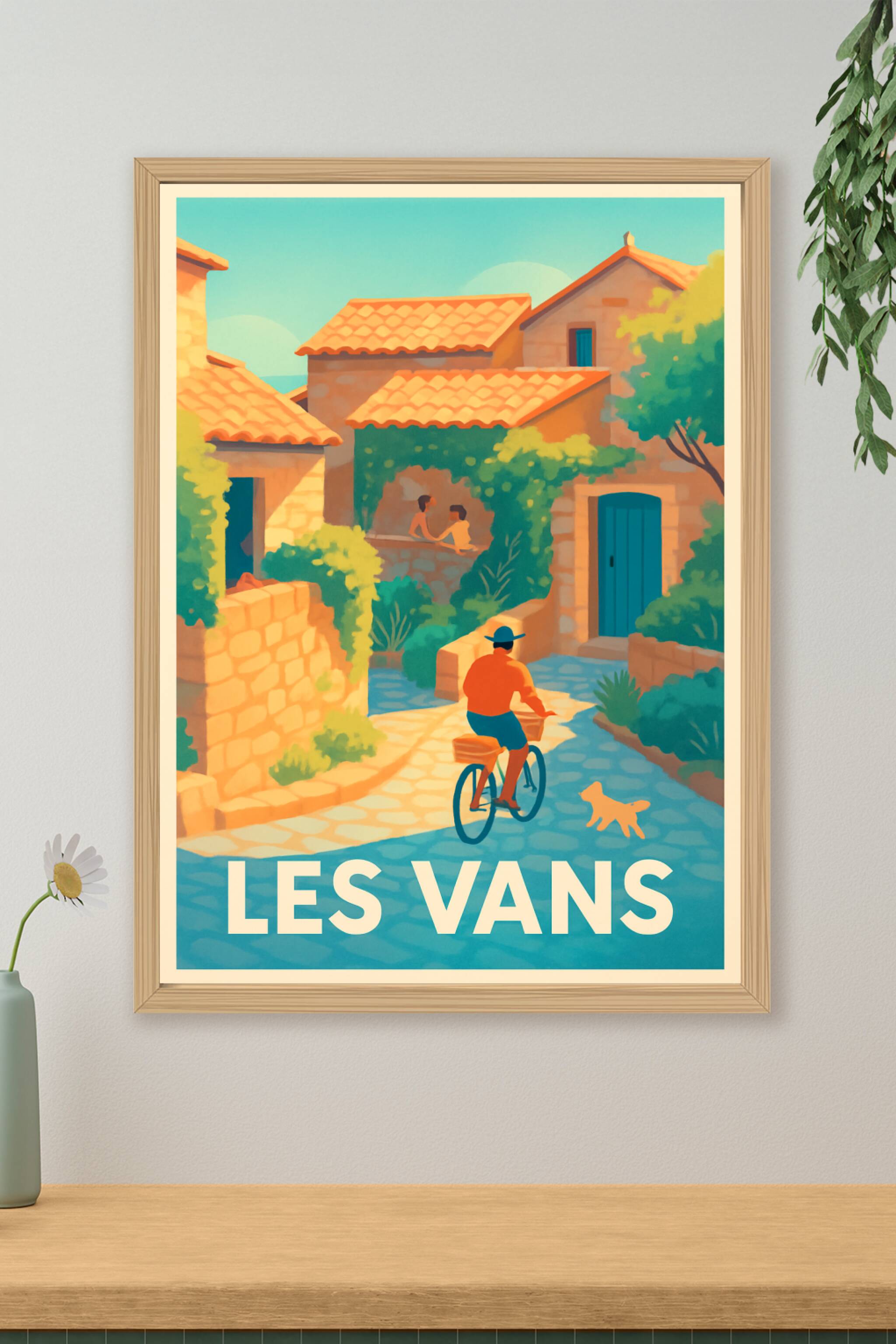 Découvrez l'ambiance paisible et chaleureuse de Les Vans avec cette affiche illustrée aux teintes douces et lumineuses, représentant une scène typi...