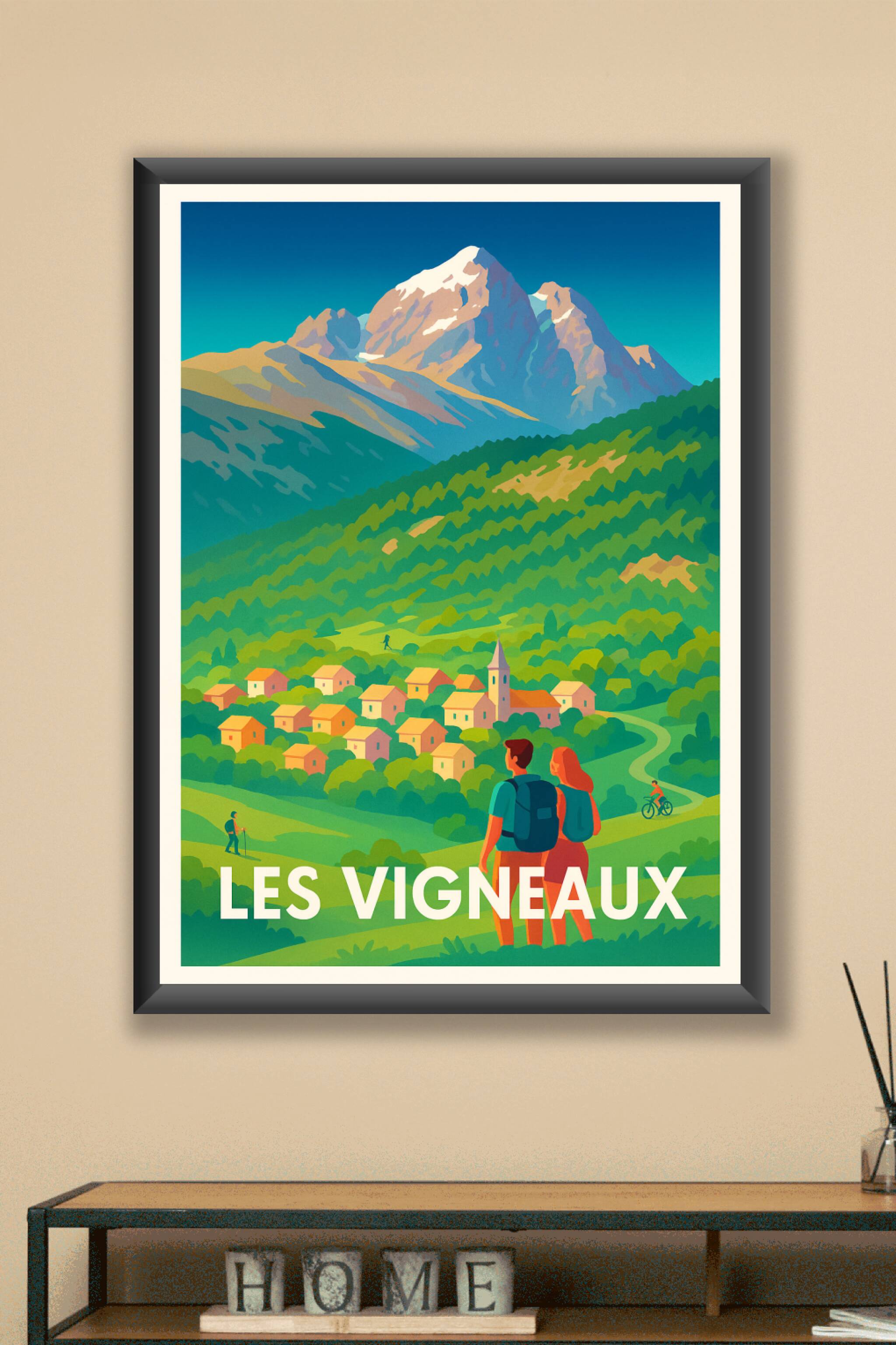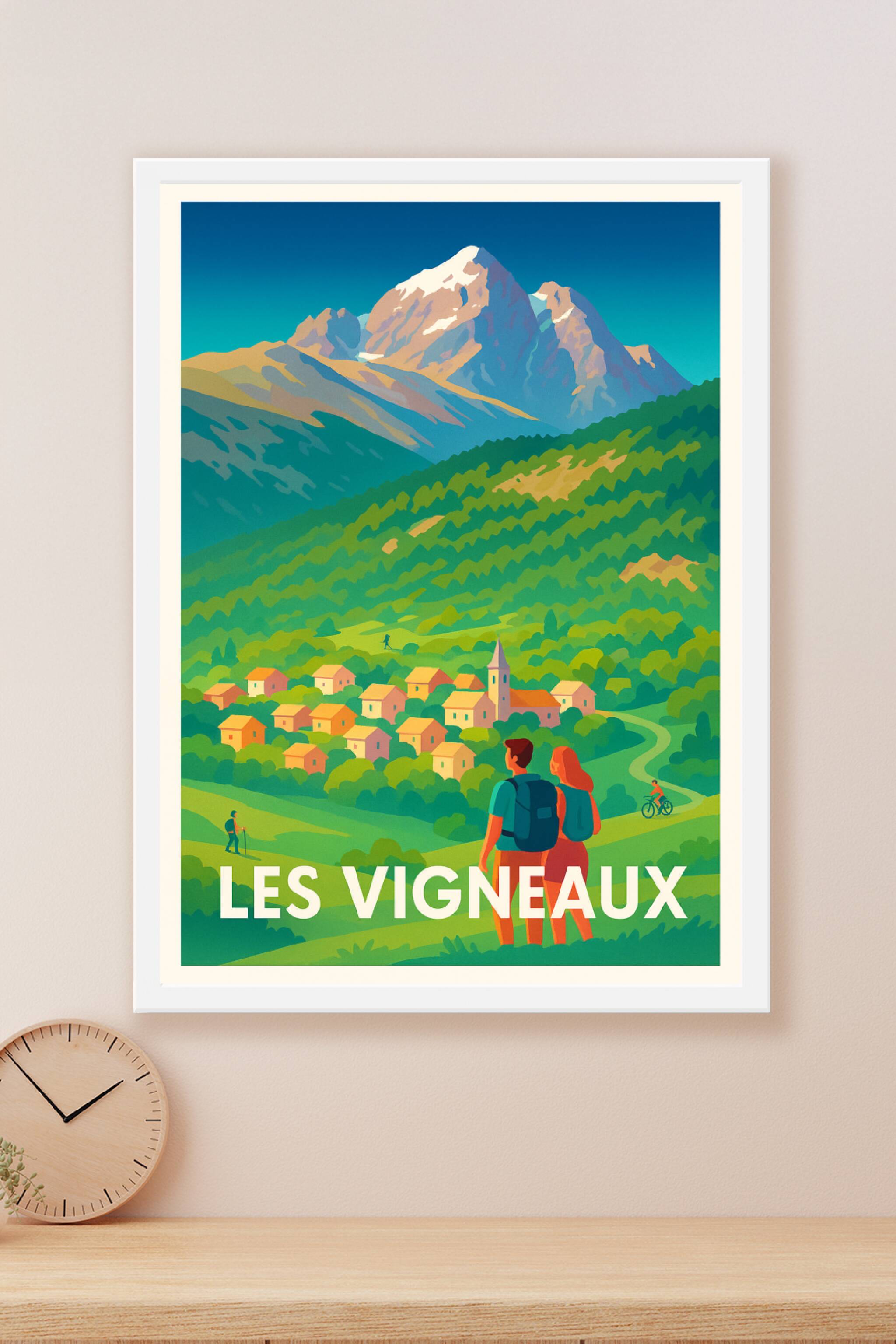 Découvrez la merveilleuse vallée alpine de Les Vigneaux avec ce poster illustré aux couleurs vives et aux formes douces, représentant un décor mont...