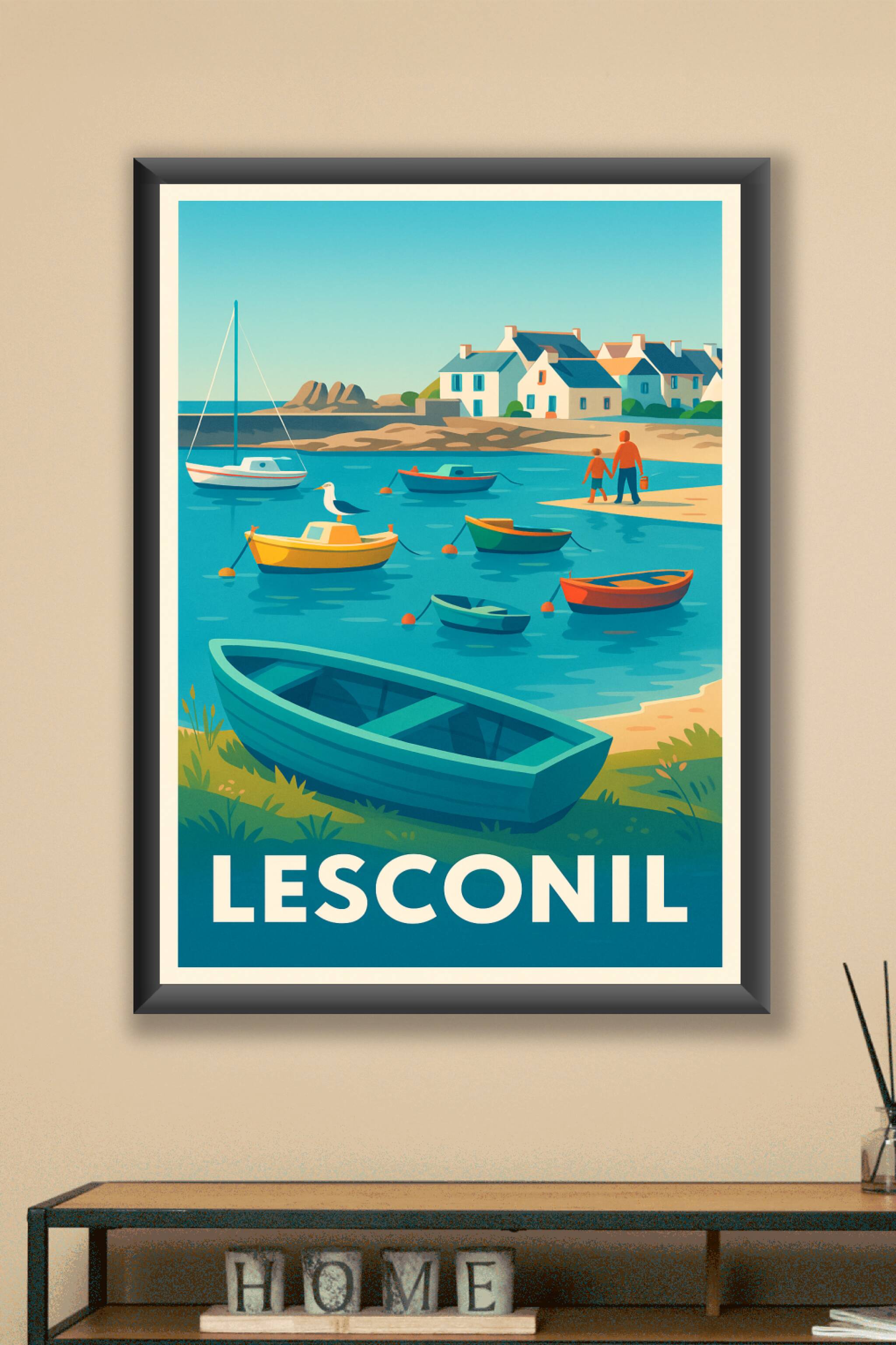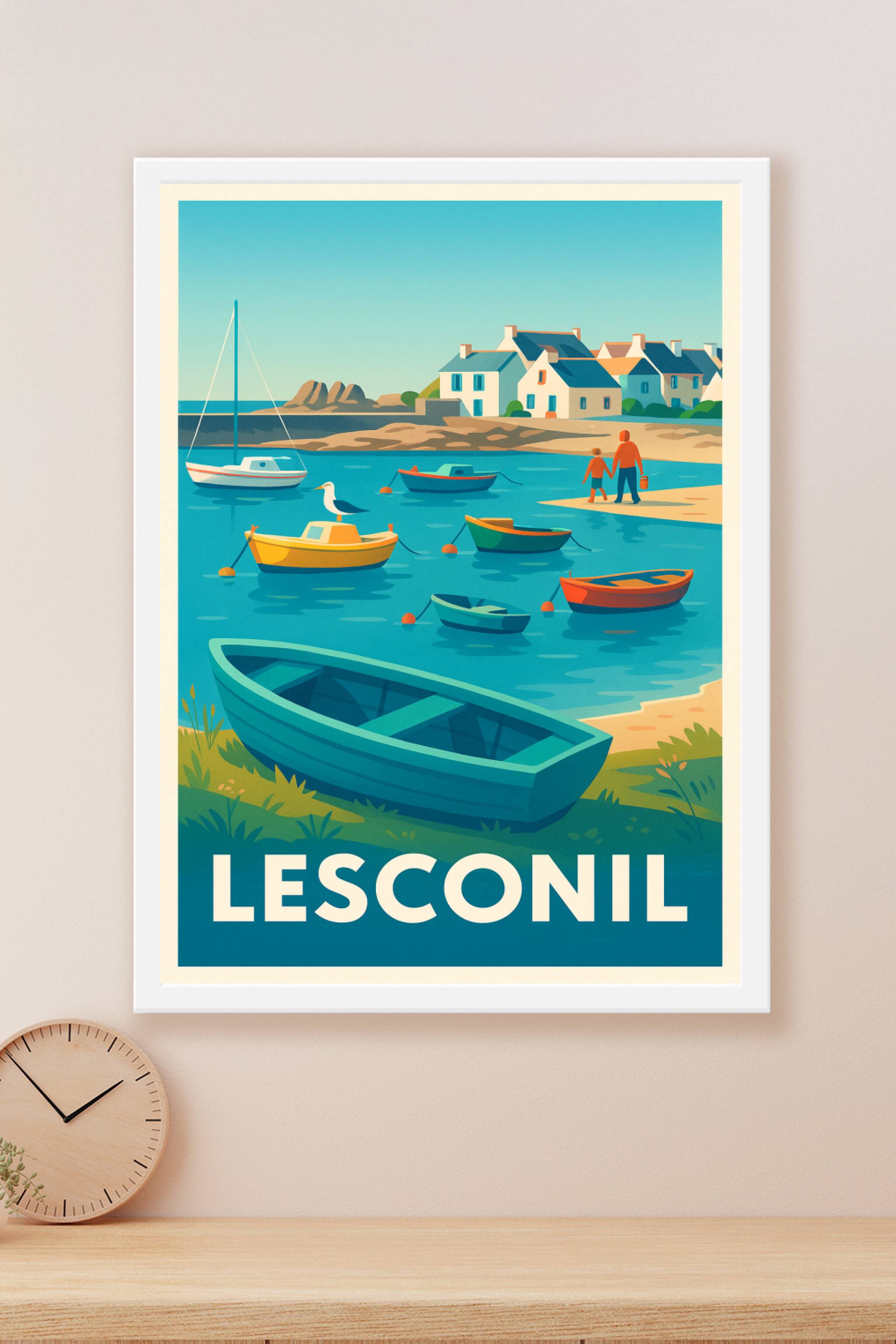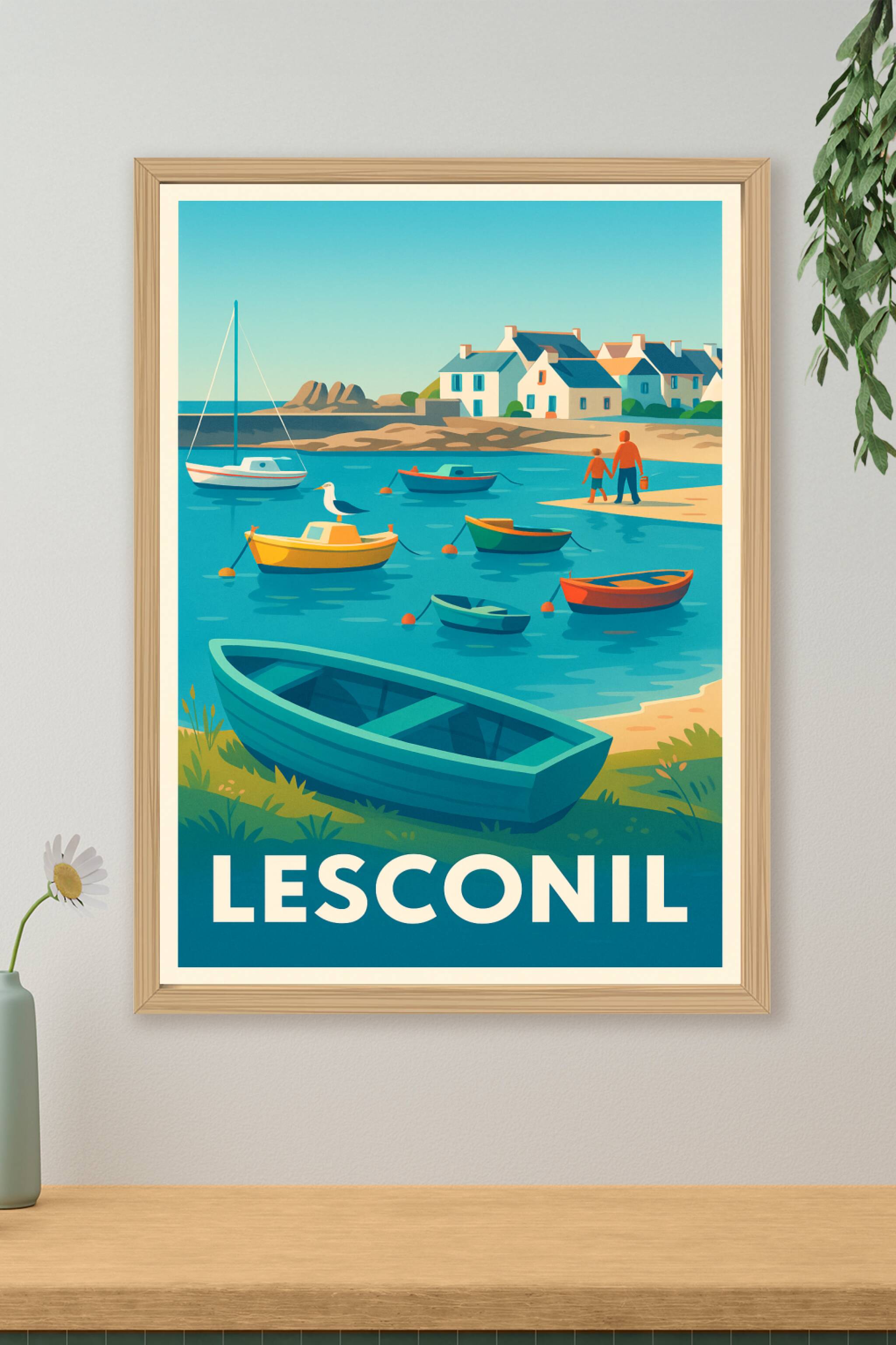 Découvrez la sérénité de la charmante ville côtière de Lesconil avec cette affiche illustrée où bateaux colorés et maisons traditionnelles composen...