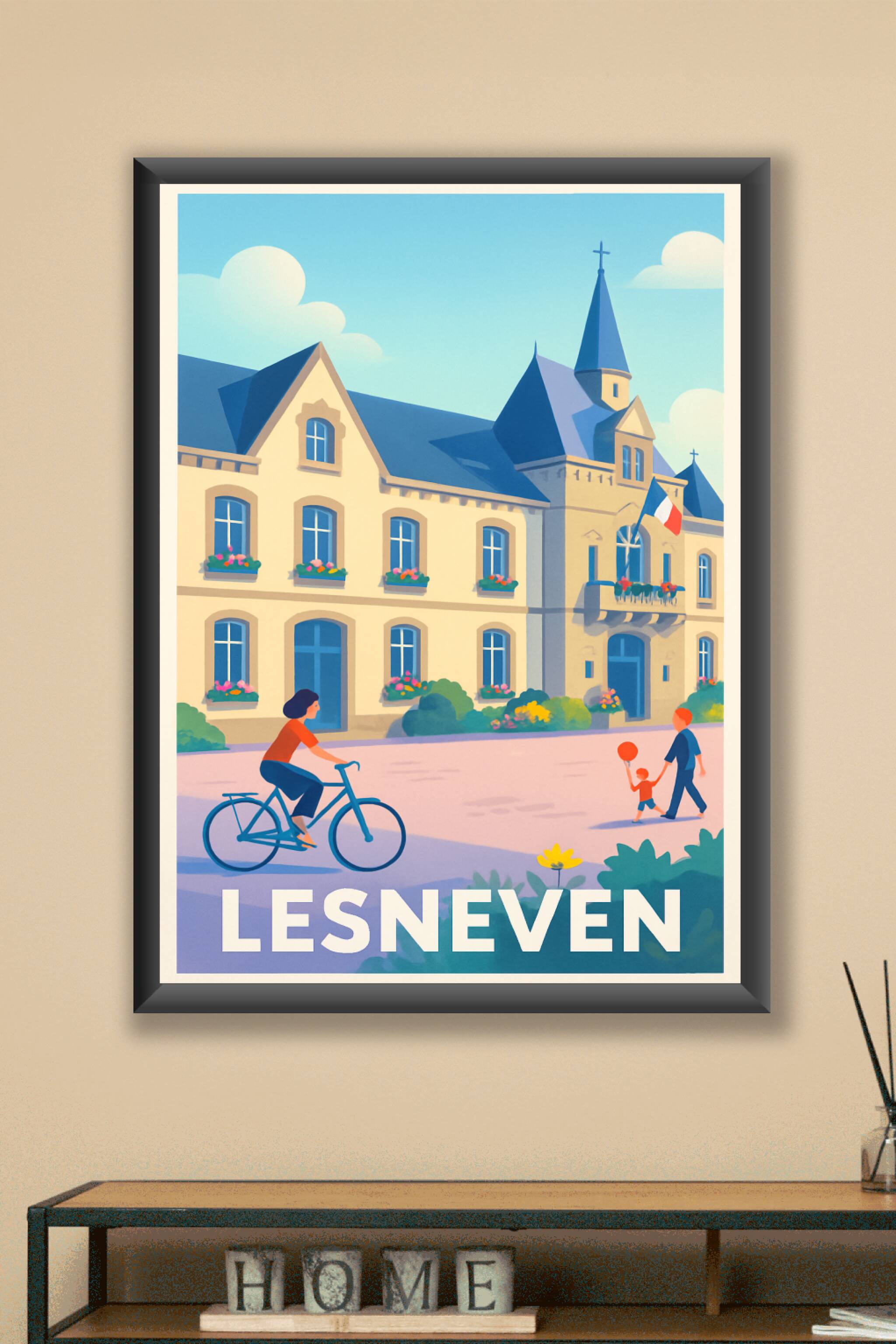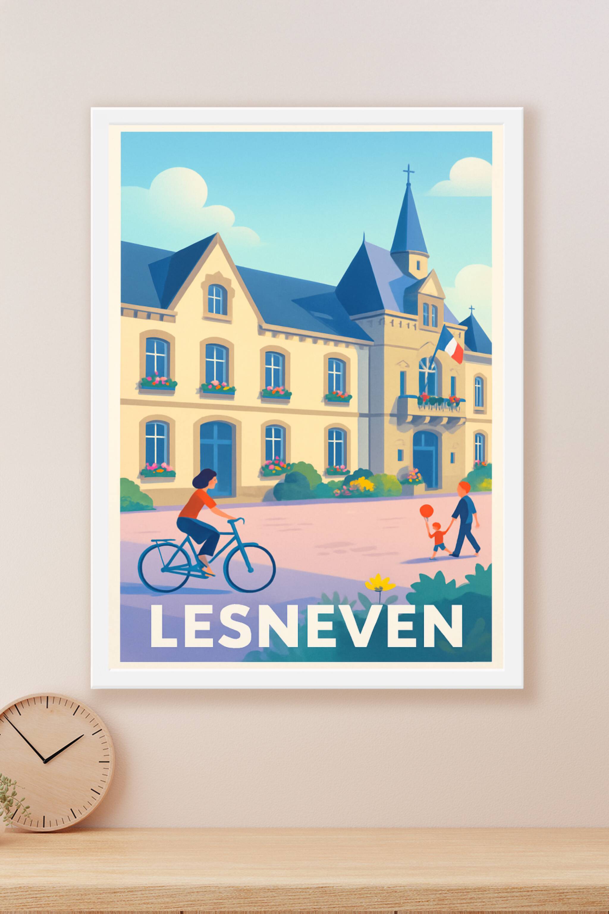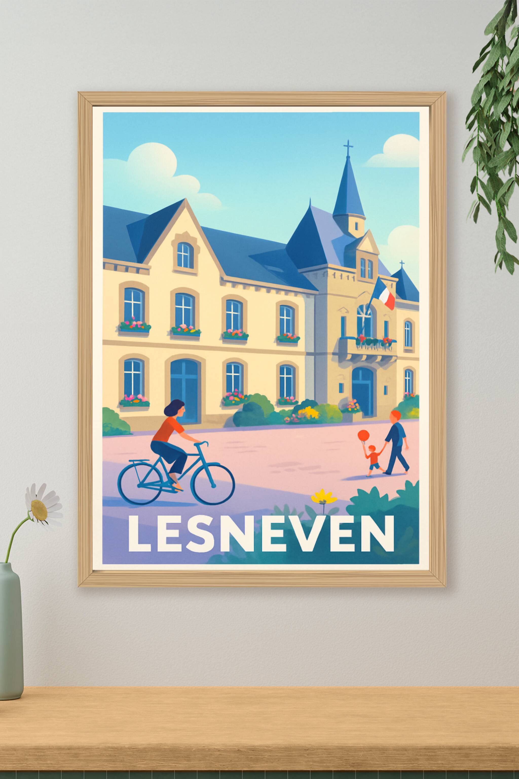 Découvrez l'élégance et la tranquillité de la ville de Lesneven à travers cette affiche illustrée mettant en scène ses bâtiments emblématiques et la vie locale paisible. Le style doux et coloré de ce poster fait ressortir le charme typique de cette petite cité bretonne, avec ses maisons fleuries, une balade à vélo et un moment de complicité familiale.Cette affiche est imprimée en tirage "Fine Art" sur un papier 305g coton de haute qualité qui garantit des couleurs vibrantes et une excellente longévité. Disponible en formats A1 à A4, avec ou sans cadre, elle est parfaite pour apporter une touche authentique et chaleureuse à votre intérieur ou comme cadeau souvenir.La qualité d'impression premium, 100% fabriquée en France, sublime ce poster pour ravir les amoureux de la Bretagne et de ses paysages apaisants.