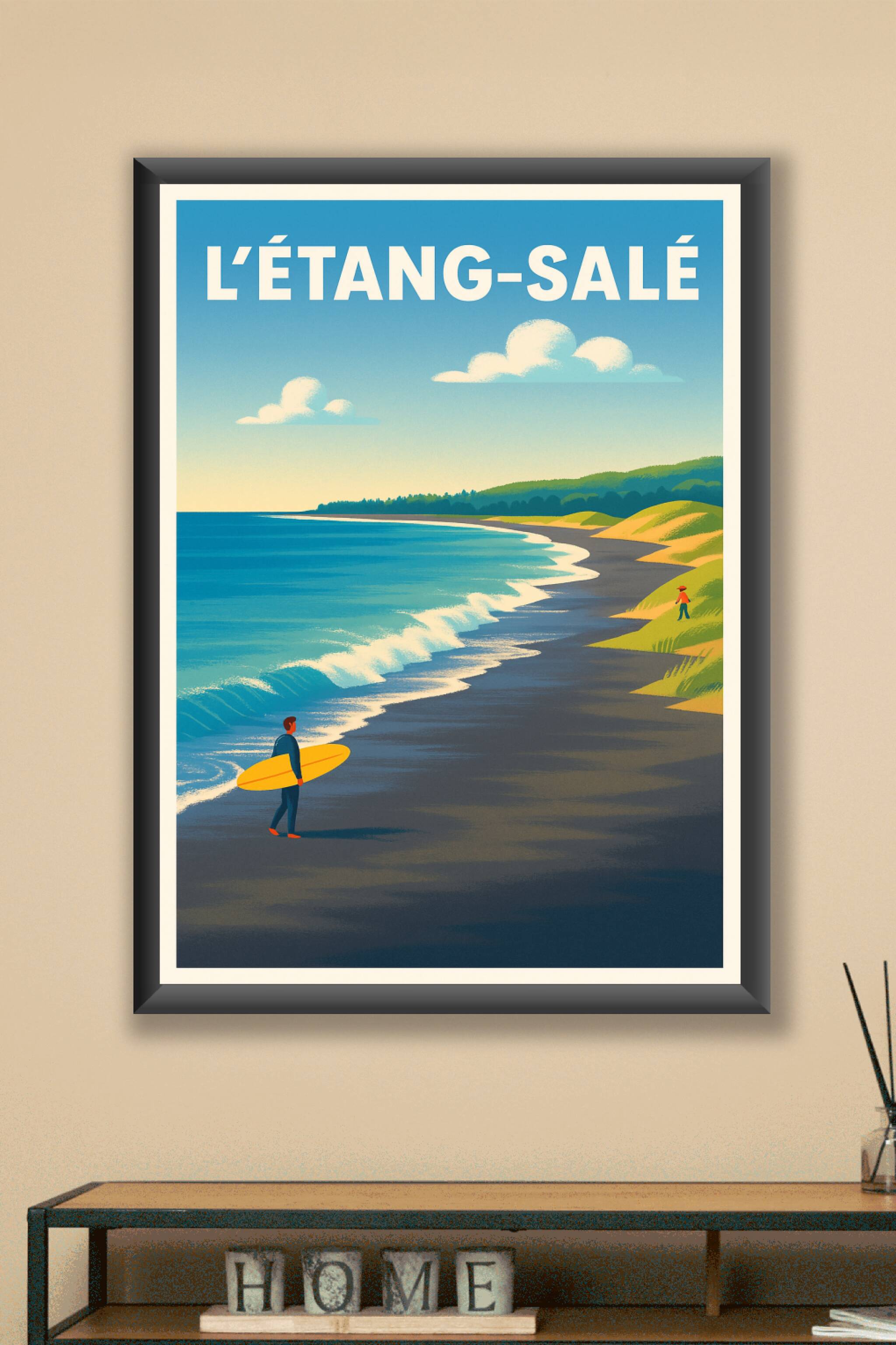 Découvrez la beauté sauvage de L'Étang-Salé avec cette affiche au style vintage évoquant l'appel de l'océan et des plages vallonnées. Le poster met en scène un surfeur prêt à dompter les vagues dans un décor naturel d'exception. Imprimé en tirage "Fine Art" sur papier coton 305g, ce poster offre une qualité d'impression exceptionnelle alliant finesse des détails et vivacité des couleurs. Disponible en formats A1 à A4, avec ou sans cadre, cette affiche apporte une touche d'aventure maritime et de sérénité à votre intérieur ou bureau. Une décoration premium, 100% fabriquée en France, parfaite pour les passionnés de surf et les amoureux des paysages côtiers.