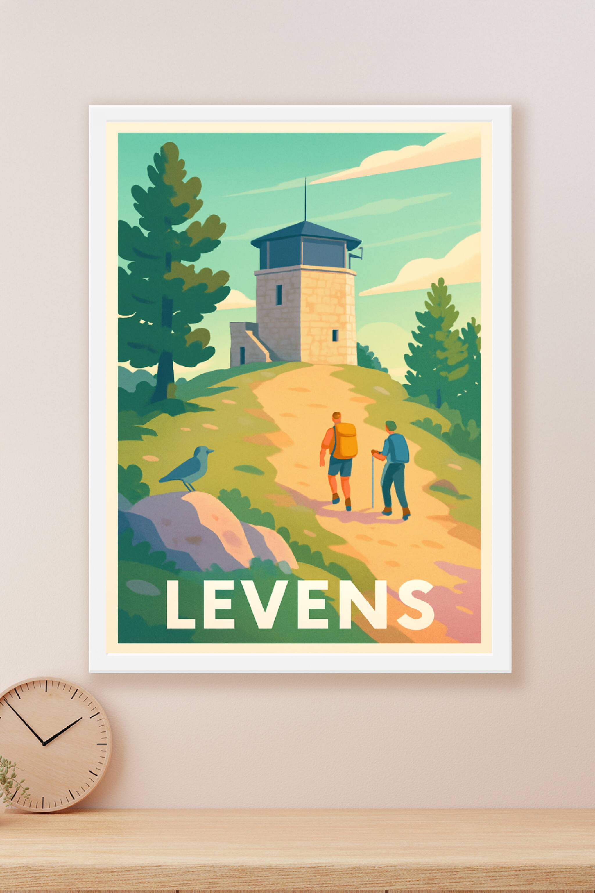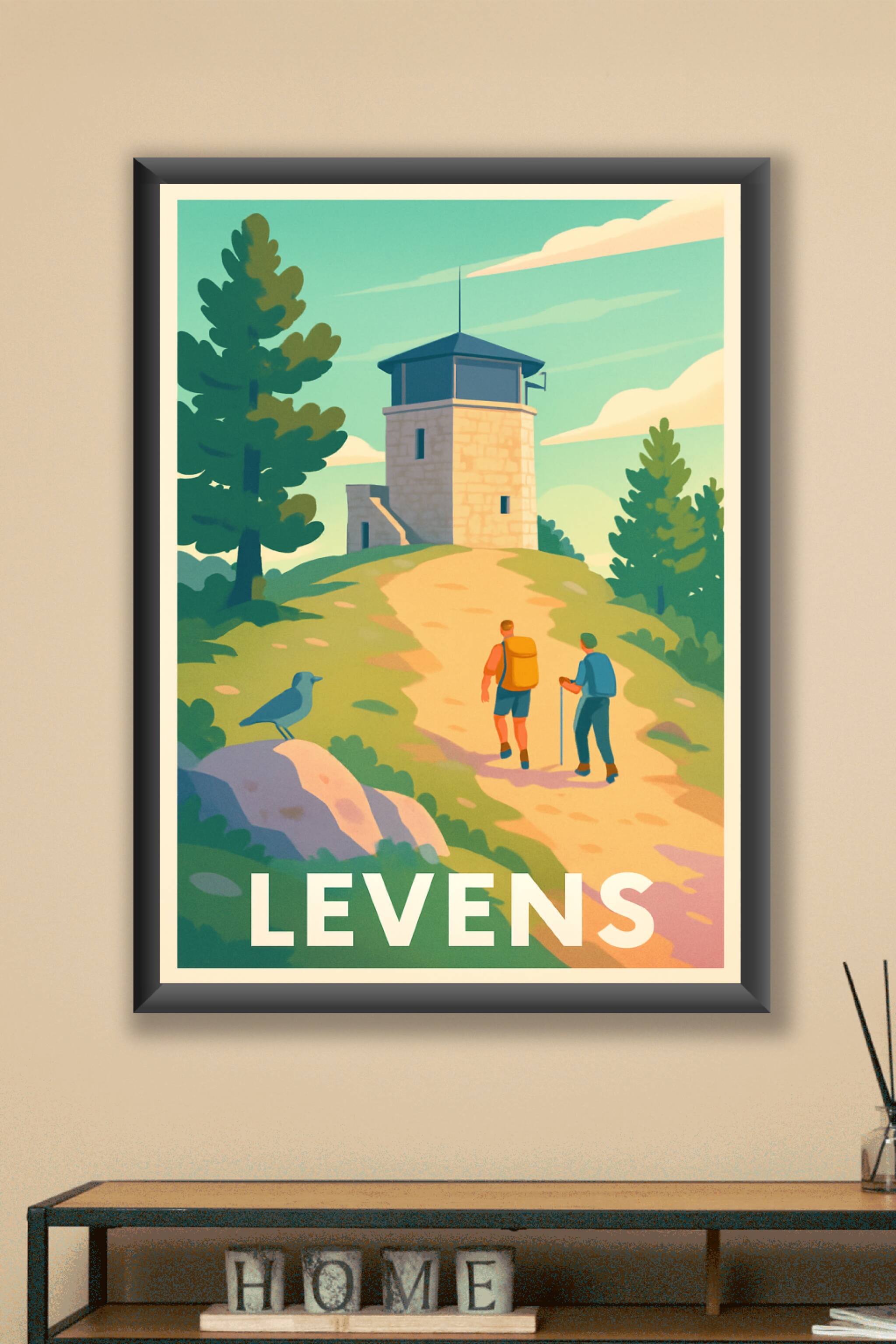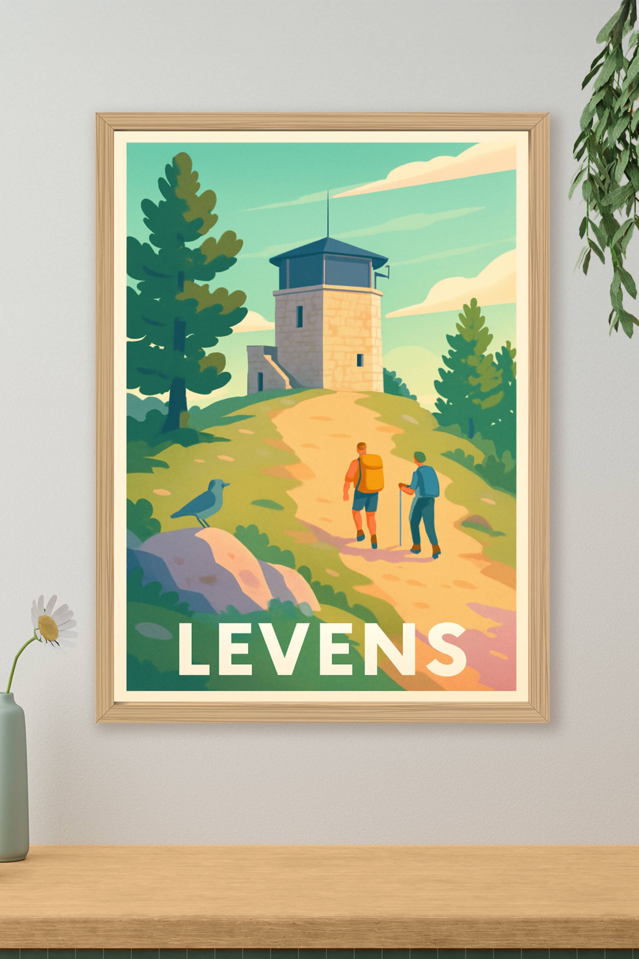 Découvrez l'atmosphère paisible et inspirante de Levens avec cette affiche illustrée mettant en scène une tour emblématique entourée d'une nature v...