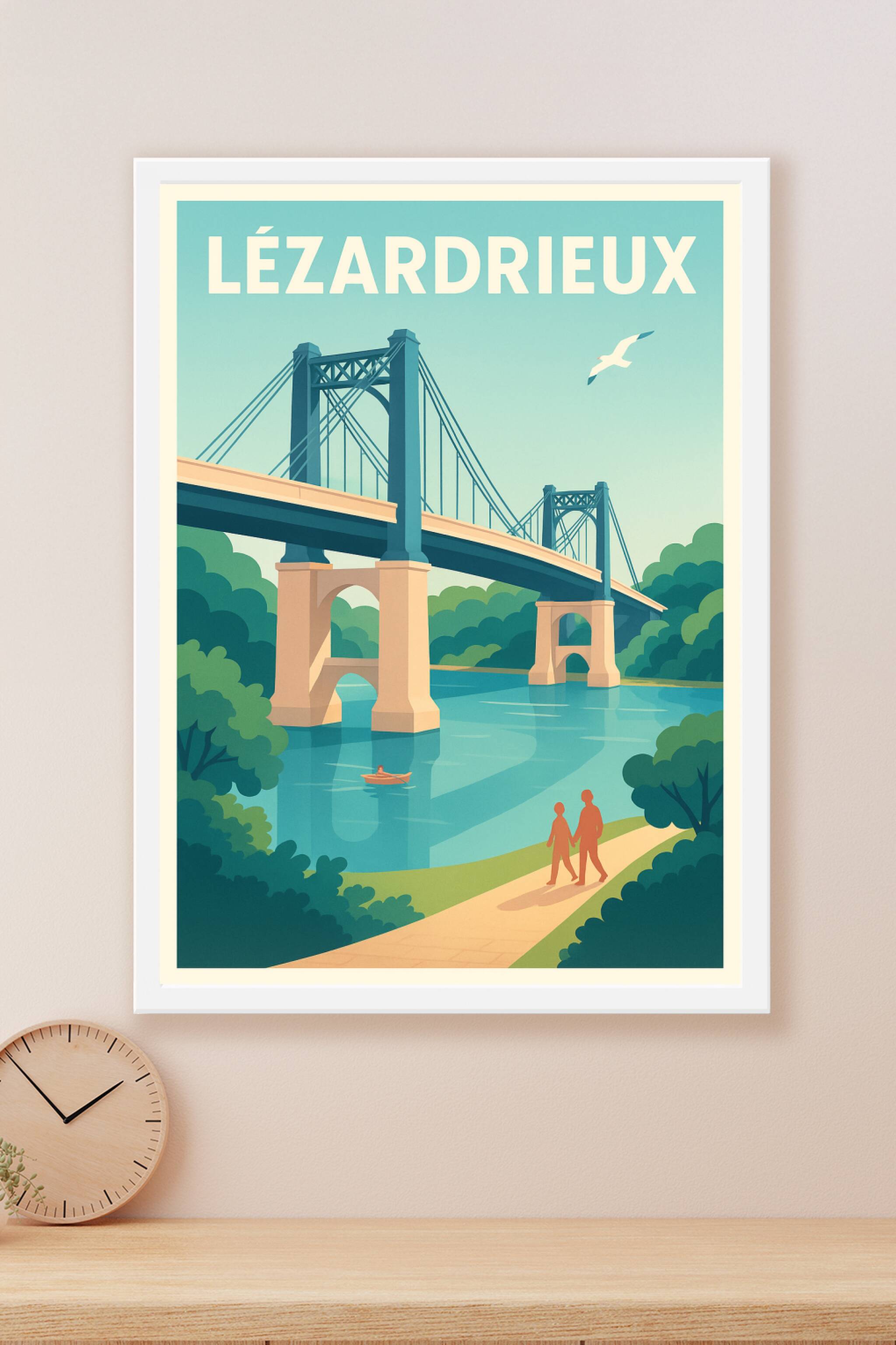 Découvrez la sérénité de Lézardrieux avec cette affiche illustrée mettant en scène le pont emblématique et la rivière calme qui traverse la ville. ...