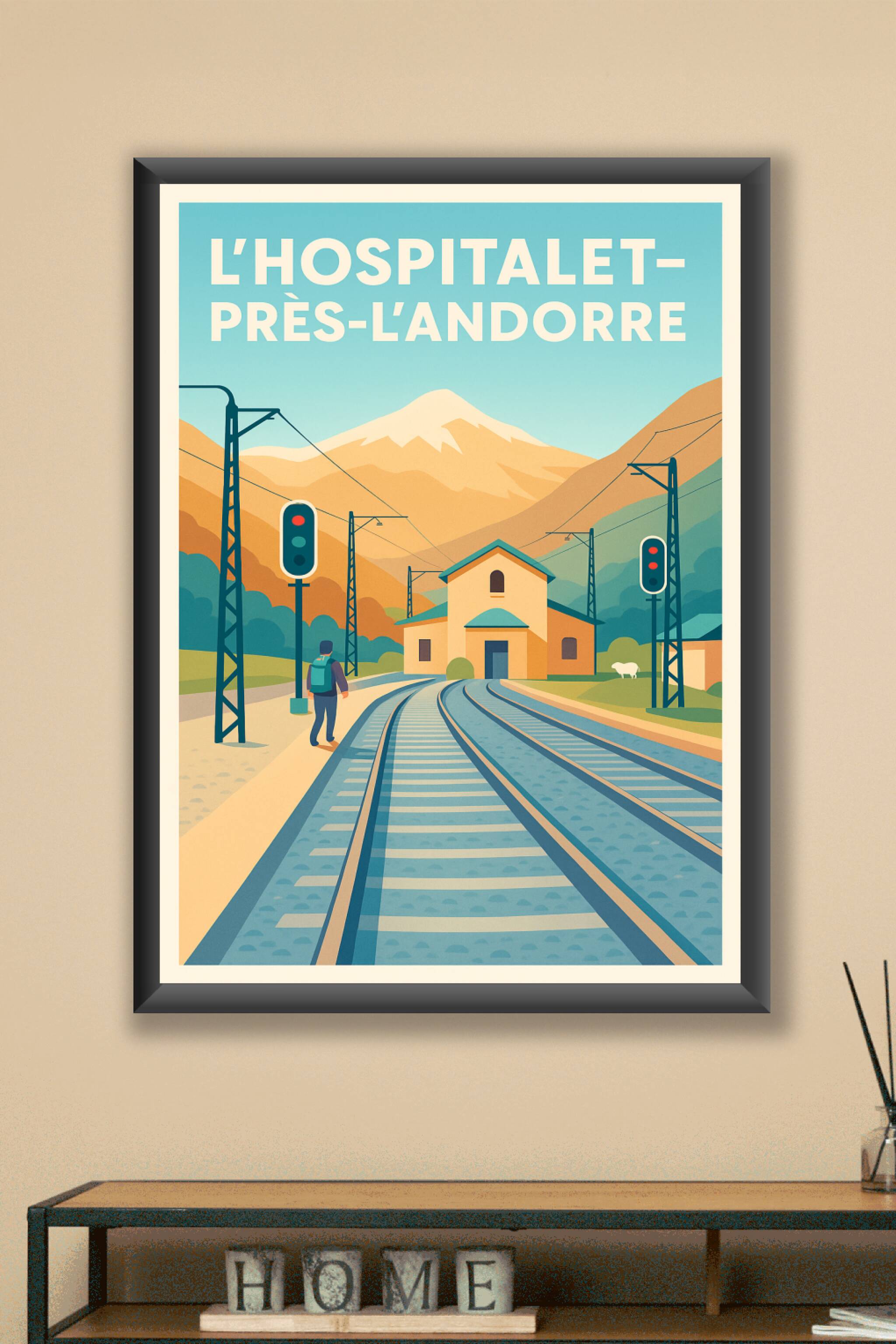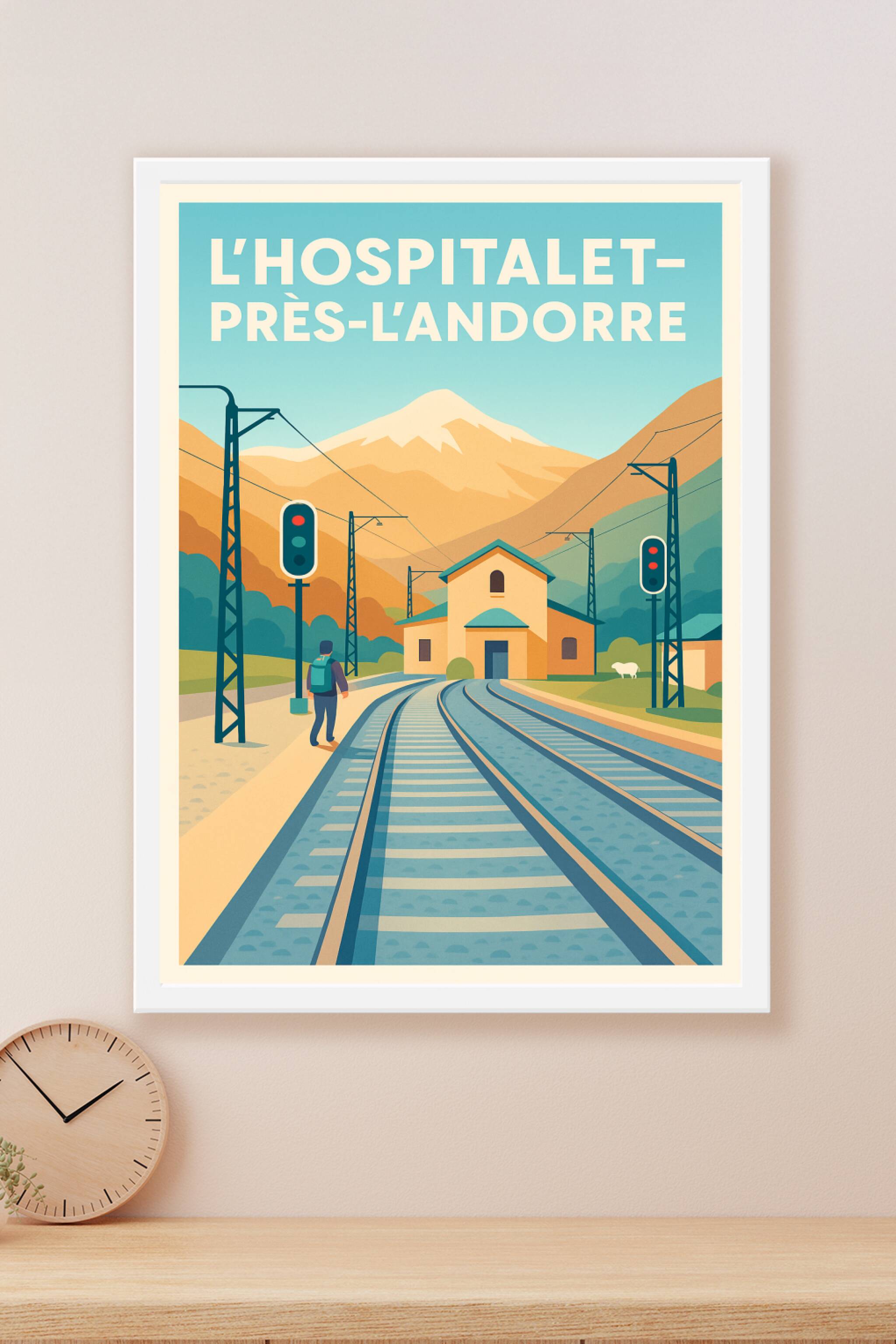 Découvrez l'atmosphère paisible et authentique de L'Hospitalet-près-l'Andorre avec cette affiche au design rétro et épuré. Le poster met en scène u...