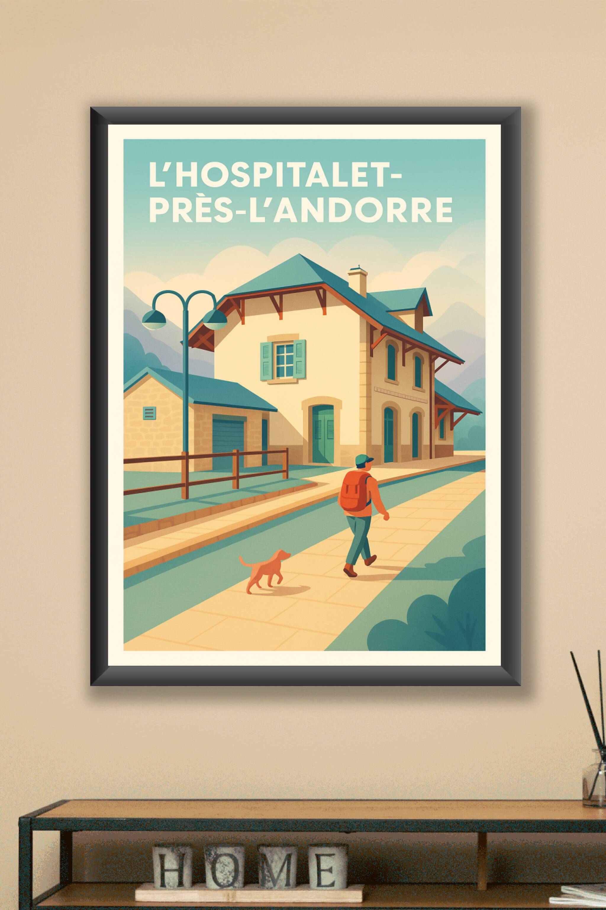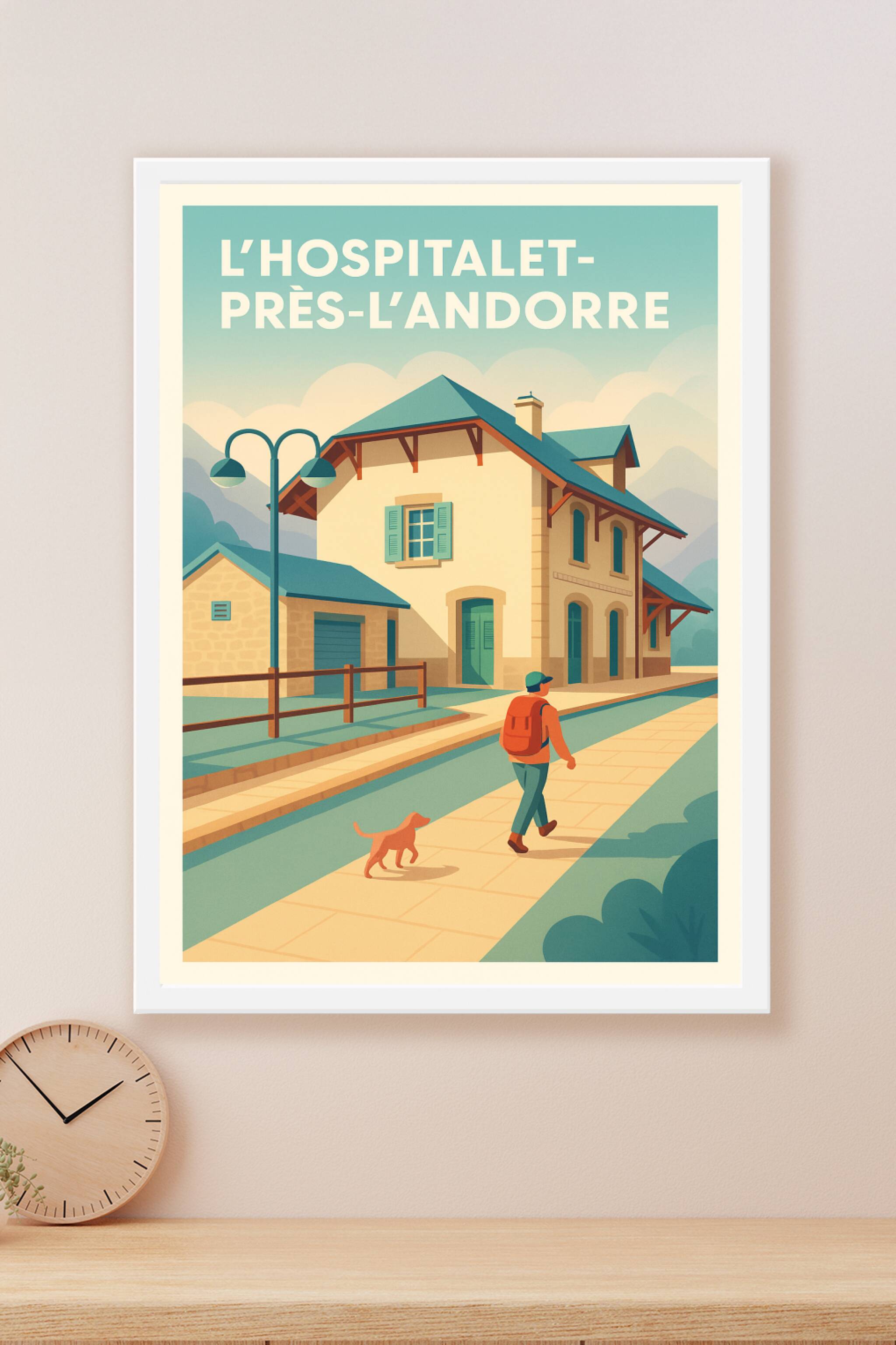 Découvrez l'atmosphère tranquille et charmante de L'Hospitalet-près-l'Andorre avec ce poster illustré au style vintage et doux. L'affiche met en sc...