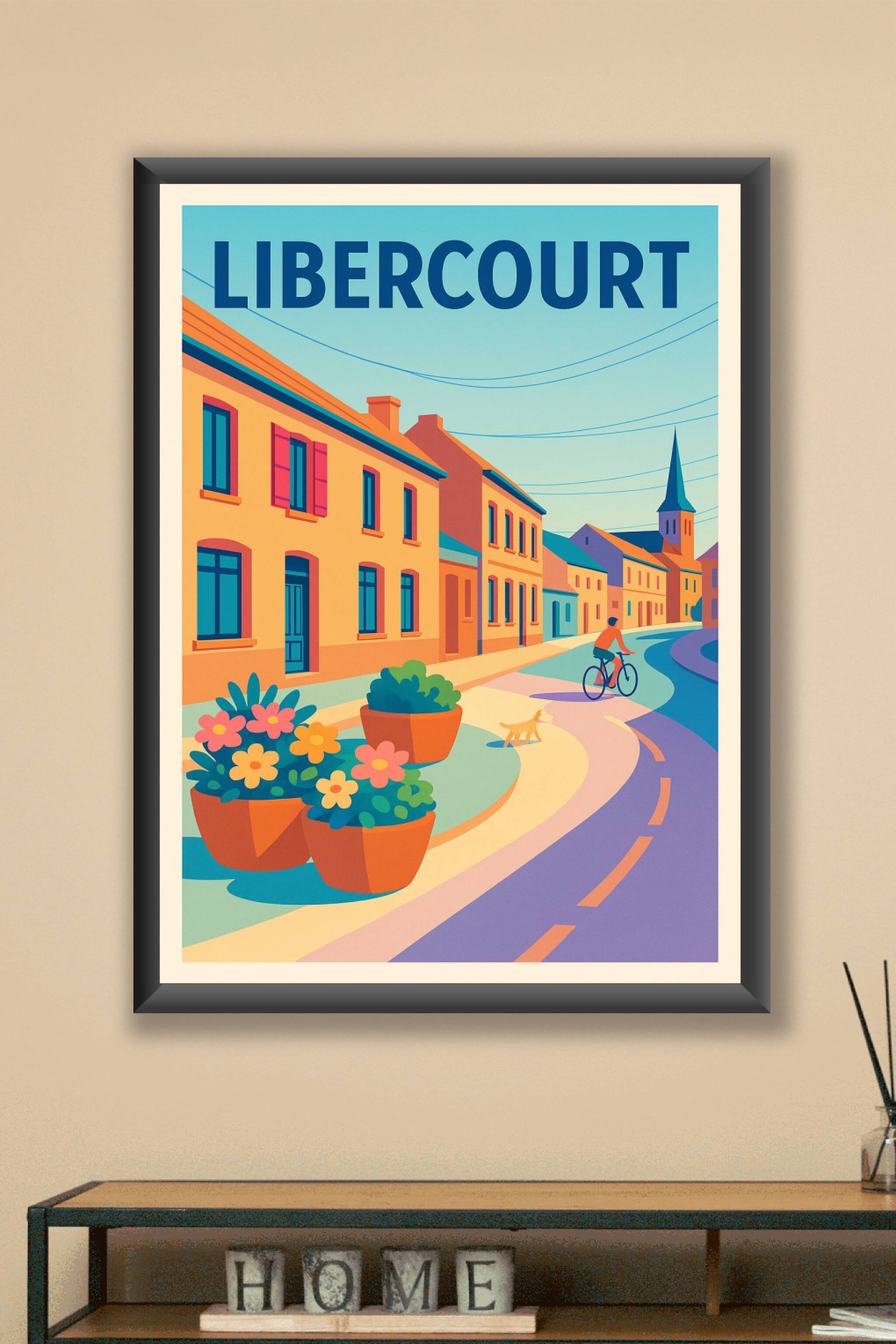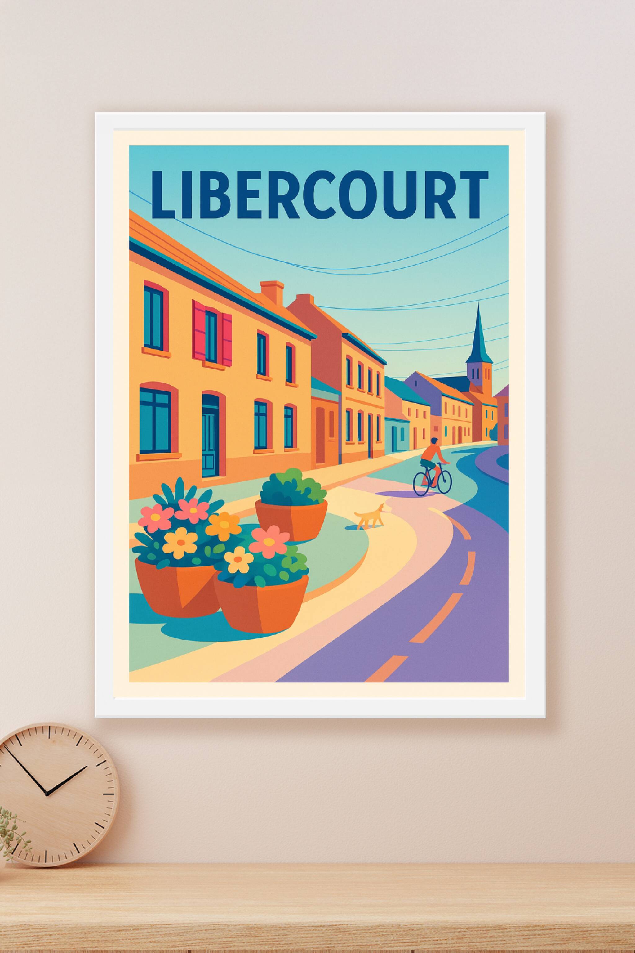 Découvrez l'atmosphère paisible et colorée de Libercourt avec cette affiche illustrée mettant en scène une rue typique, ses maisons chaleureuses, u...