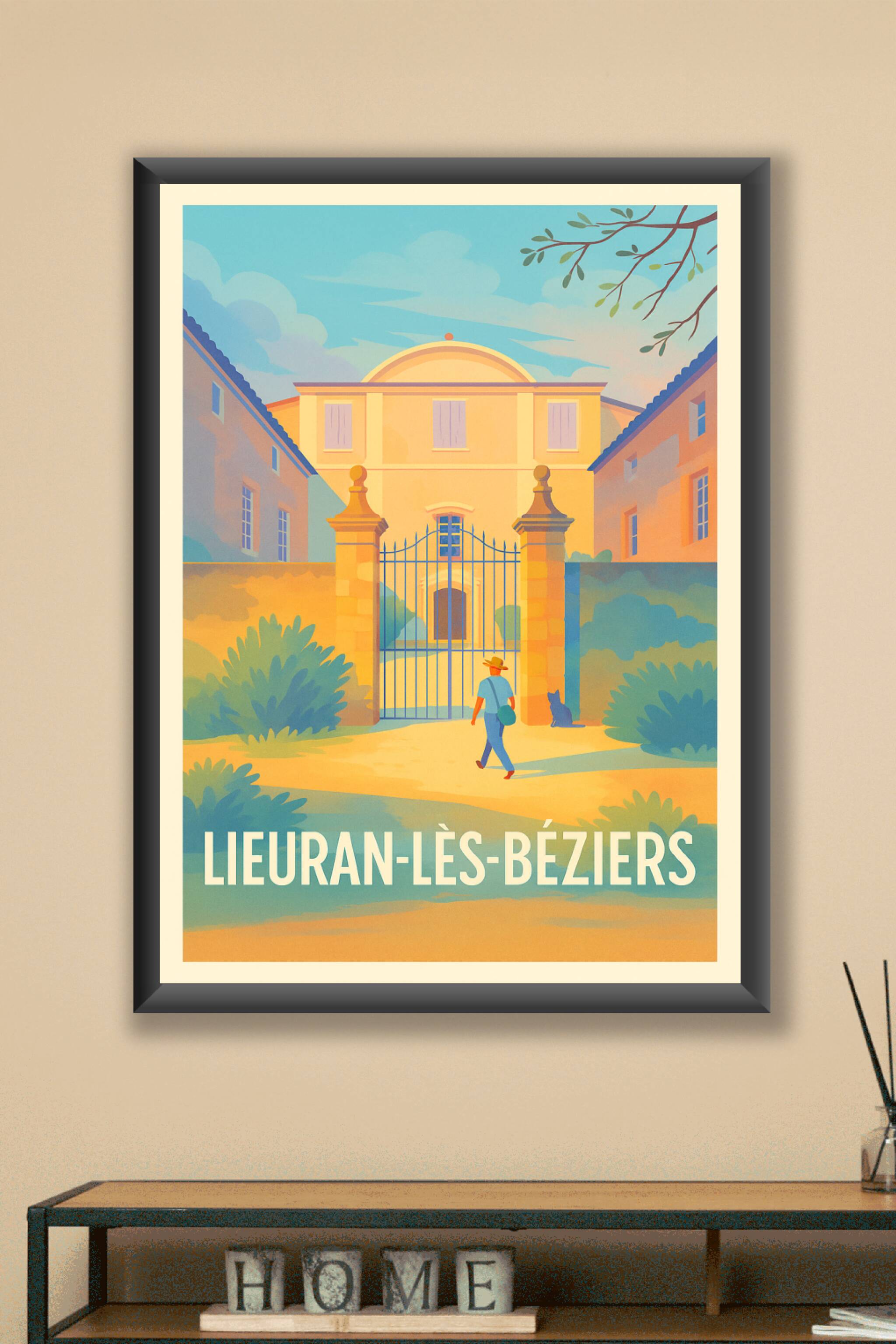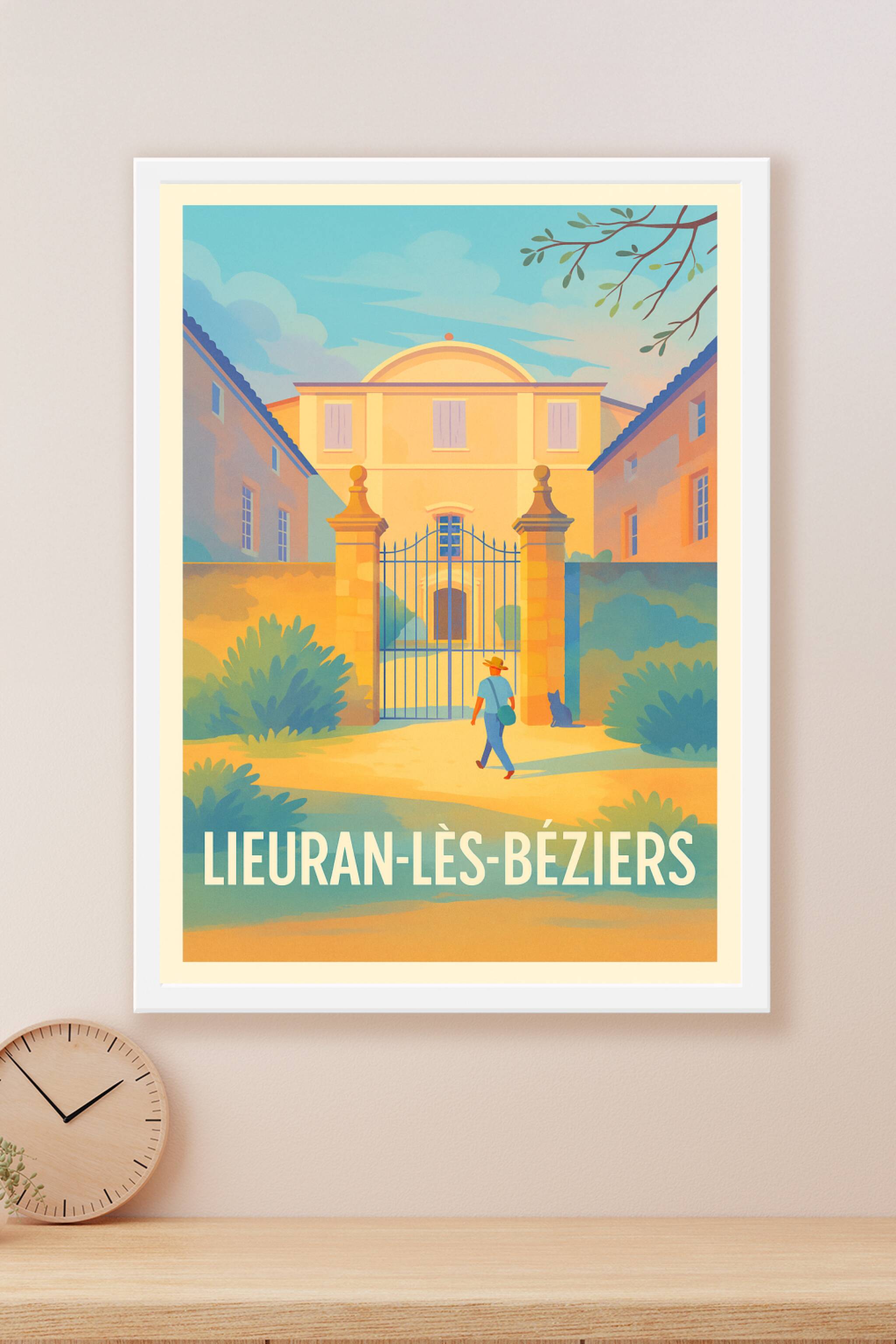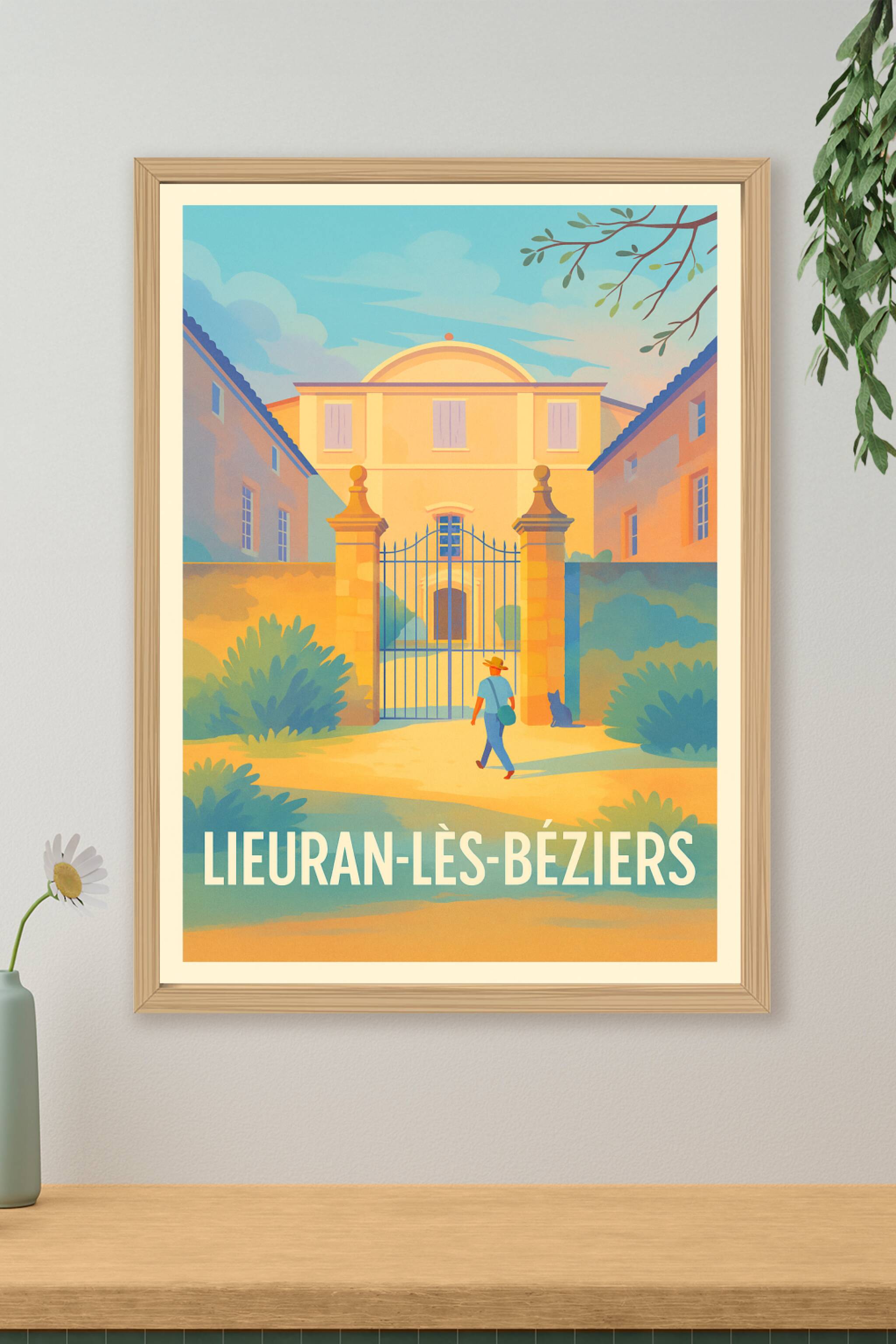 Découvrez l'atmosphère douce et paisible de Lieuran-lès-Béziers avec cette affiche illustrée mettant en scène une entrée monumentale baignée par la lumière dorée du sud. Un personnage déambule tranquillement dans ce décor architecturale typique, entouré de végétation apaisante et d'un ciel lumineux.Ce poster est imprimé en tirage "Fine Art" sur un papier 305g coton, garantissant une qualité d'impression exceptionnelle et une durabilité optimale de vos couleurs. Disponible du format A1 à A4, avec ou sans cadre, cette affiche fera un élément parfait pour sublimer votre intérieur, que ce soit votre salon, bureau ou espace de vie.Laissez-vous séduire par la qualité premium de cette création 100% fabriquée en France, un cadeau idéal ou une pièce unique pour les amateurs de la région et des ambiances méditerranéennes.