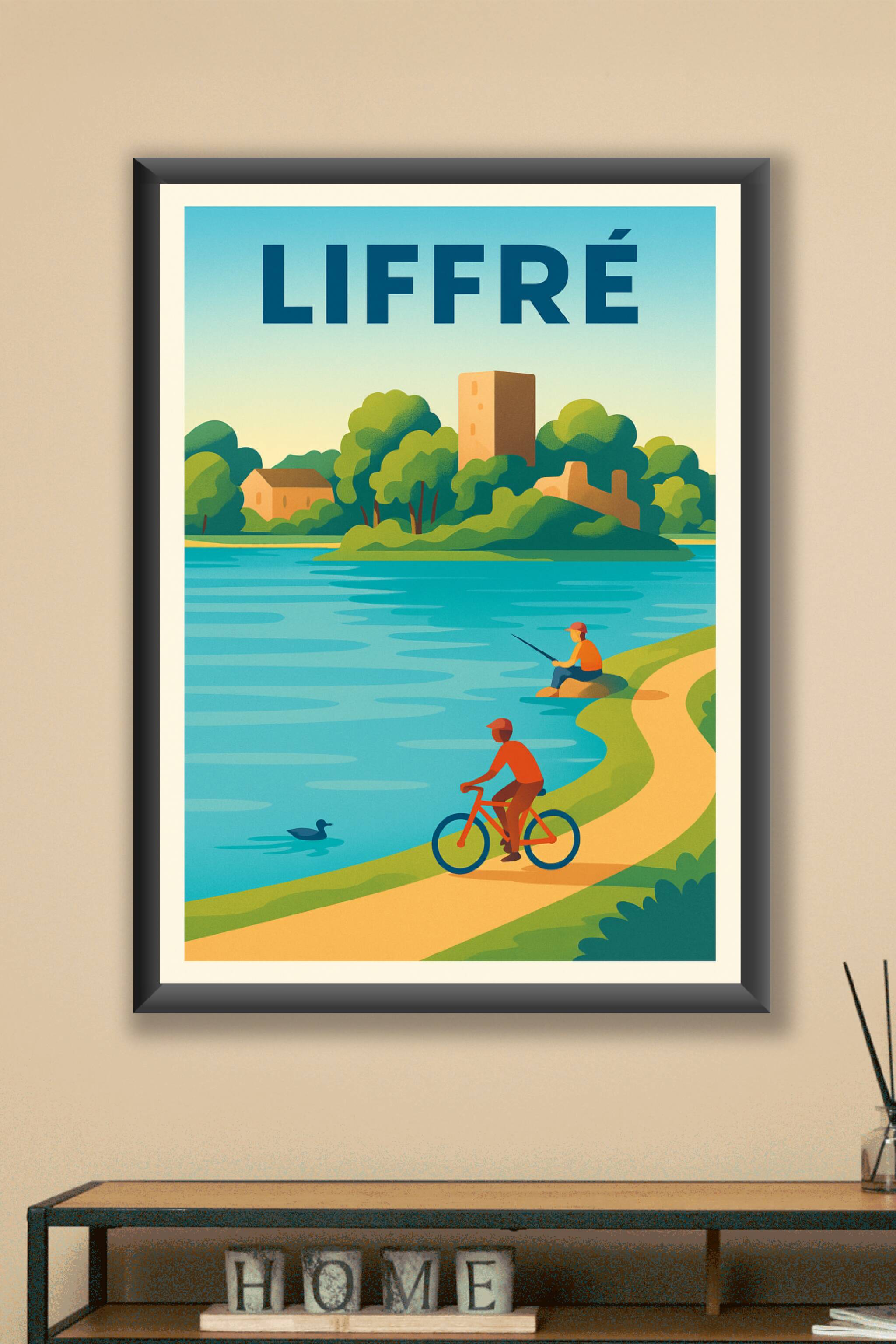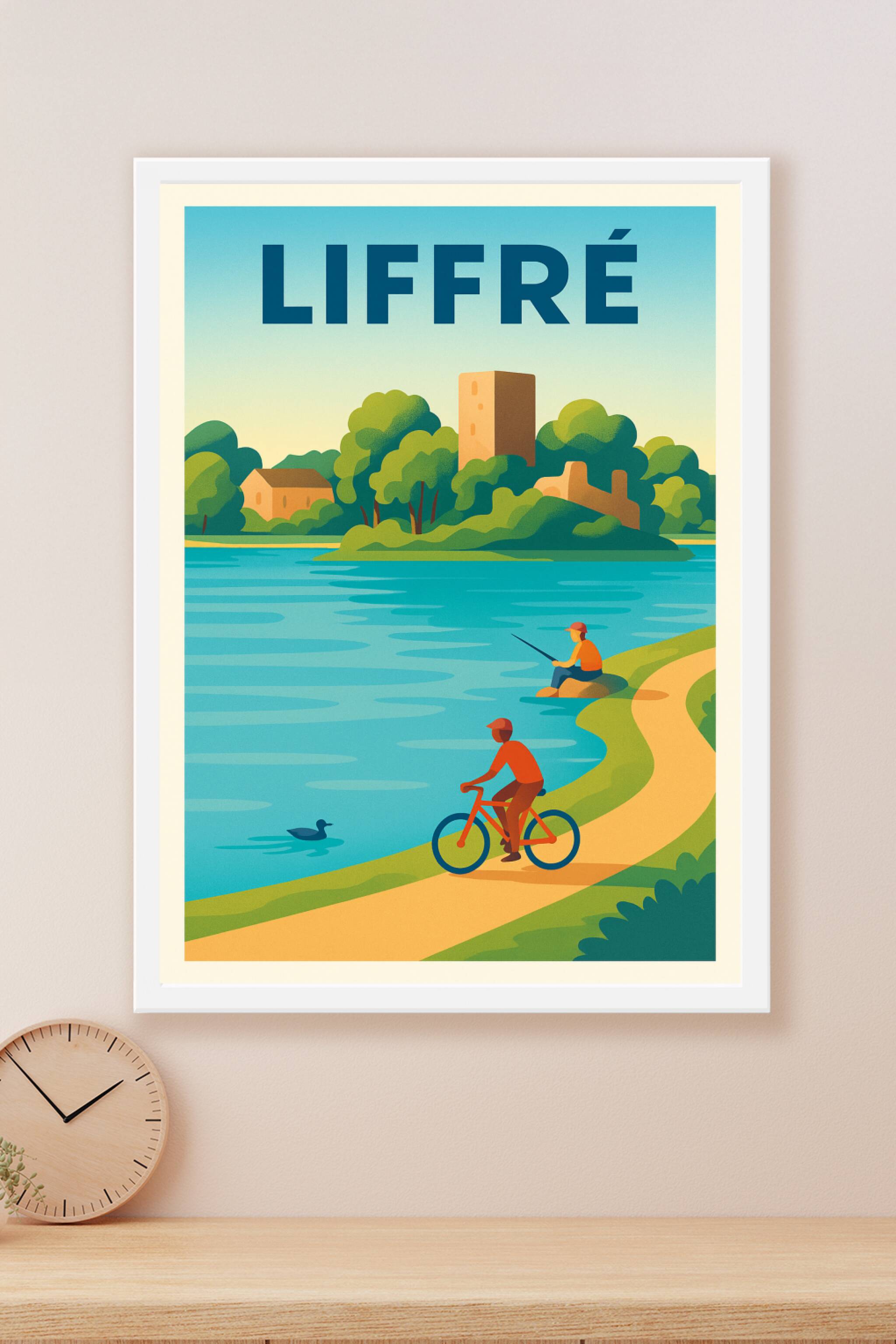 Découvrez le charme paisible de Liffré avec cette affiche illustrée pleine de douceur et de sérénité. Ce poster met en scène un paysage naturel où la nature et les ruines anciennes se mêlent harmonieusement au bord de l'eau, avec une promenade animée par un cycliste et un pêcheur. Cette affiche est imprimée en tirage "Fine Art" sur un papier 305g coton premium, garantissant des couleurs vives et une qualité d'impression exceptionnelle, parfaite pour sublimer votre intérieur. Disponible en plusieurs formats, du A4 au A1, avec ou sans cadre, ce poster deviendra un élément décoratif élégant et évocateur, idéal pour les amoureux de la Bretagne et les passionnés de nature.