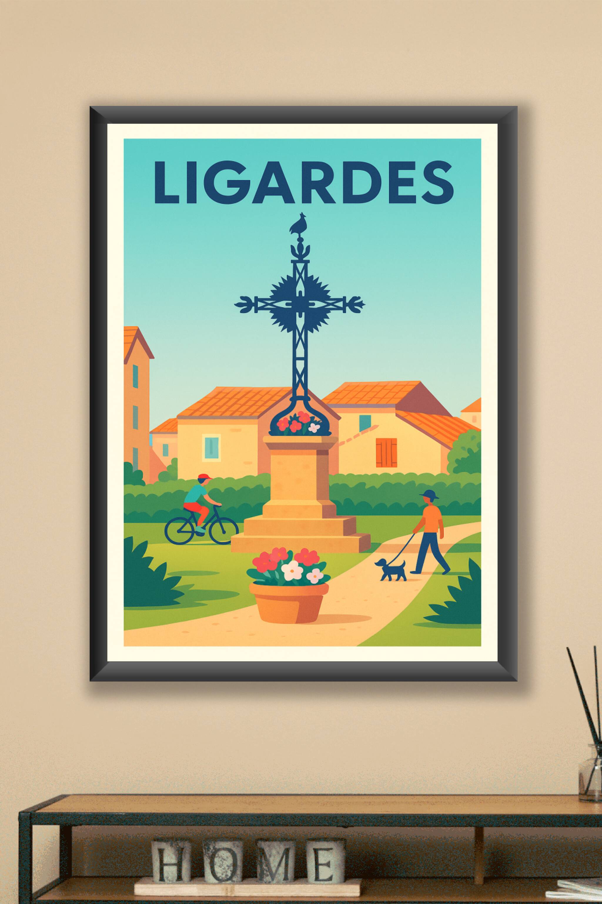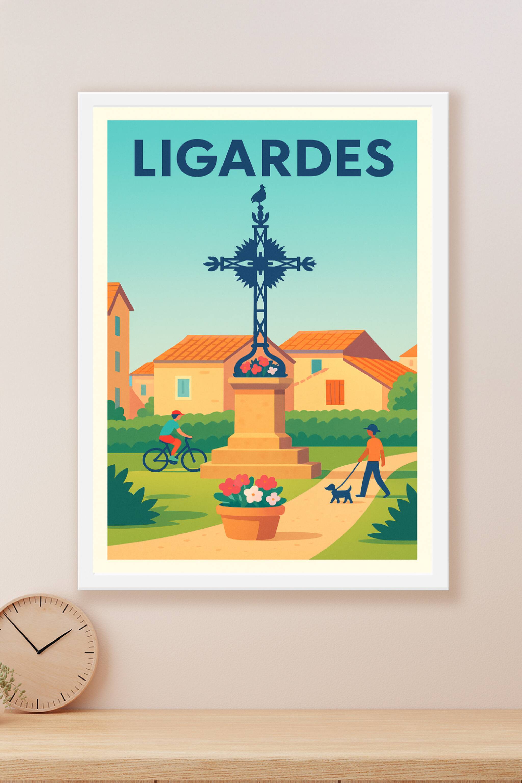 Découvrez cette affiche au style rétro illustrant un coin charmant de Ligardes, avec sa croix monumentale, un cycliste et un promeneur avec son chi...