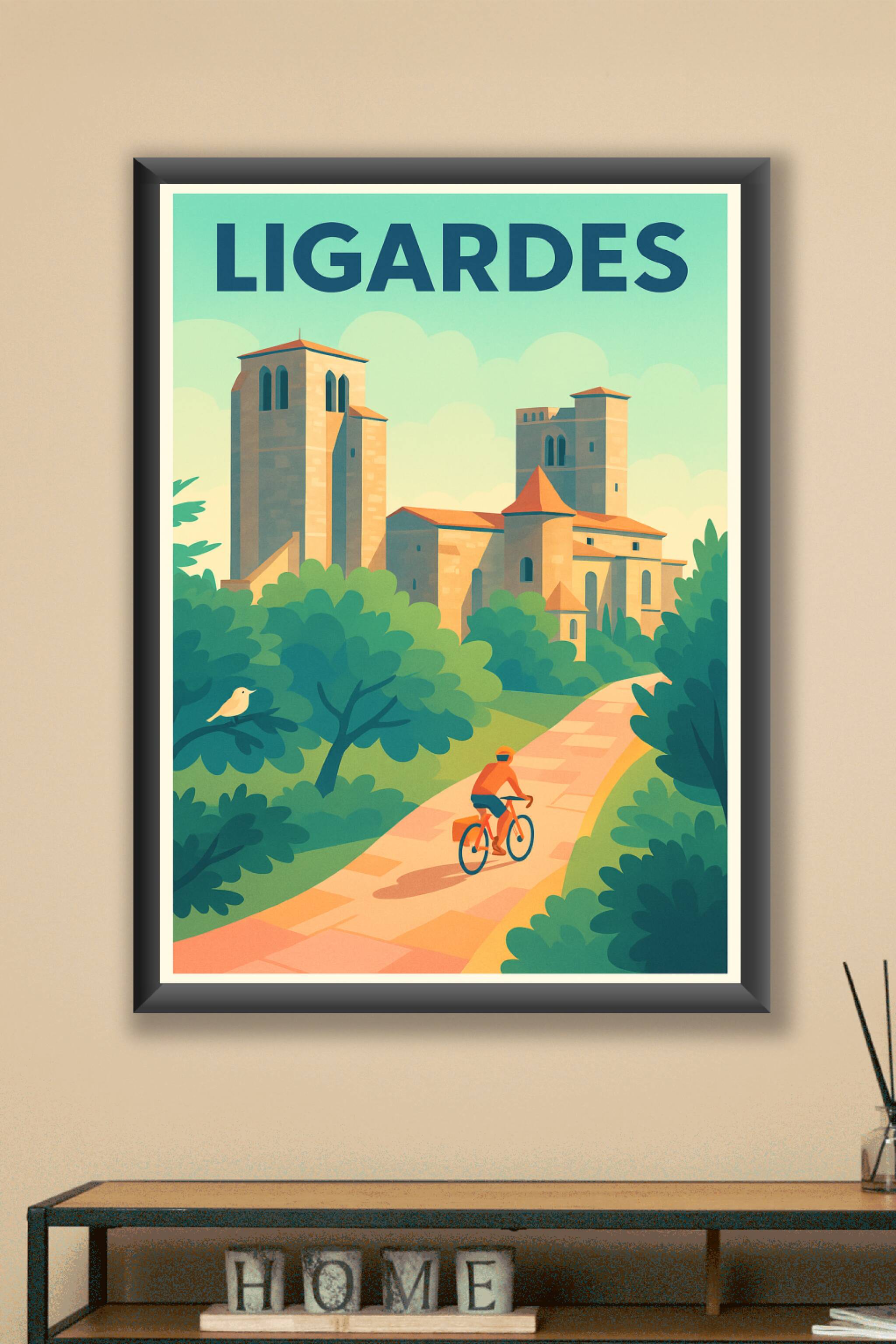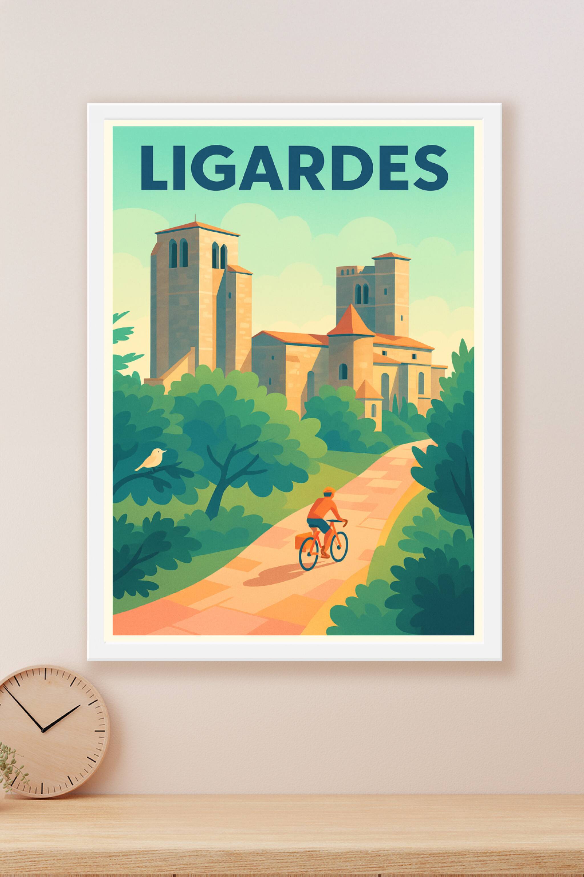 Découvrez la douceur et l'authenticité du village de Ligardes avec cette affiche illustrée mettant en scène un cycliste sur un chemin bordé de verd...