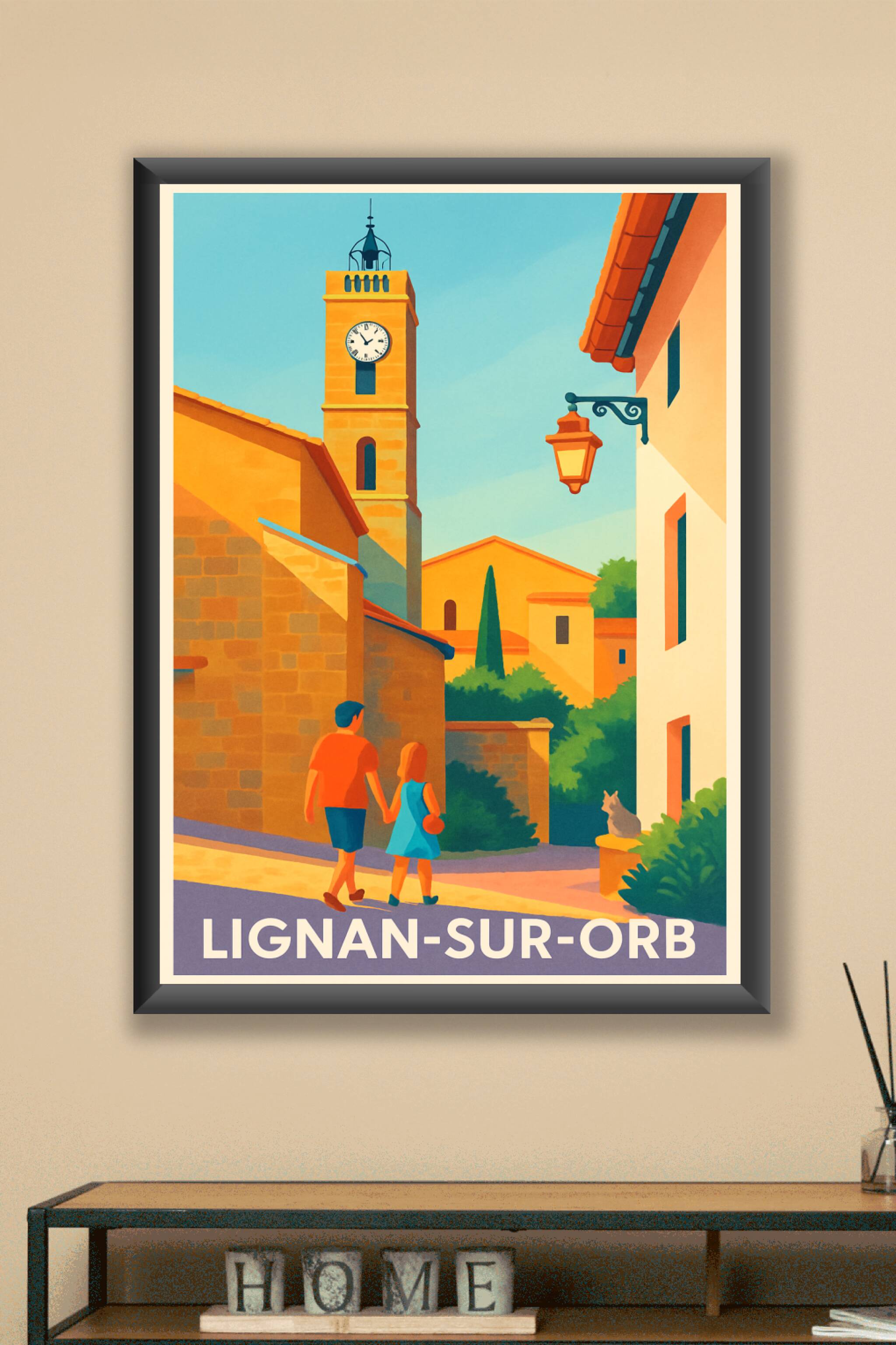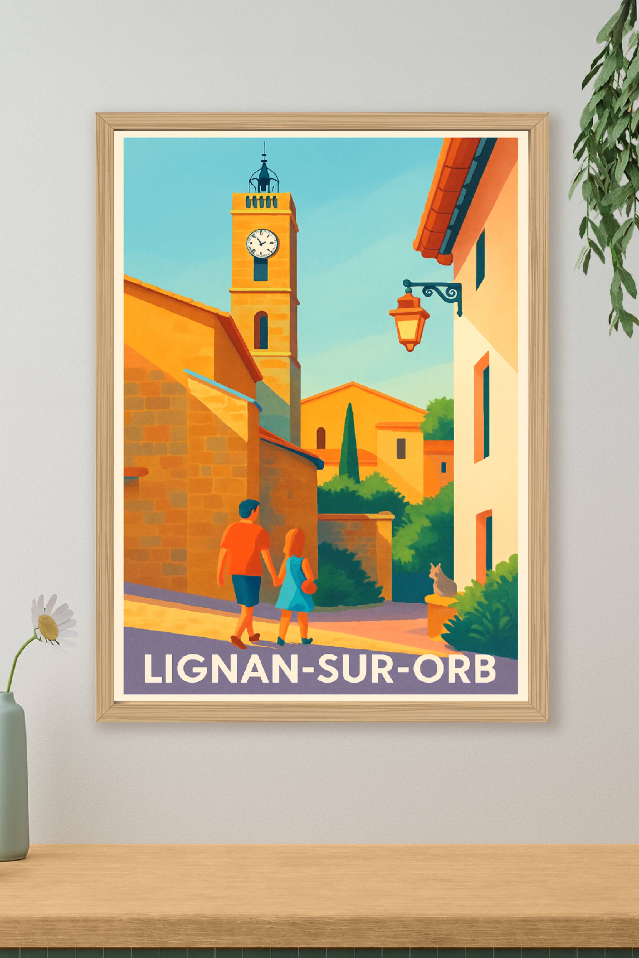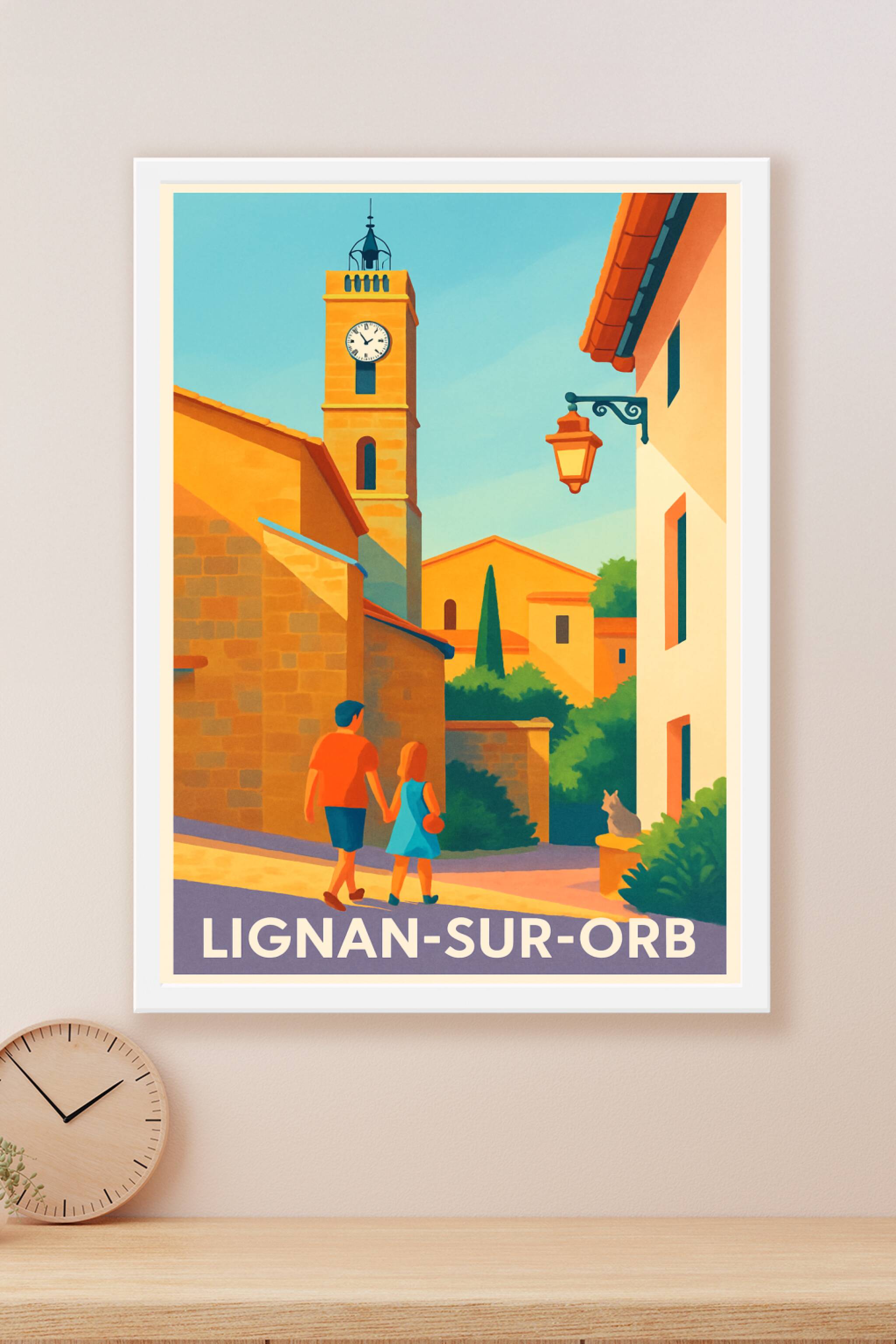 Découvrez le charme authentique de Lignan-sur-Orb à travers cette affiche au style lumineux et chaleureux. Cette illustration met en valeur les ruelles pittoresques baignées de soleil, la tour emblématique de l'horloge et une ambiance conviviale incarnée par un couple se promenant. Ce poster est imprimé en tirage "Fine Art" sur un papier 305g coton, garantissant un rendu des couleurs d’une grande précision et une longévité exceptionnelle. Disponible du format A1 à A4, avec ou sans cadre, cette affiche est idéale pour apporter une touche d’évasion et de douceur méridionale à votre intérieur. Chaque tirage est soigneusement réalisé en France, pour vous offrir un objet décoratif de haute qualité, parfait en souvenir ou comme cadeau.