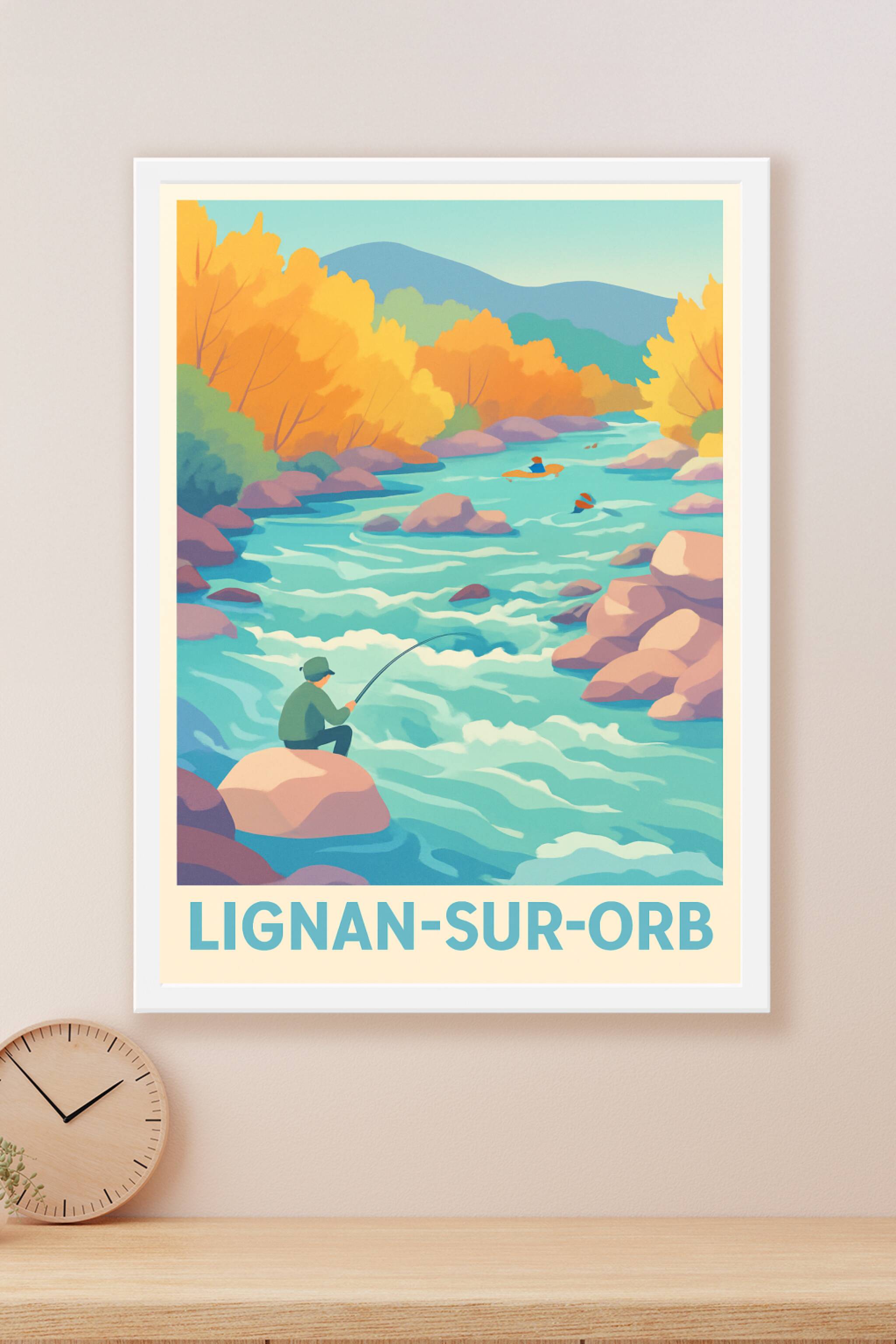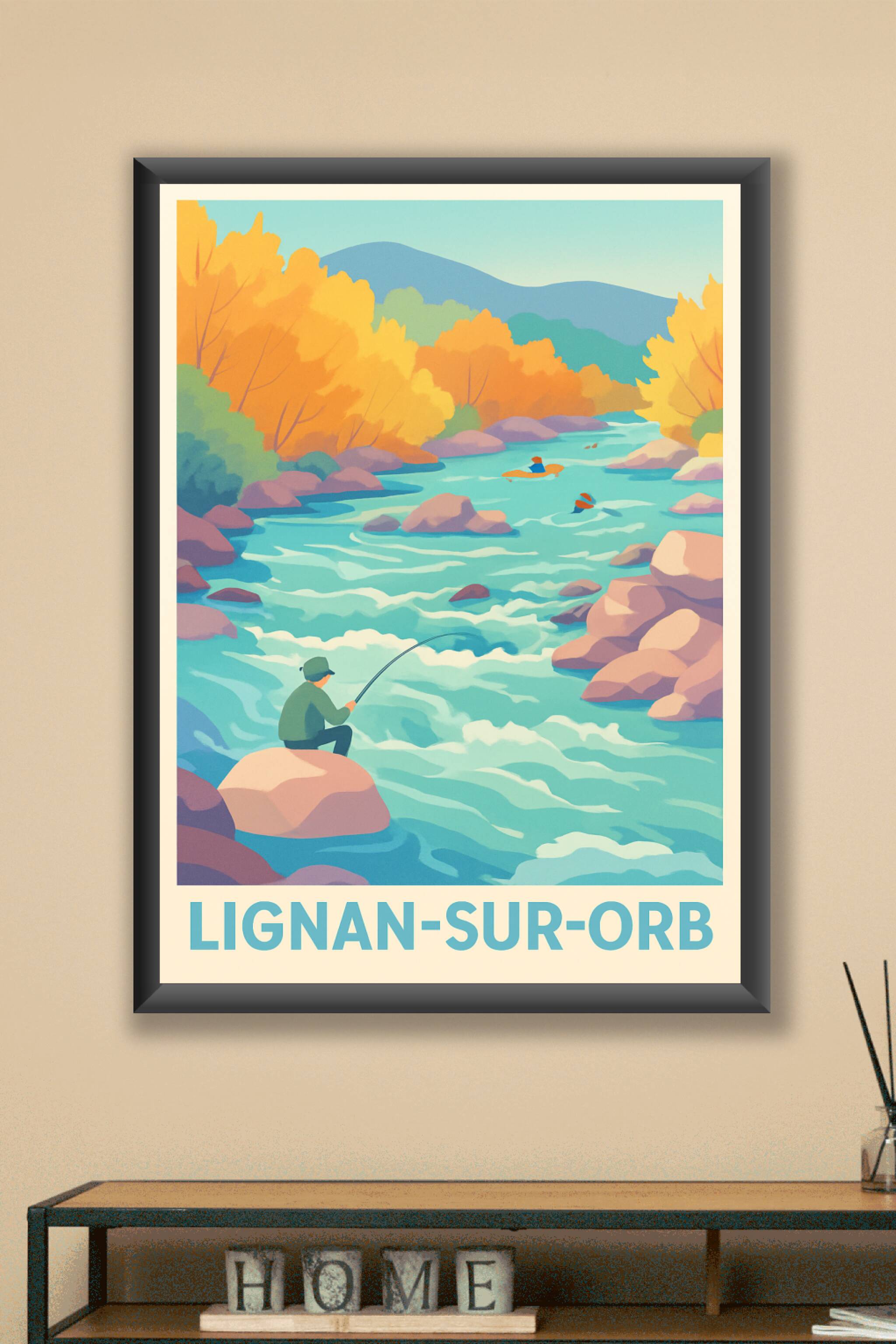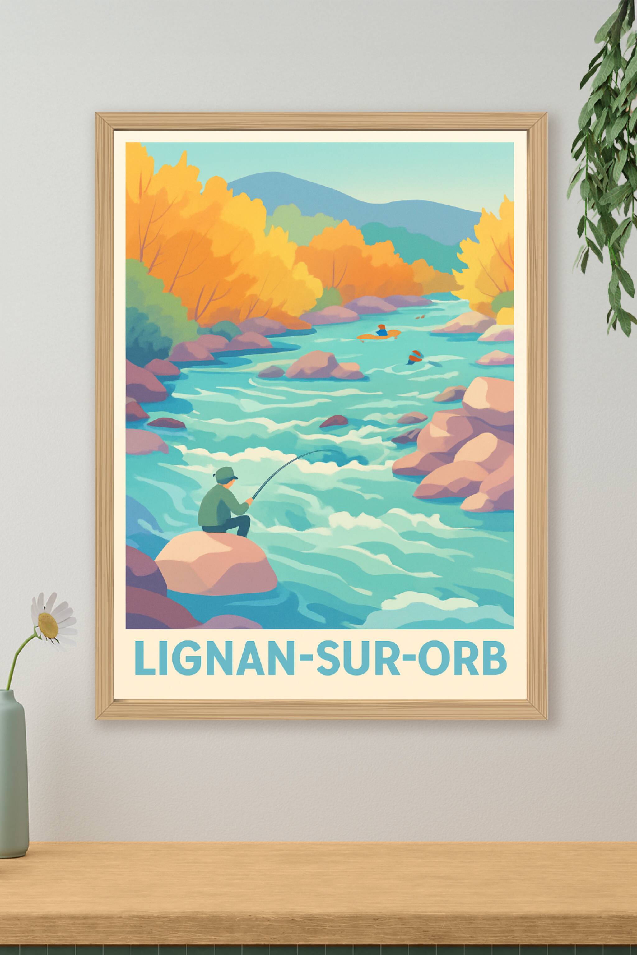 Découvrez la beauté paisible de Lignan-sur-Orb avec cette affiche illustrée mettant en scène un pêcheur au bord de la rivière, entouré des couleurs...