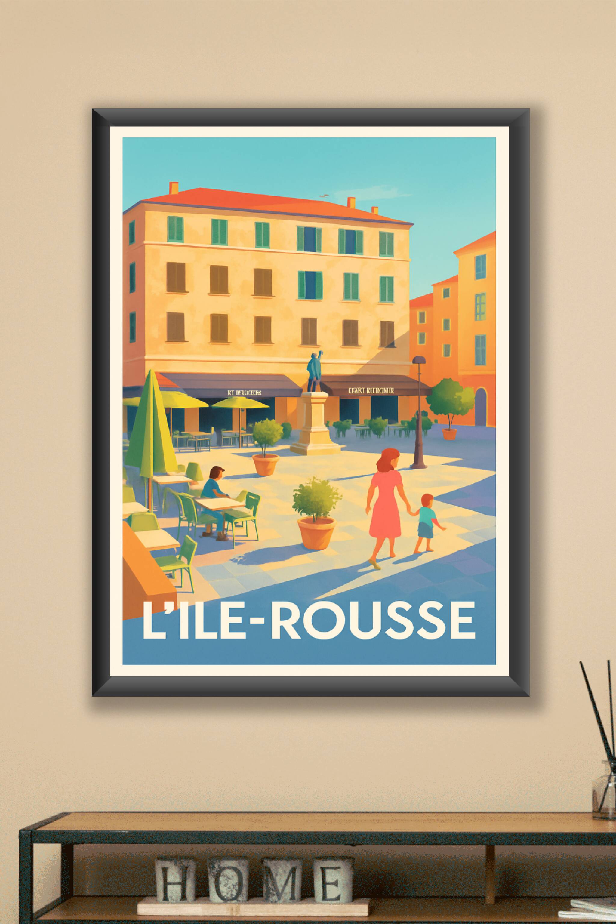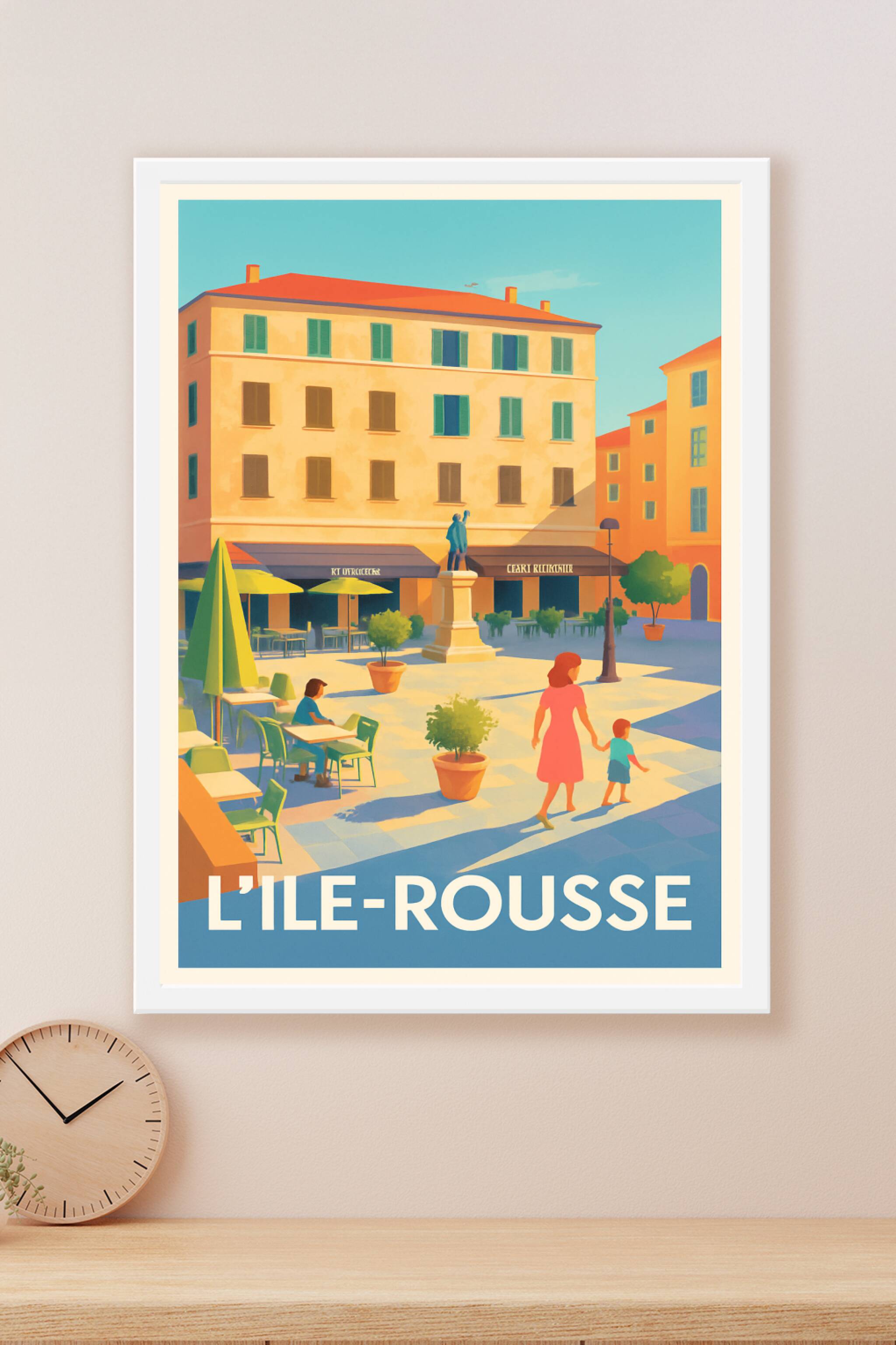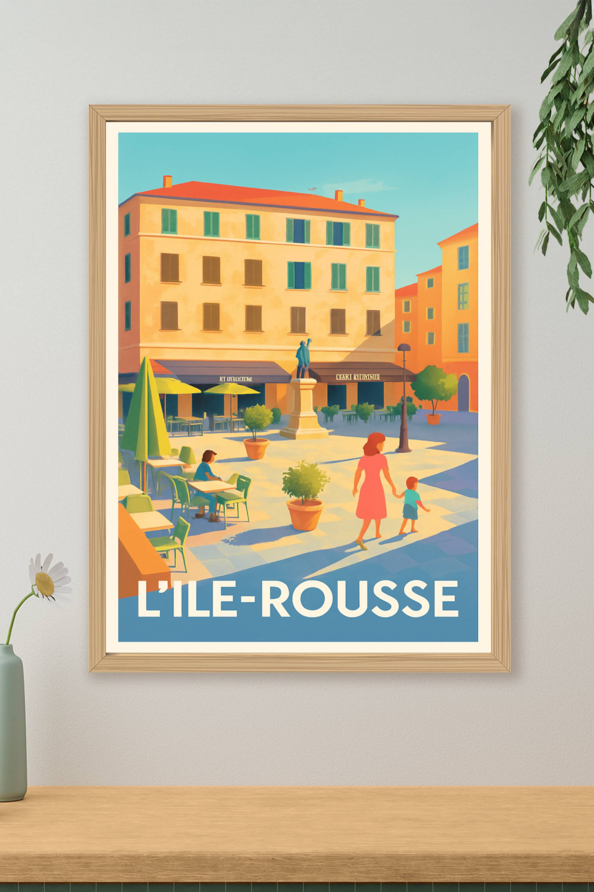 Découvrez l'atmosphère chaleureuse et ensoleillée de L'Île-Rousse à travers cette affiche au style vintage inspiré des célèbres posters touristiques. On y voit la vivacité de la place principale, avec ses terrasses de café, ses bâtiments aux volets colorés, ainsi qu'une scène familiale pleine de douceur.Ce poster est proposé en tirage Fine Art sur papier 305g coton, garantissant une qualité d'impression optimale et une durabilité exceptionnelle. Disponible en formats A1 à A4, avec ou sans cadre, cette affiche ajoutera une touche de douceur méditerranéenne à votre intérieur ou constituera un cadeau parfait pour les amoureux de cette ville balnéaire.Fabriquée en France, cette affiche premium sublimera votre décoration avec ses couleurs vives et ses détails soignés.