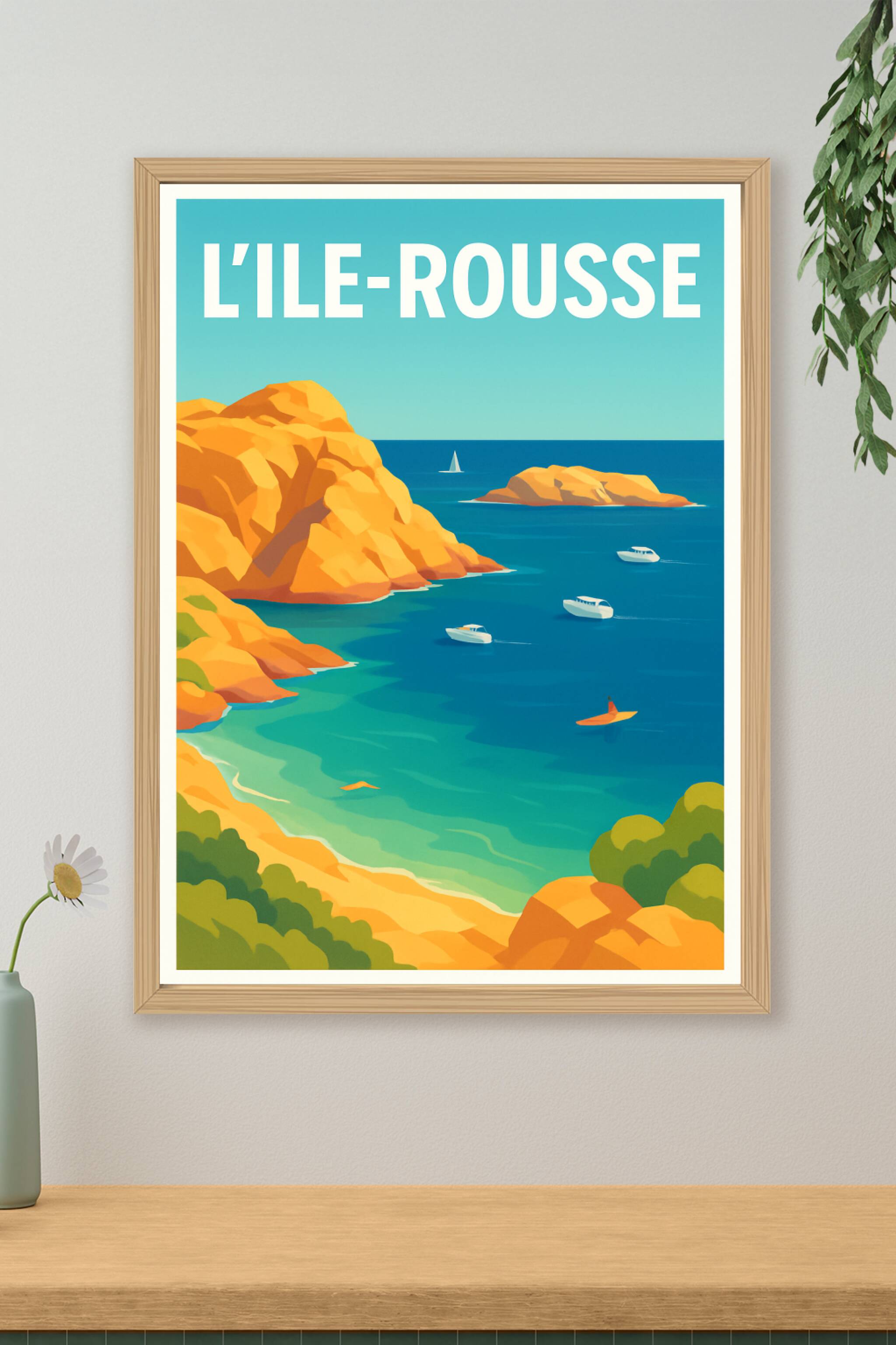 Découvrez la beauté lumineuse de L'Île-Rousse avec cette affiche au design graphique élégant, mettant en scène ses paysages méditerranéens de roche...