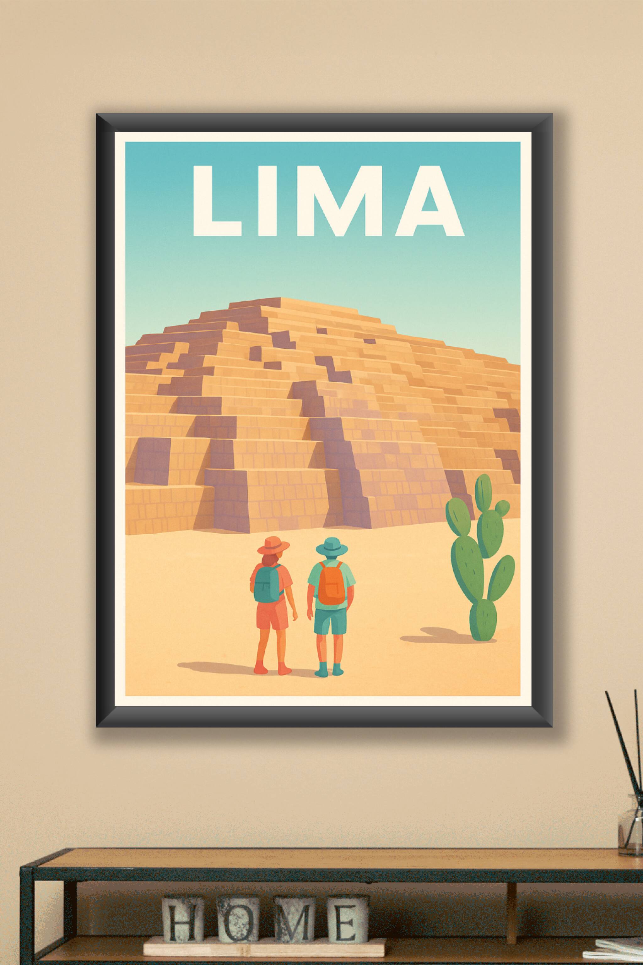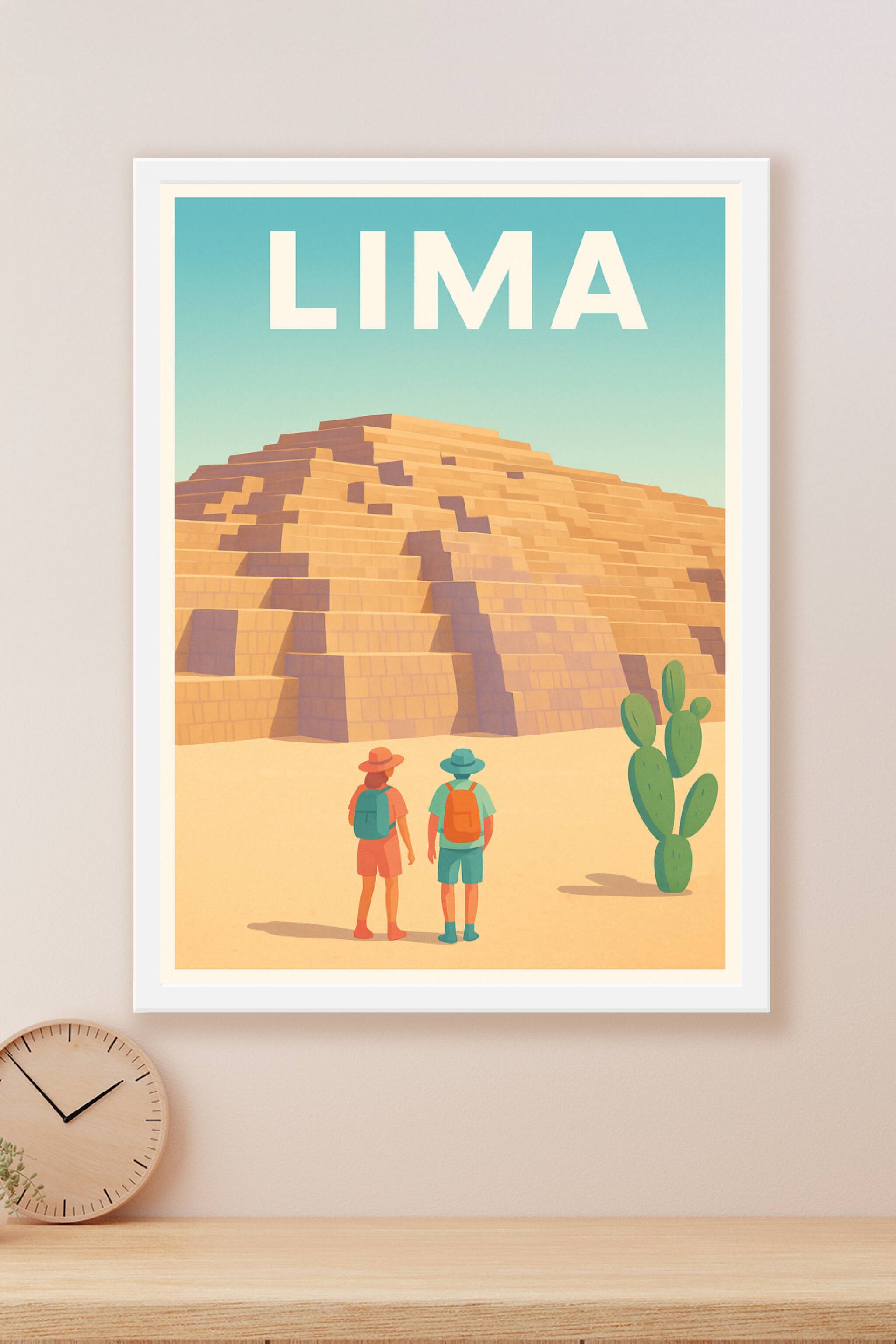 Explorez l'atmosphère unique de Lima à travers cette affiche illustrée mettant en scène les pyramides emblématiques de la région. Ce poster capture...