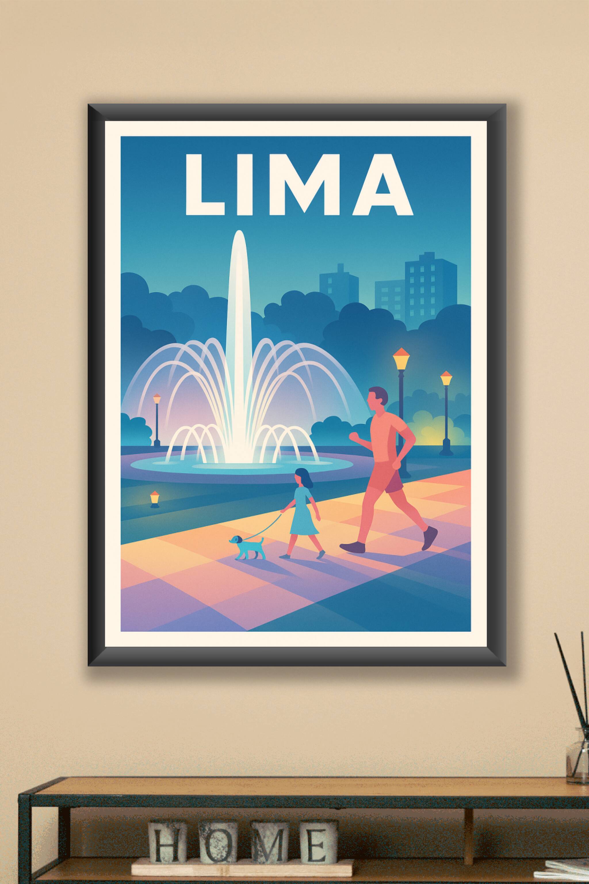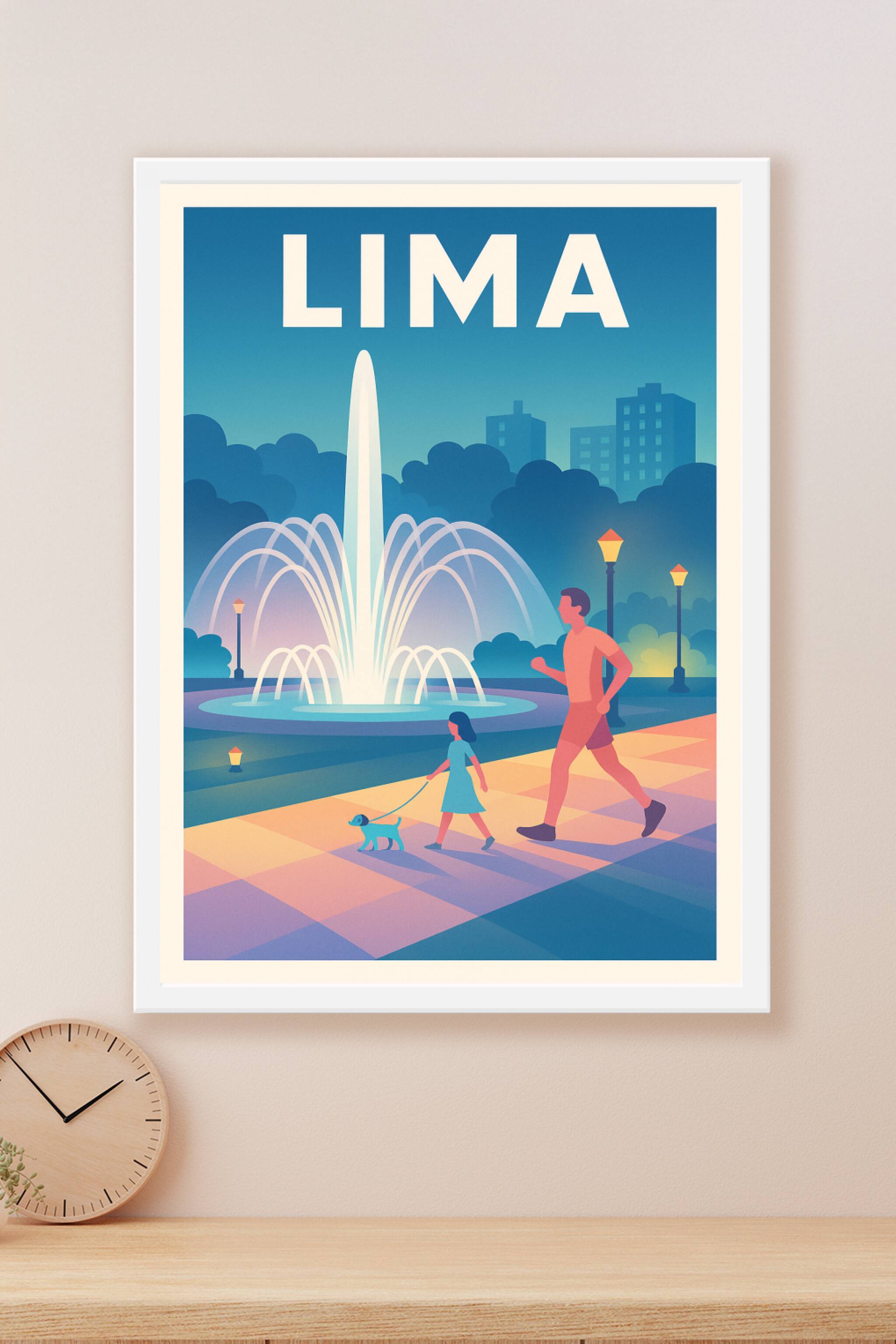 Découvrez le charme apaisant de Lima avec cette affiche illustrée mettant en scène une promenade au crépuscule autour d'une fontaine lumineuse, sym...