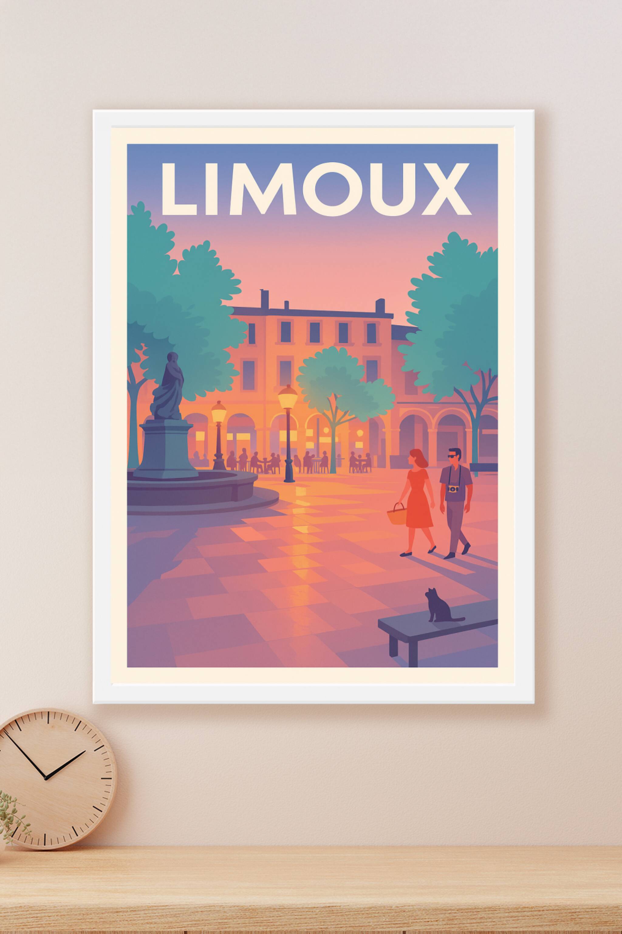 Découvrez l'atmosphère magique et paisible de Limoux avec cette affiche illustrée aux tons chauds du coucher de soleil. Représentant une place anim...