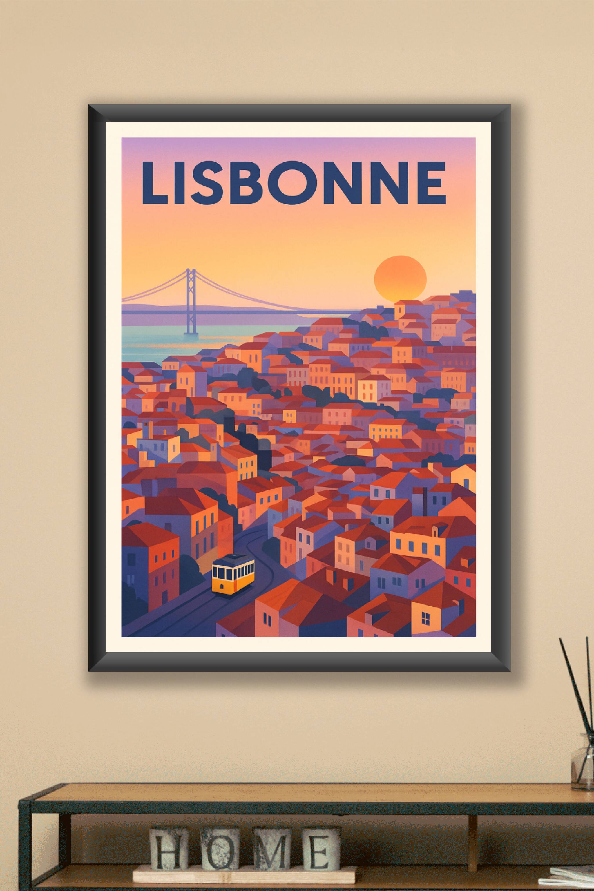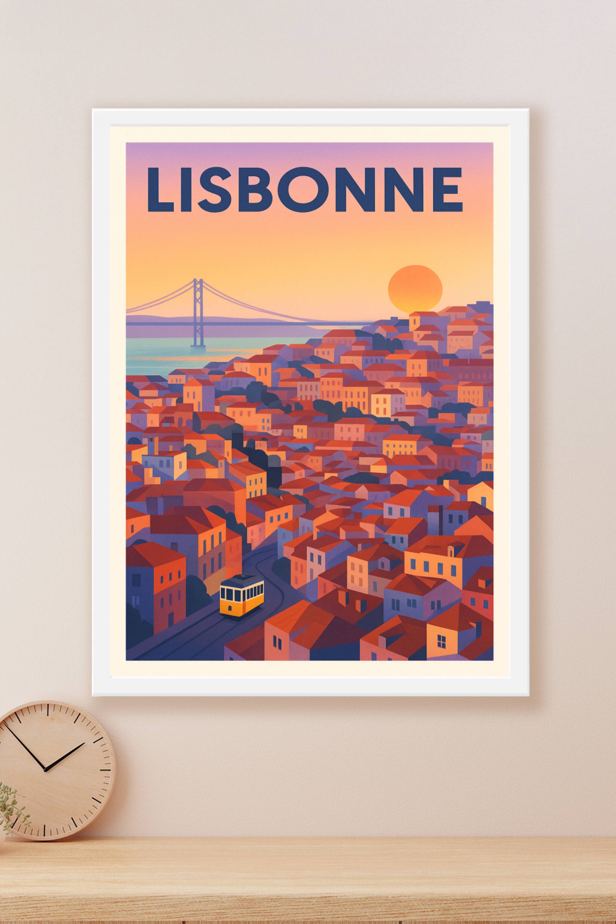 Découvrez la magie de Lisbonne avec cette affiche captivante illustrant la ville au crépuscule, ses toits colorés et son célèbre tramway jaune longeant les ruelles pentues. Le pont du 25 Avril se dessine à l'horizon sous un ciel aux tons chauds, sublimant l'atmosphère unique de la capitale portugaise.Ce poster est imprimé en tirage "Fine Art" sur papier 305g coton, garantissant une finesse de détail et une durabilité exceptionnelle. Disponible en formats A1 à A4, avec ou sans cadre, cette affiche apporte une touche chaleureuse et élégante à tout intérieur.Profitez de la qualité premium 100% fabriquée en France pour orner vos murs ou offrir un cadeau raffiné aux passionnés de Lisbonne et de voyages.