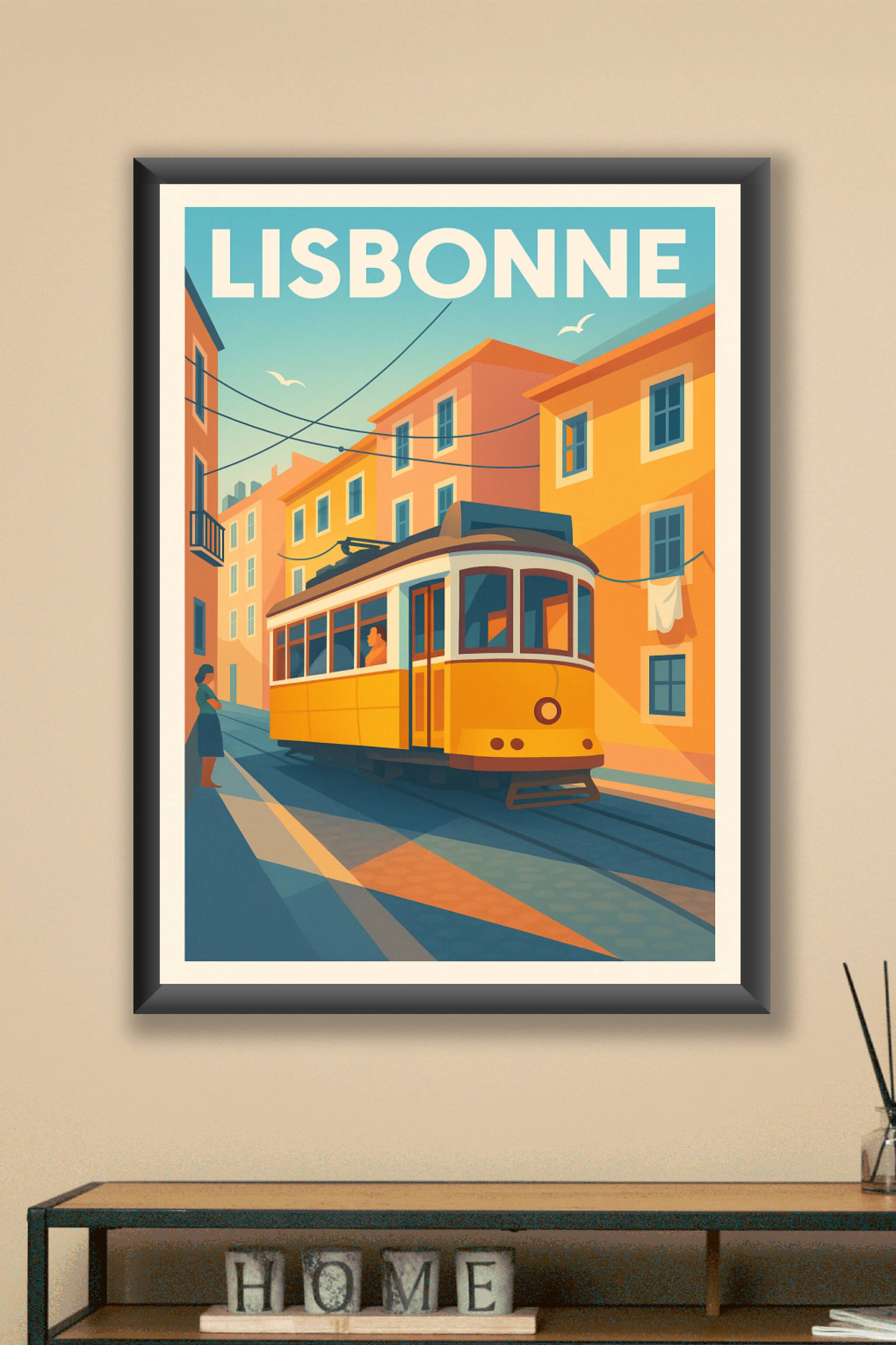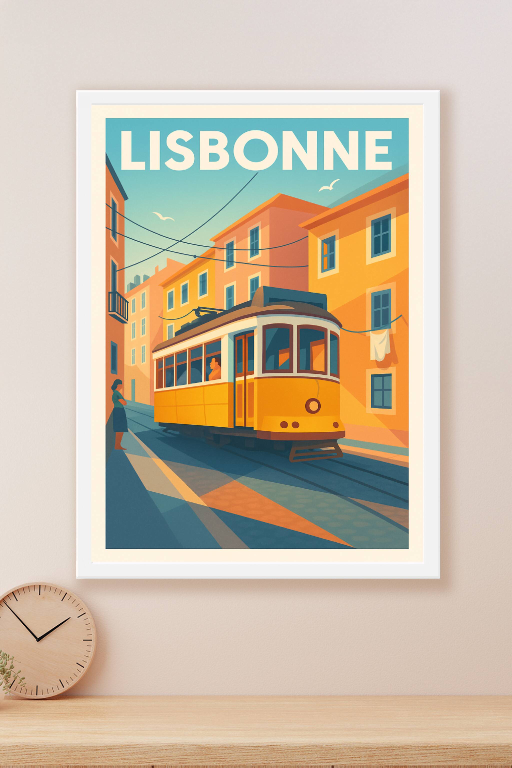 Découvrez l'essence pittoresque de Lisbonne avec cette affiche au style rétro illustrant le célèbre tramway jaune serpentant dans les ruelles colorées de la capitale portugaise. Ce poster capture la lumière douce et les teintes chaudes des immeubles traditionnels qui font tout le charme de cette ville unique.Ce poster est imprimé en tirage "Fine Art" sur papier 305g coton, garantissant une qualité d'impression supérieure et une durabilité remarquable. Disponible en formats A1 à A4, avec ou sans cadre, cette affiche apportera une touche nostalgique et chaleureuse à votre intérieur ou fera un cadeau idéal pour les amoureux de Lisbonne. Profitez d'une production 100% française pour une décoration élégante et raffinée.
