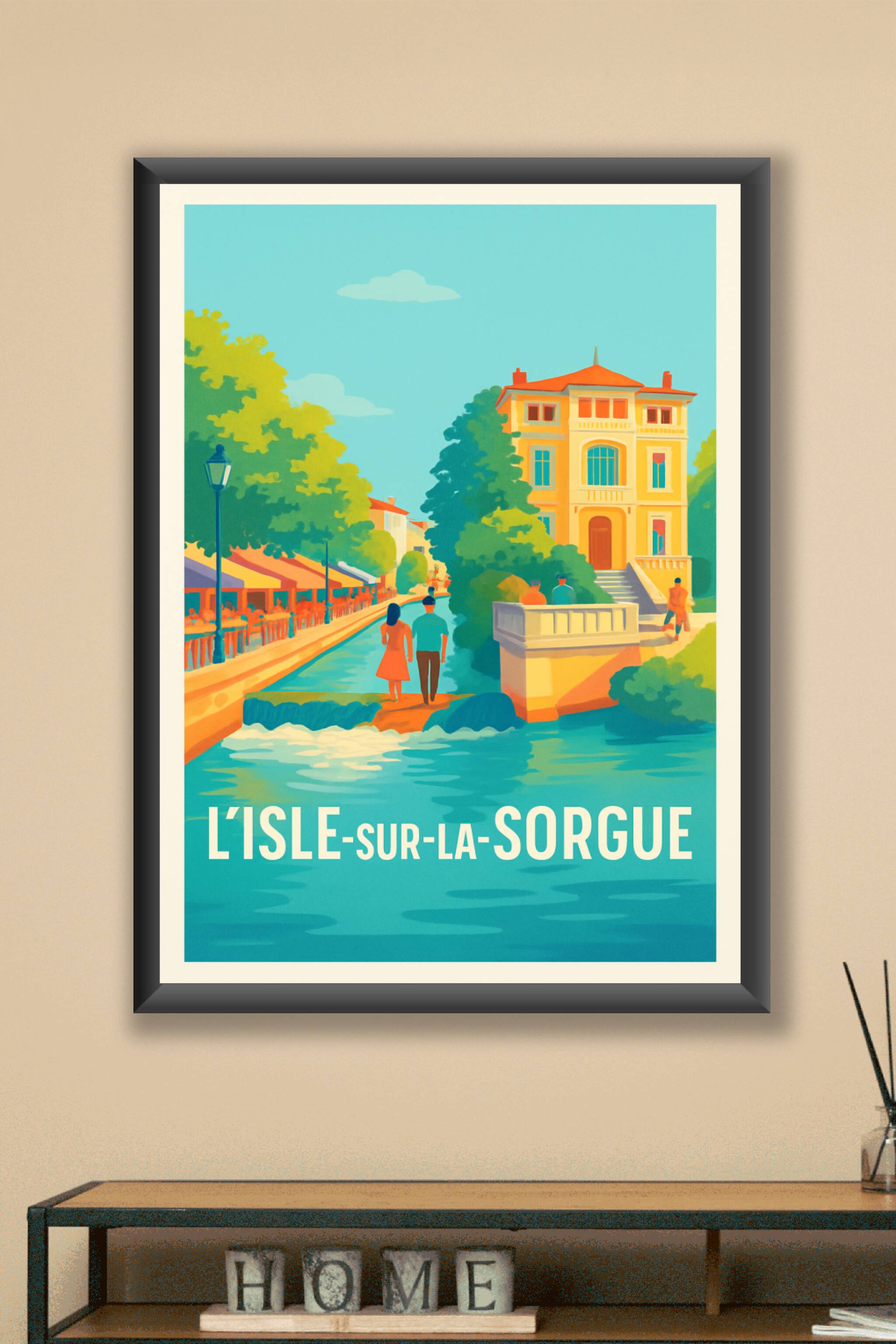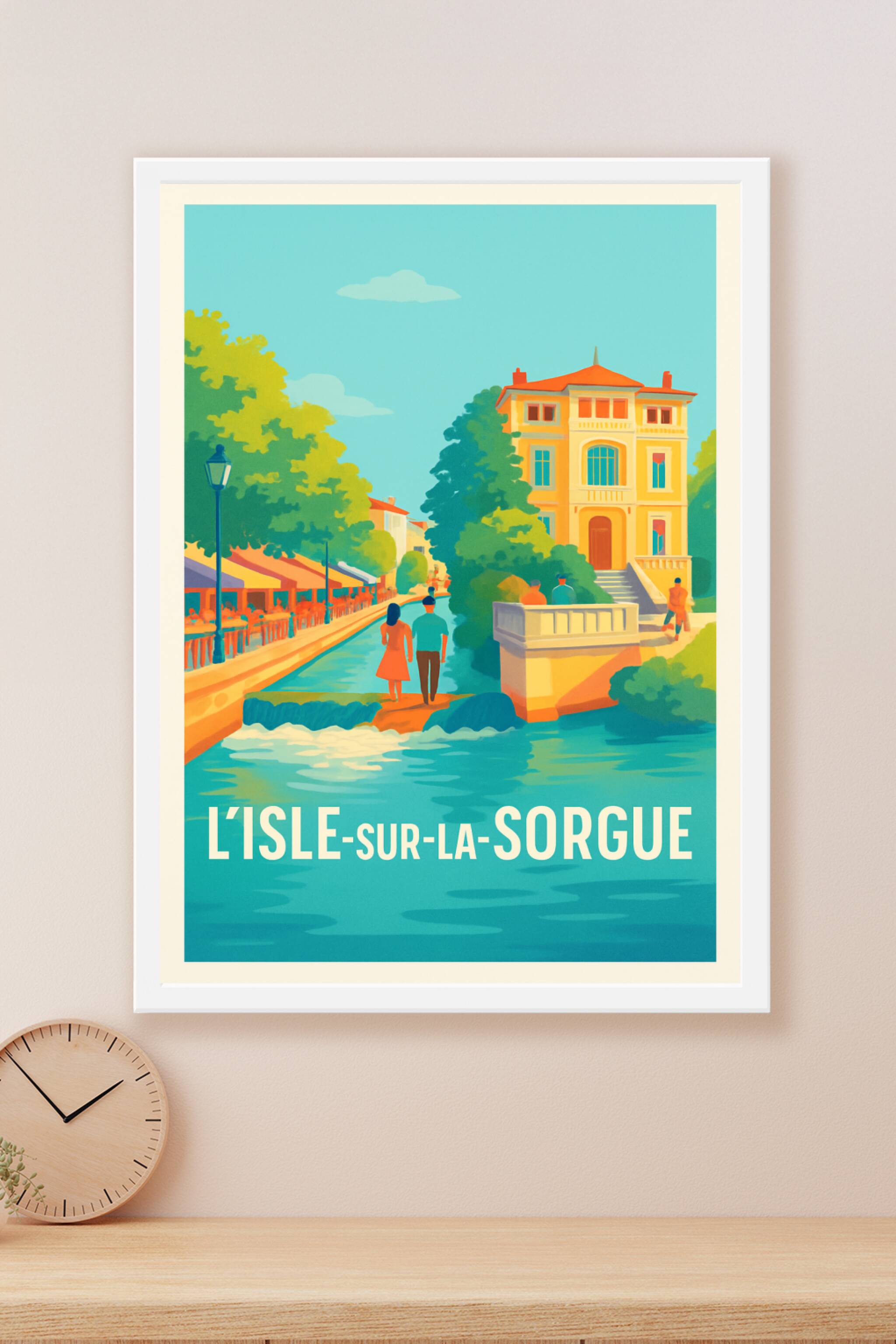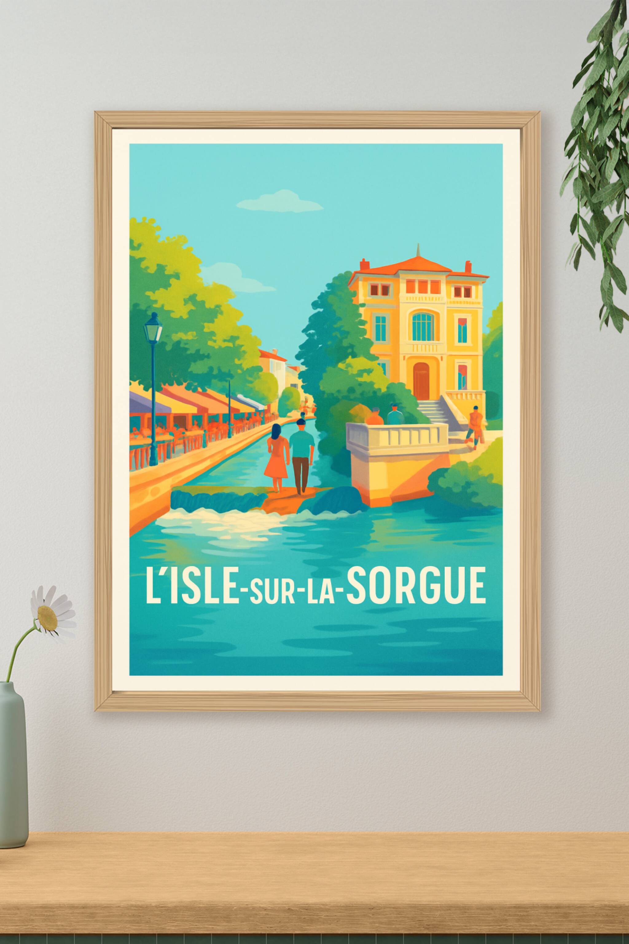 Découvrez la douceur de vivre à L'Isle-sur-la-Sorgue avec cette affiche au style rétro et coloré, qui met en scène ses célèbres canaux bordés de ma...