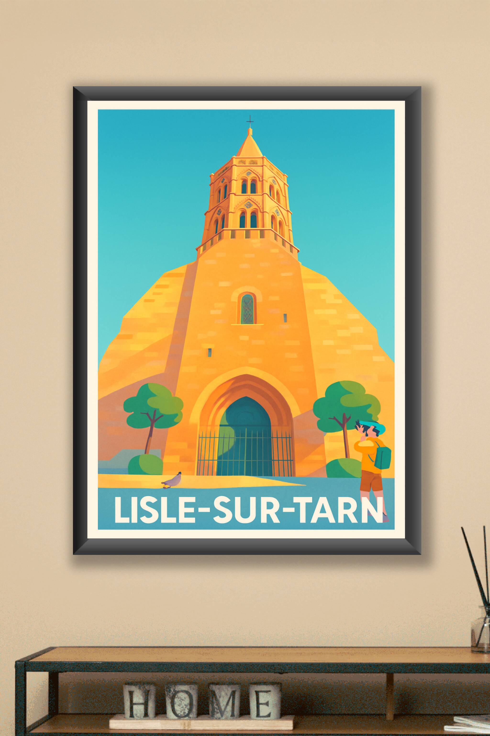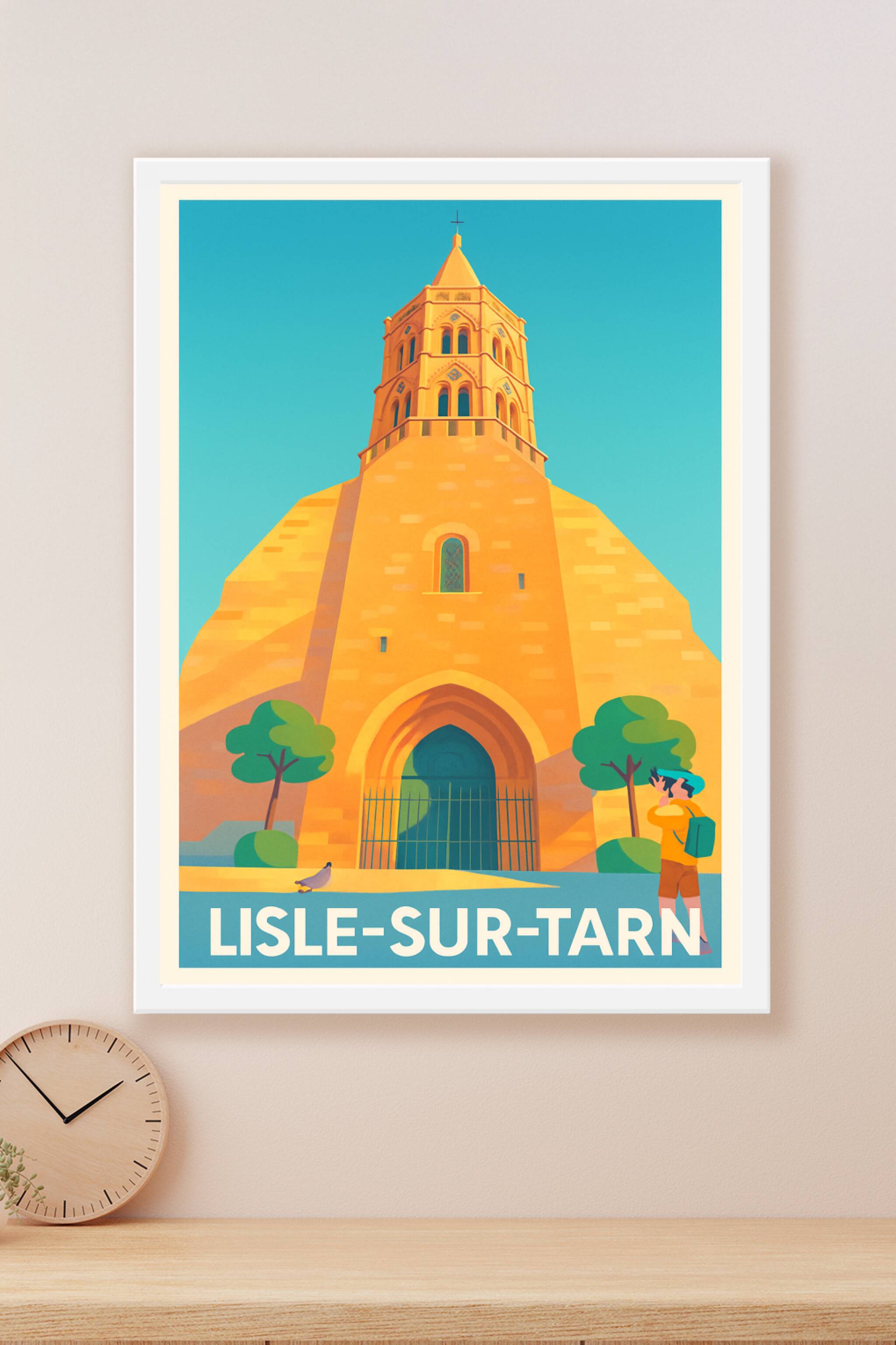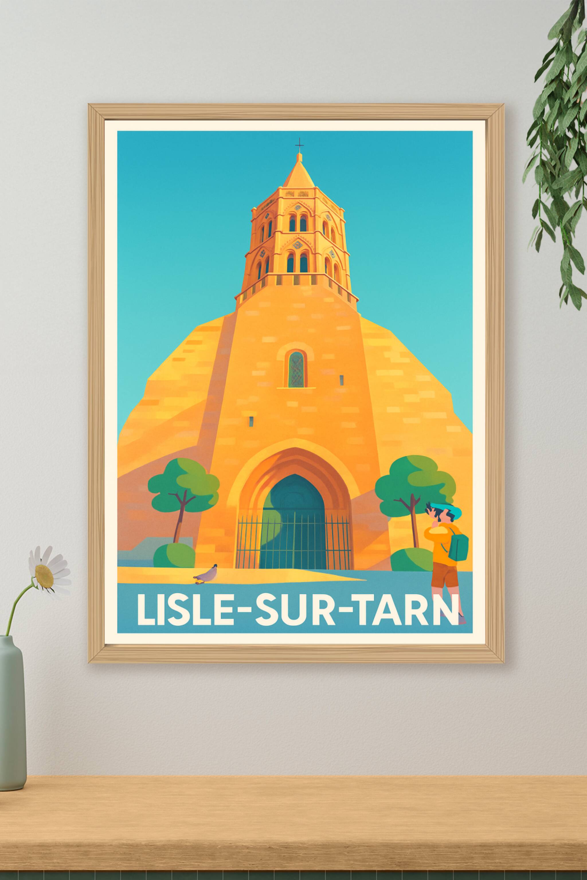 Découvrez la beauté architecturale de Lisle-sur-Tarn avec cette affiche illustrée, mettant en avant l'imposante silhouette de son clocher sous un c...