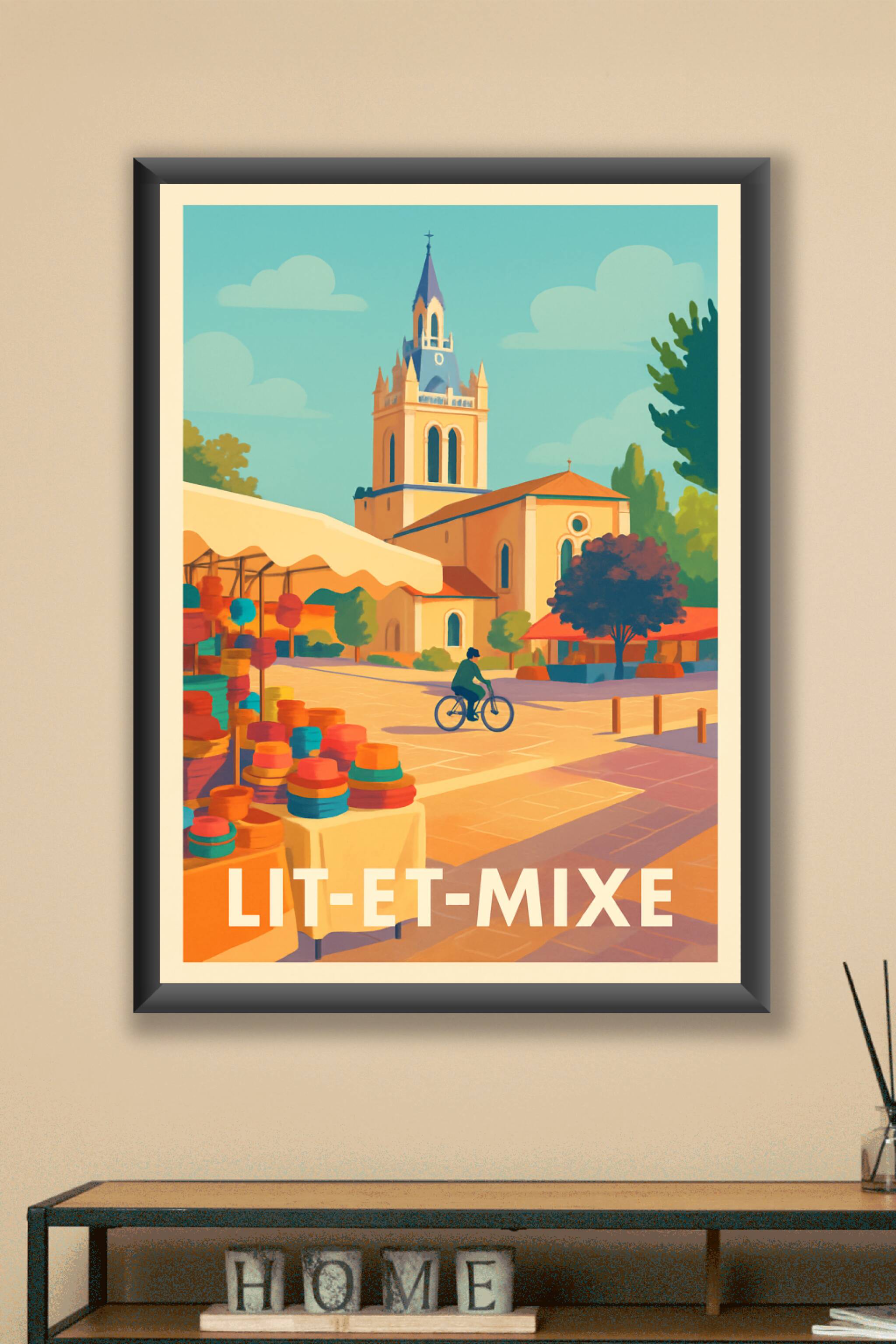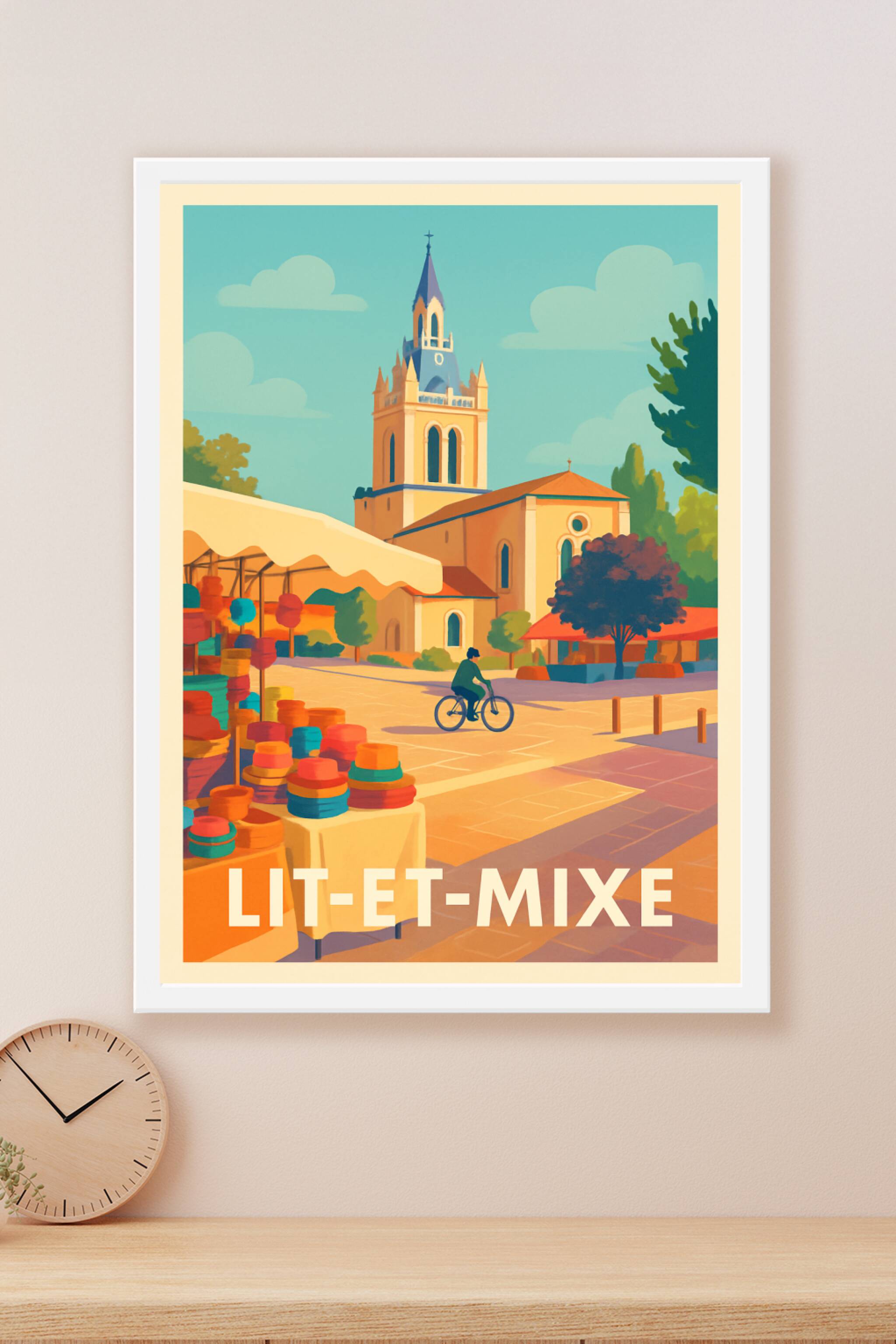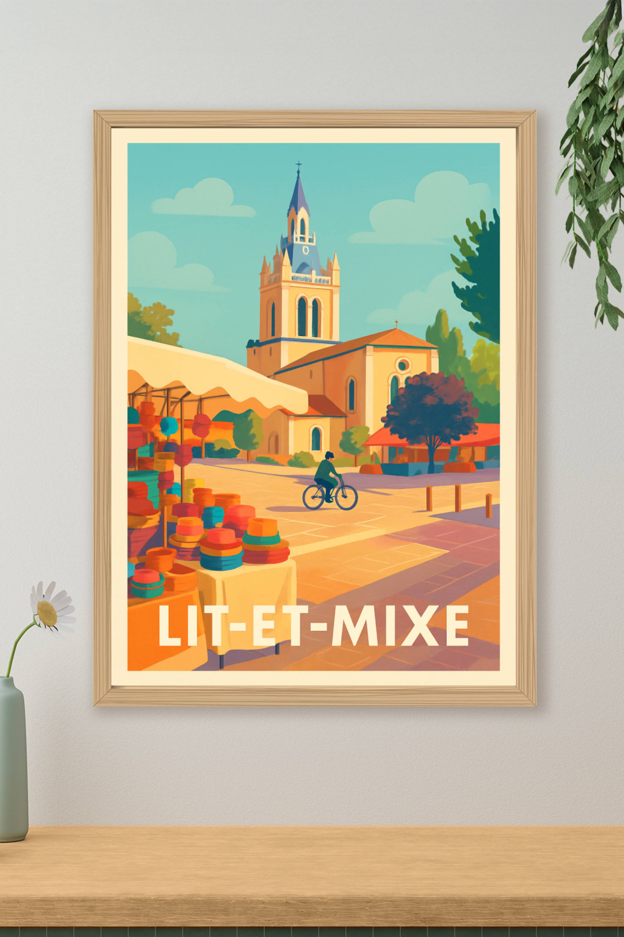Découvrez l'atmosphère apaisante et colorée de Lit-et-Mixe à travers cette affiche illustrée qui capture la douceur de vie locale, entre son marché...